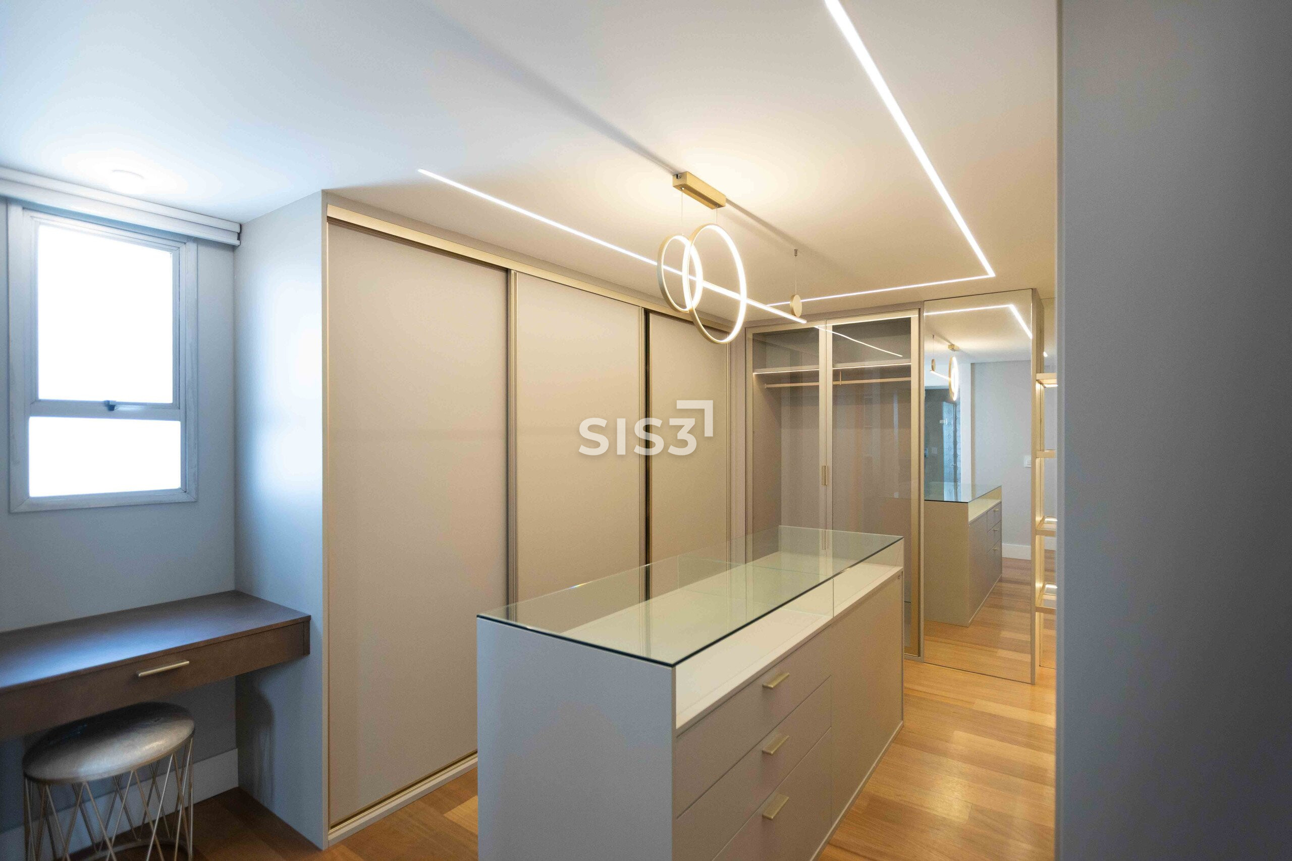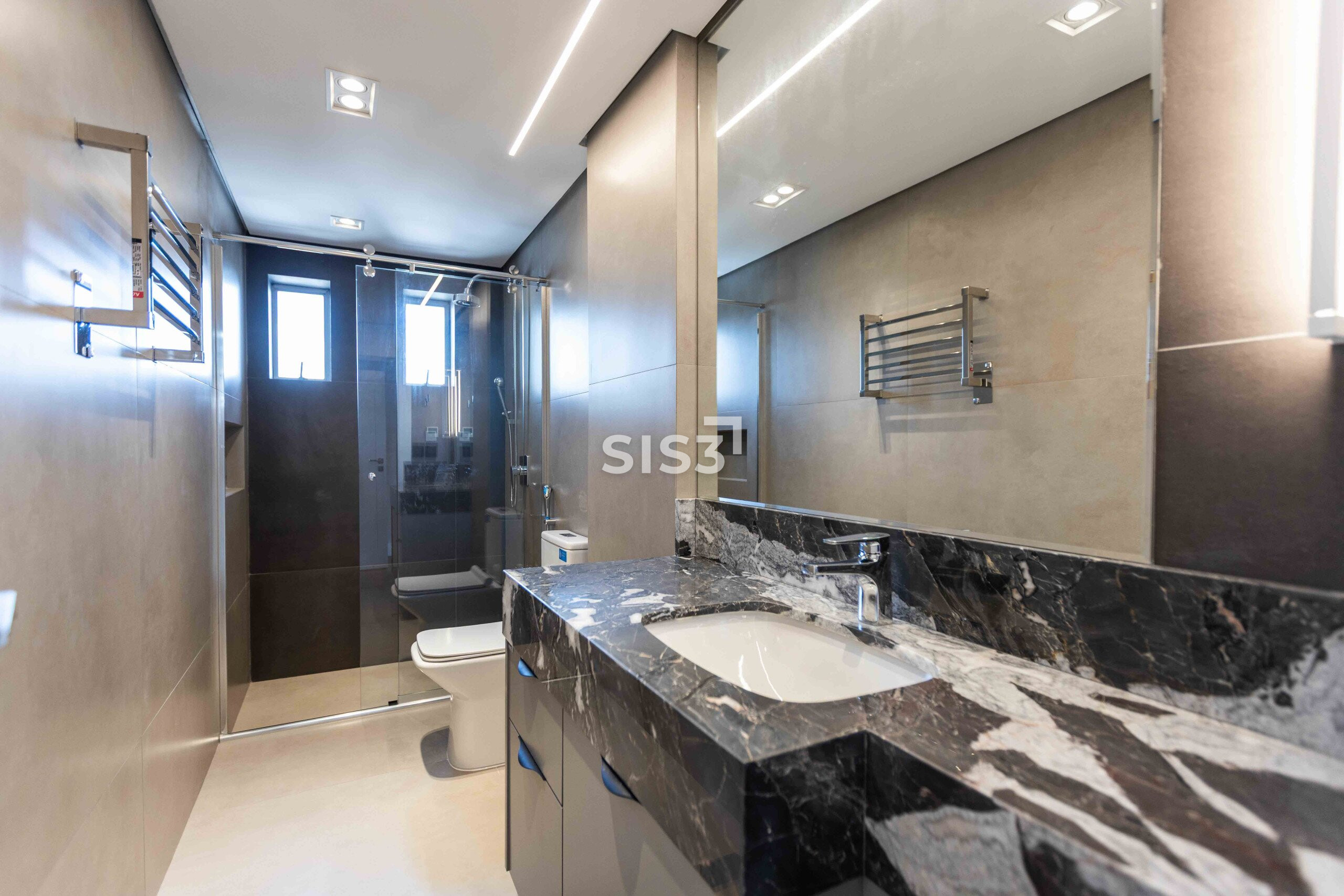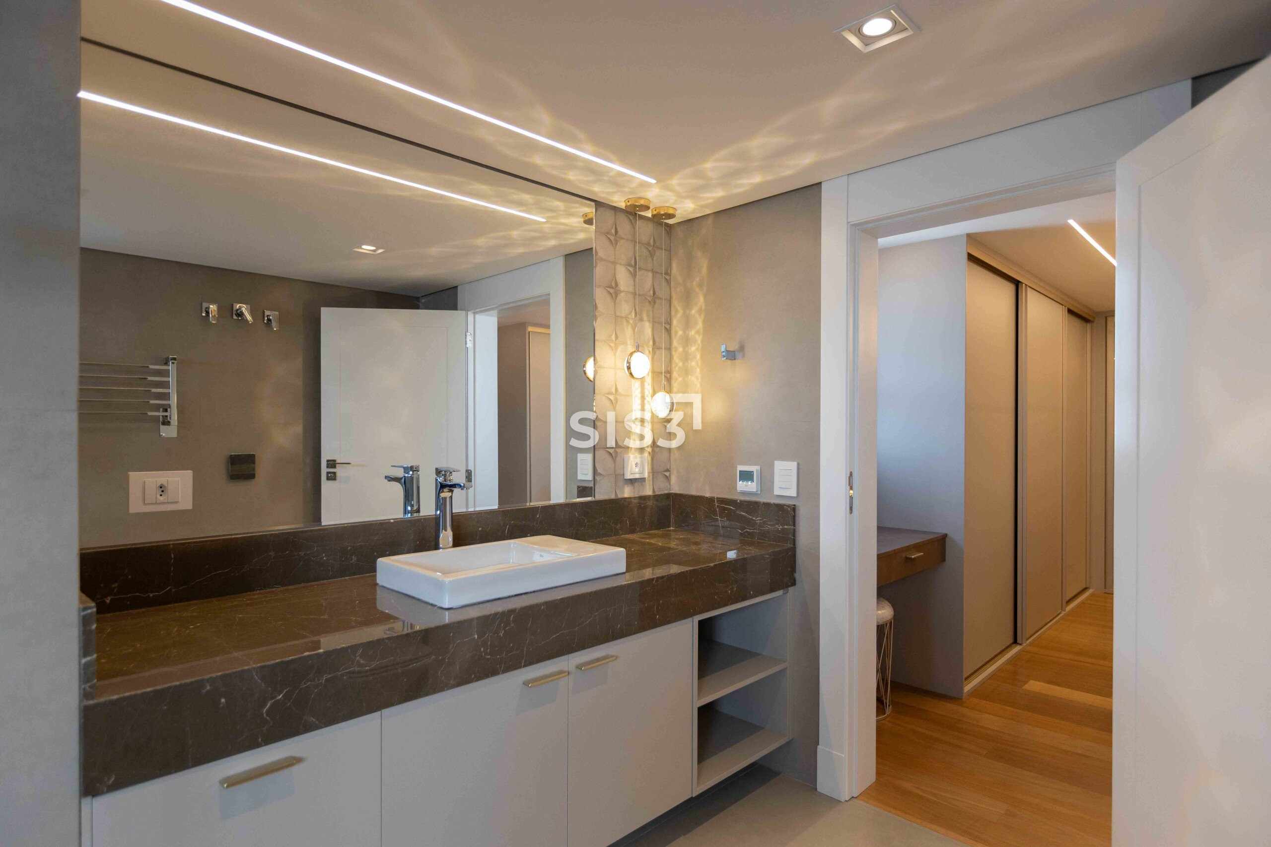 Na área íntima, 4 suítes amplas. Todas com piso aquecido nas áreas úmidas e toalheiros elétricos. A suíte master traz um closet bem dimensionado e banheiro Sr. e Sra., com uma configuração prática e bem resolvida.