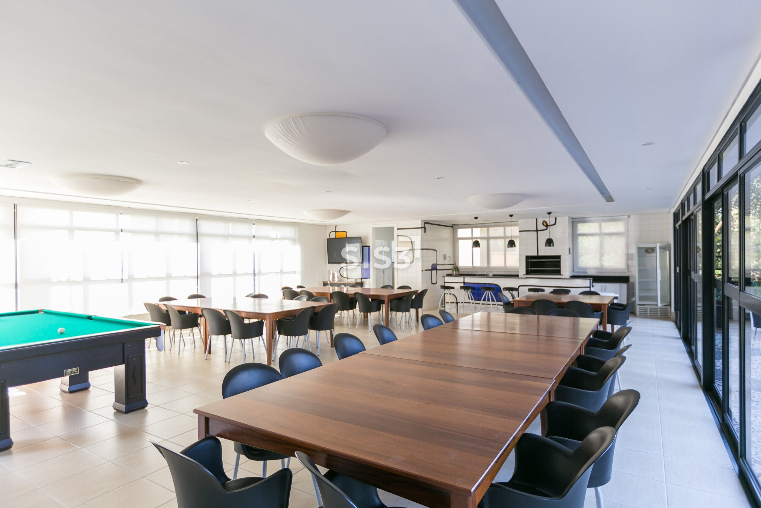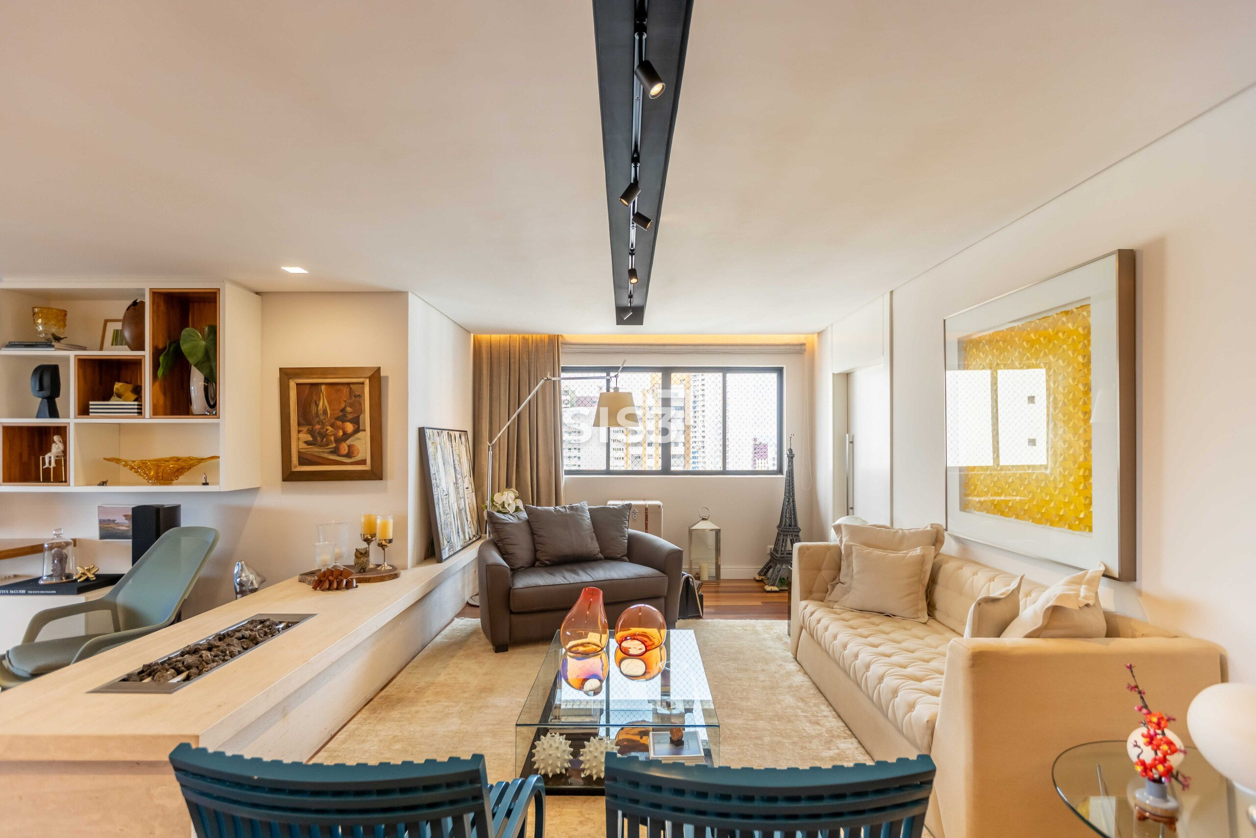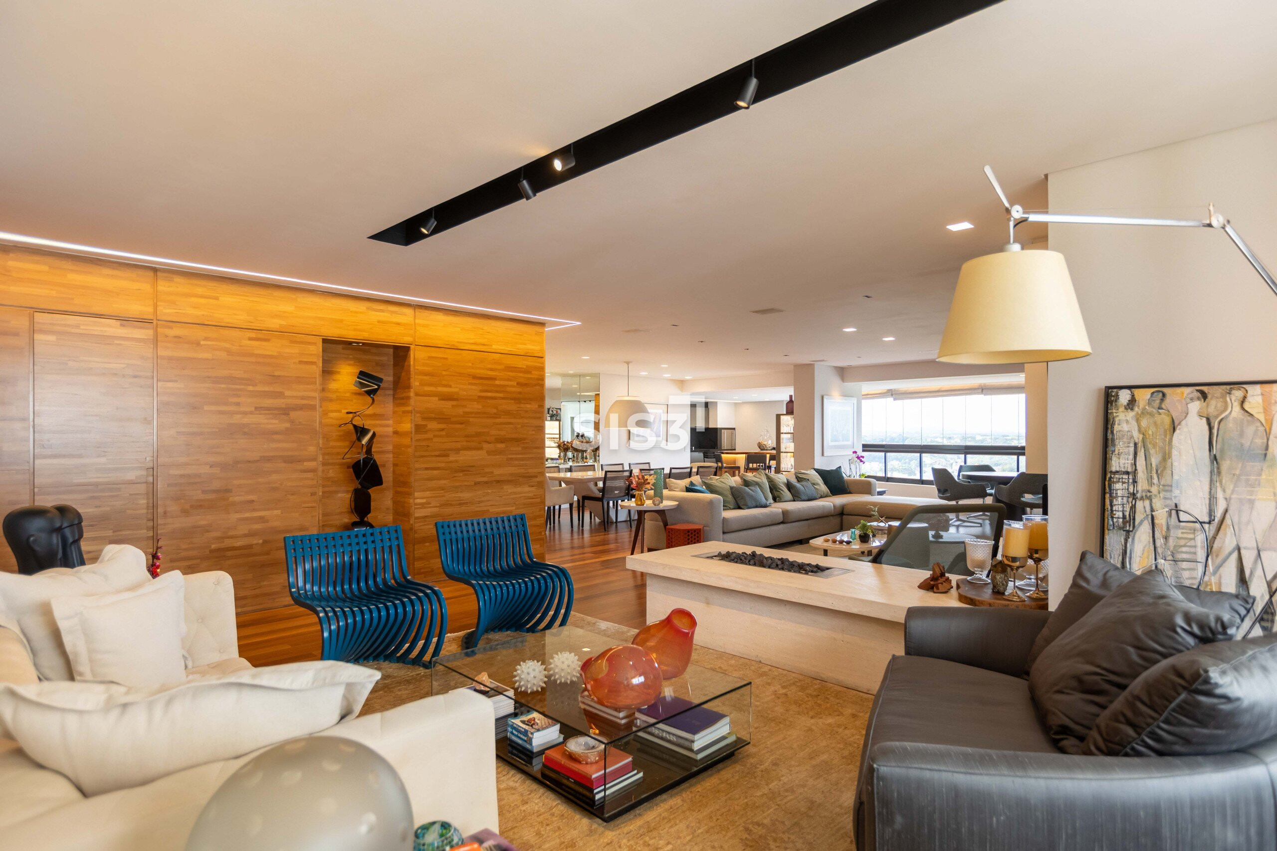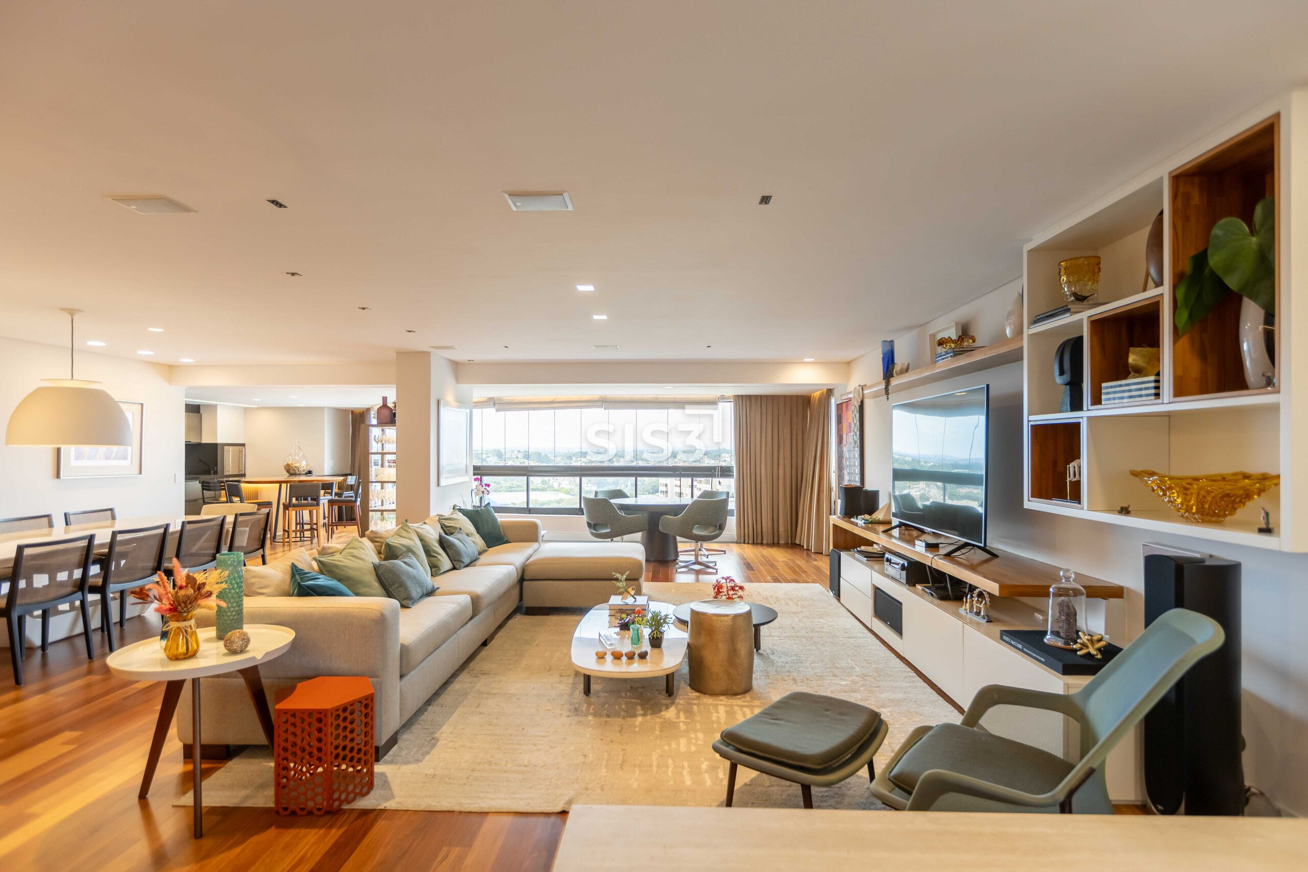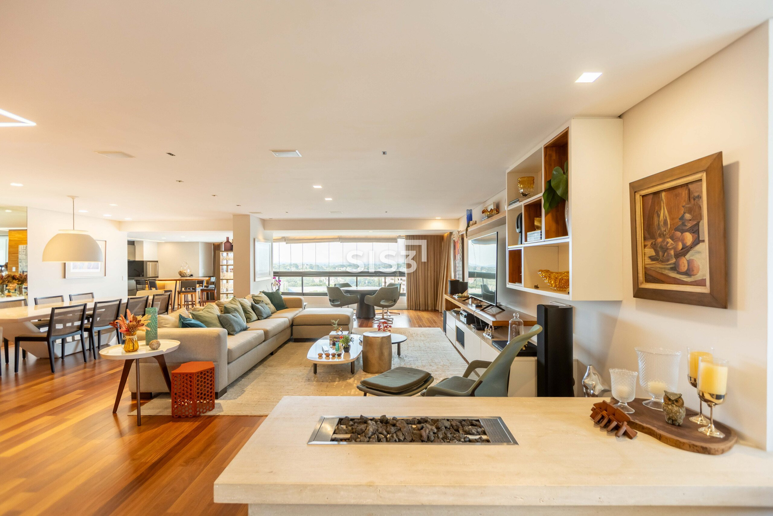 A planta é bem resolvida, com uma transição fluida entre área social e íntima. As salas se conectam e se estendem até a varanda e o espaço gourmet com churrasqueira a carvão. A lareira a gás marca o estar principal, enquanto portas em estilo painéis permitem integrar ou resguardar os ambientes com naturalidade.