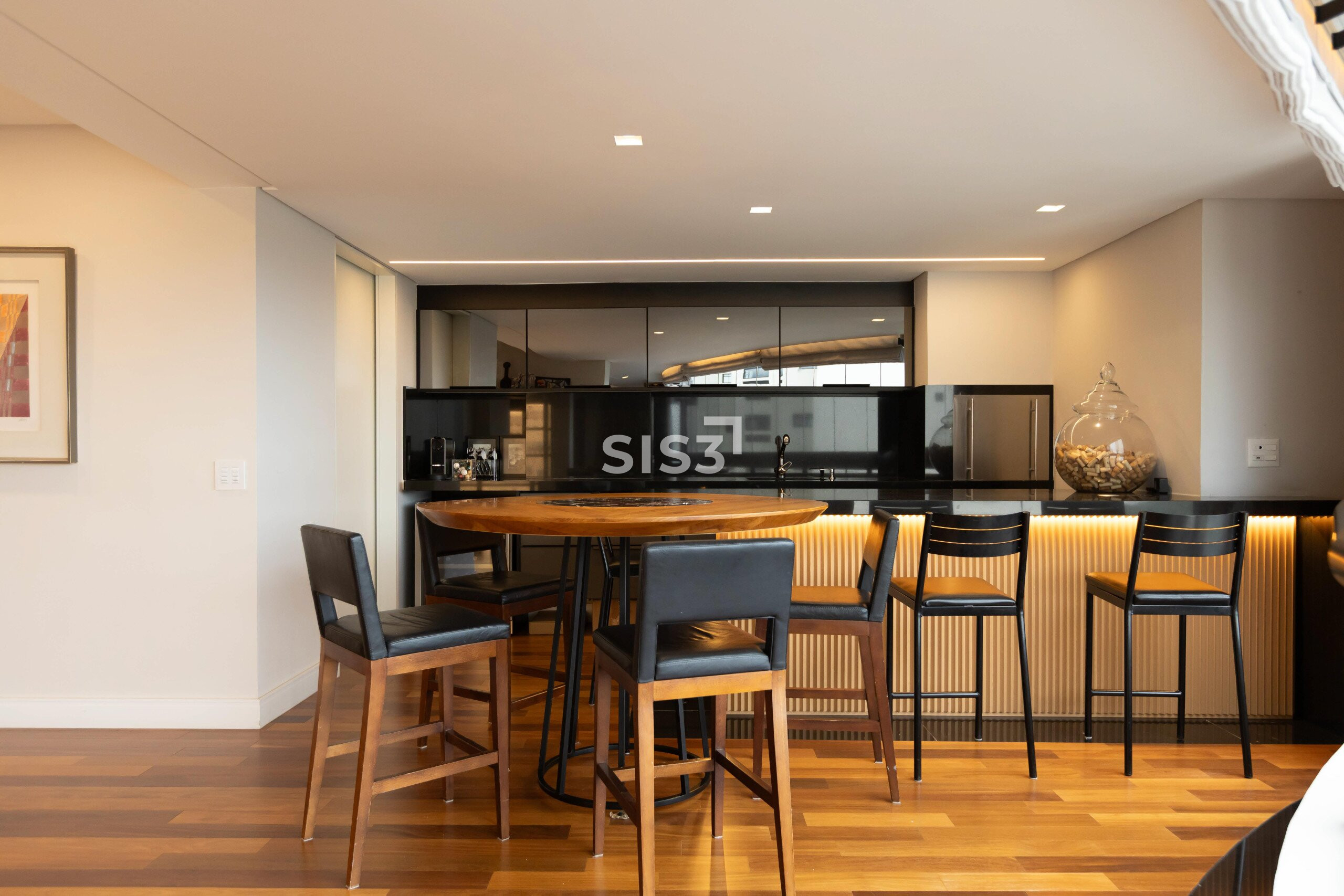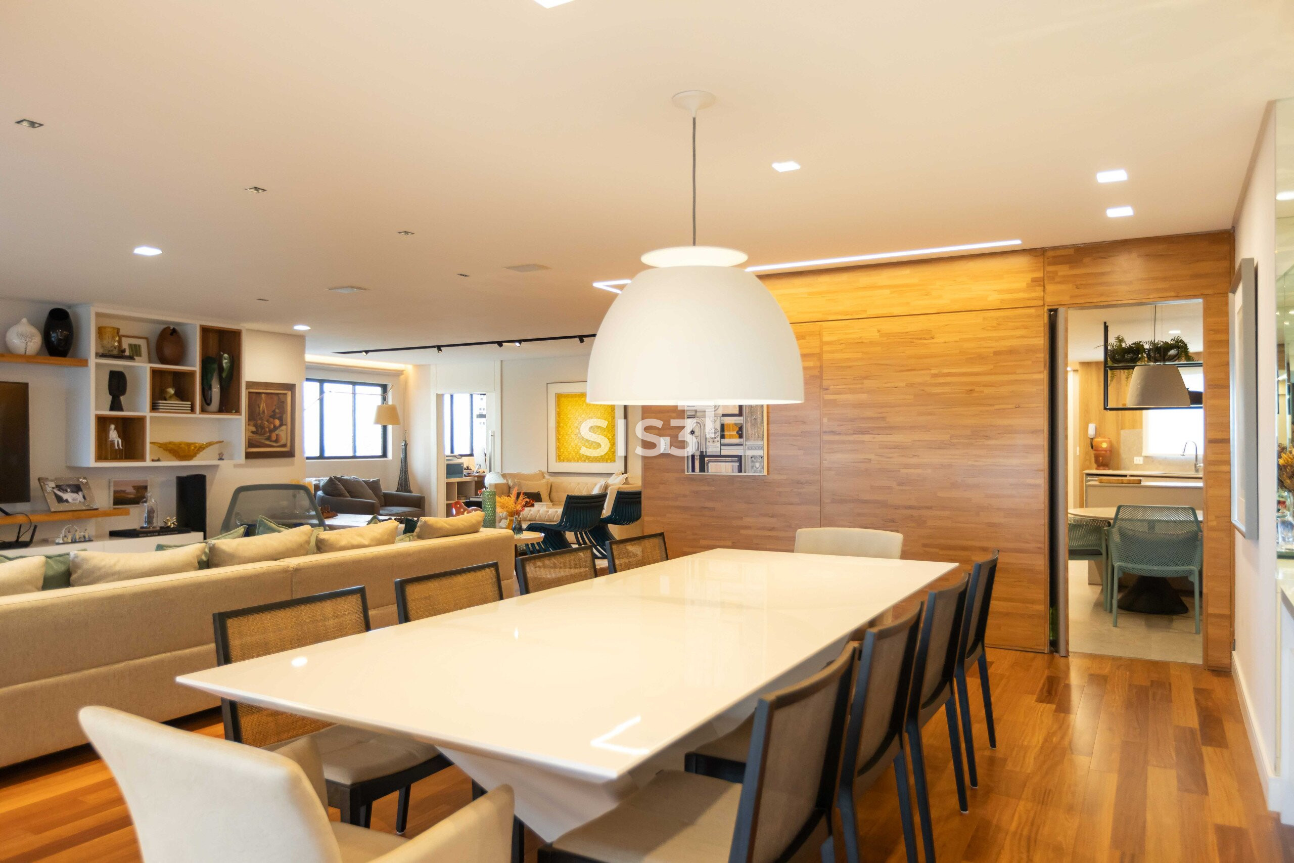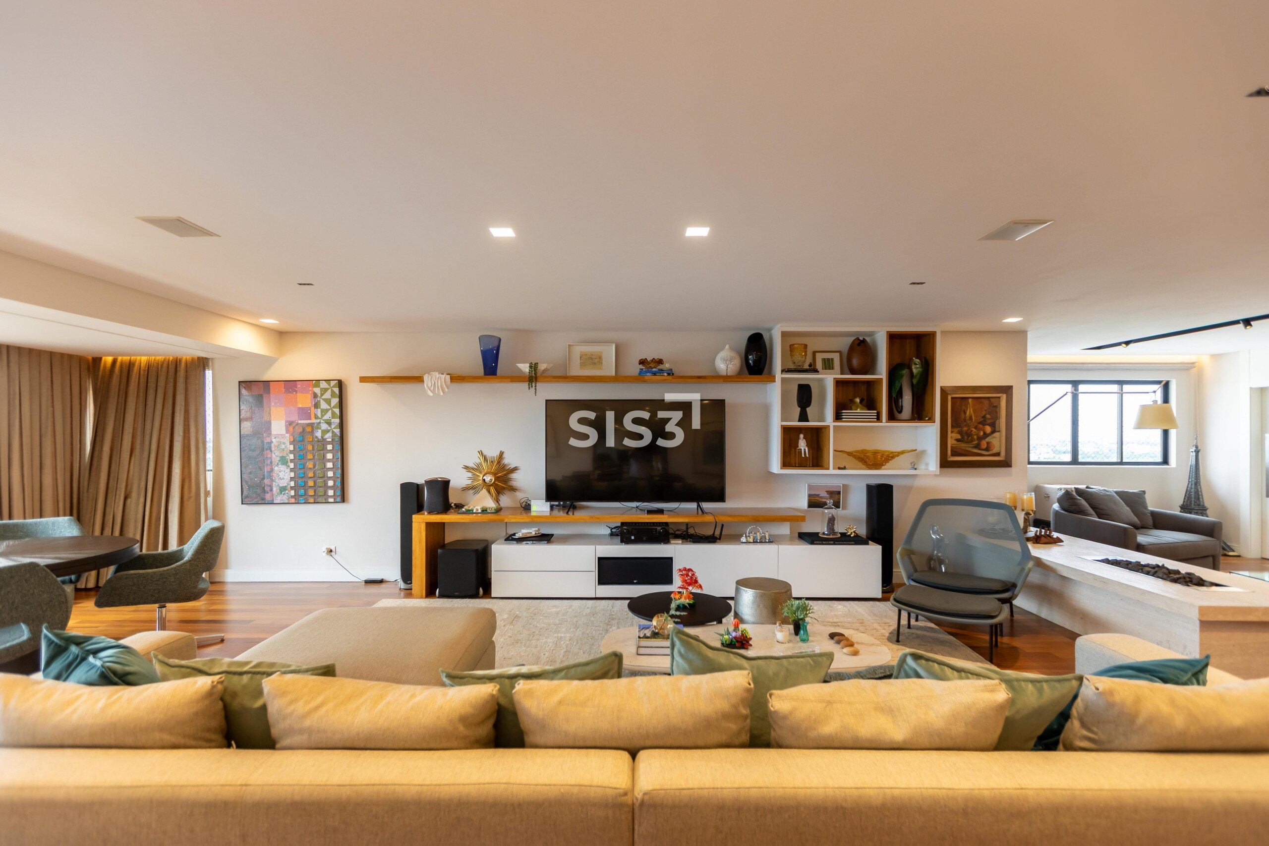 O projeto de interiores assinado por Carla Mattioli valoriza materiais atemporais, com marcenaria bem desenhada, automação e piso em madeira engenheirada Indusparquet.