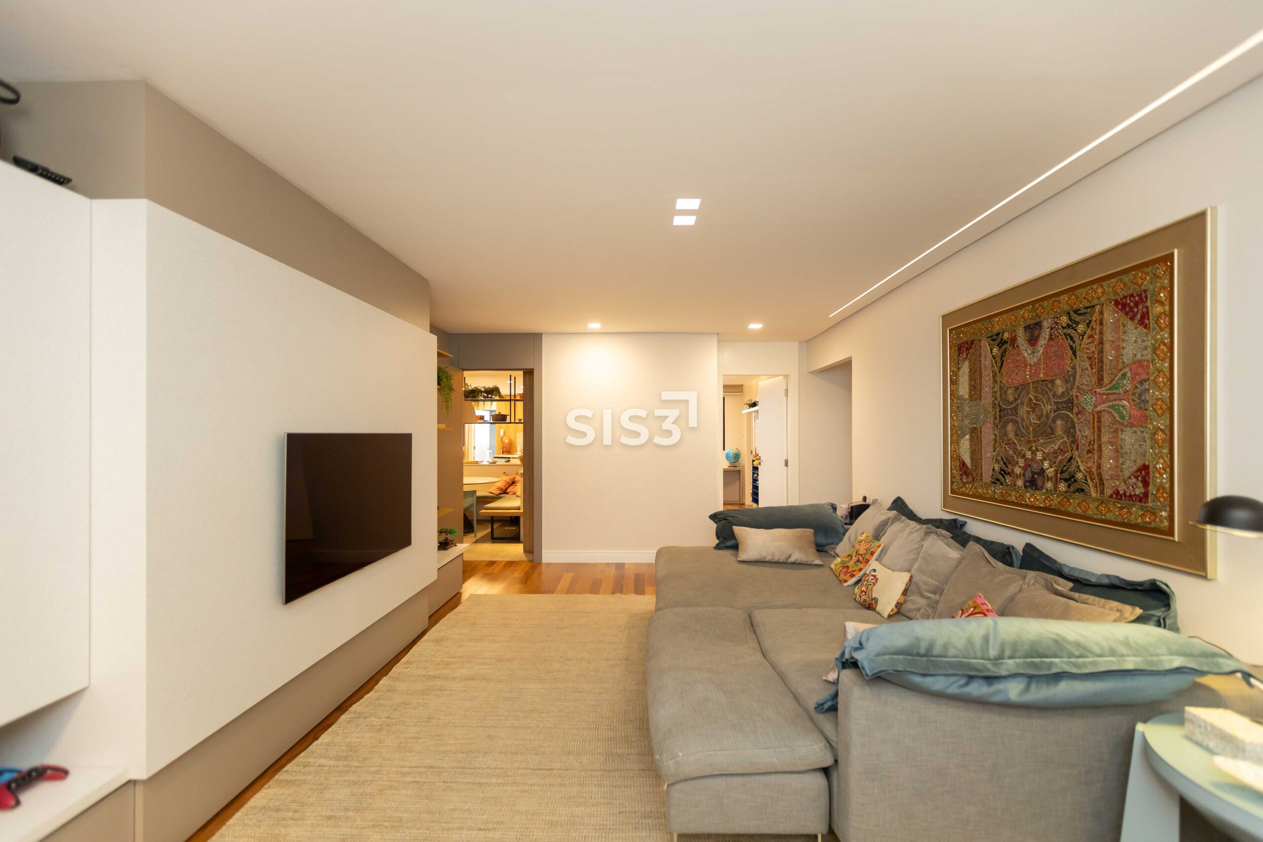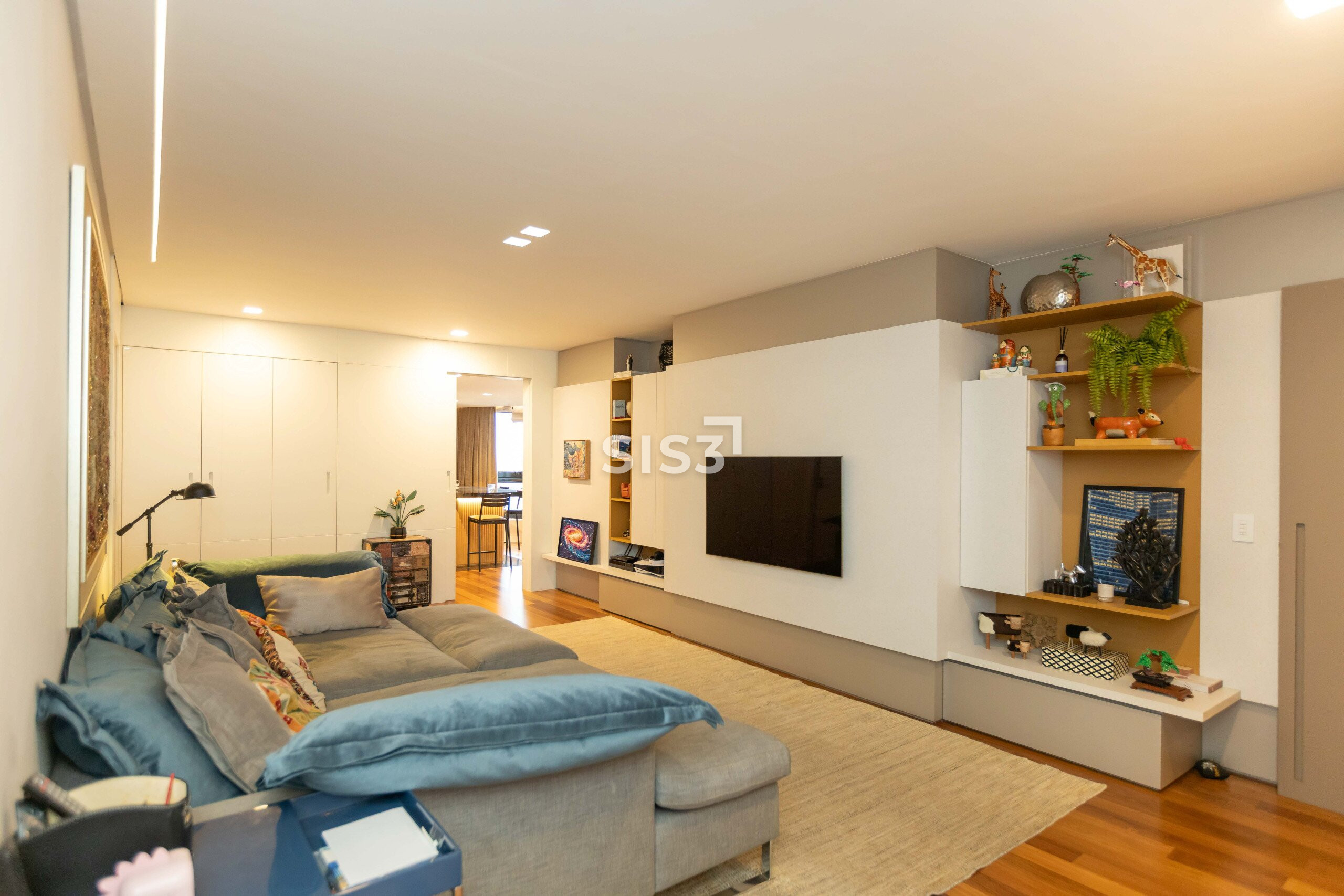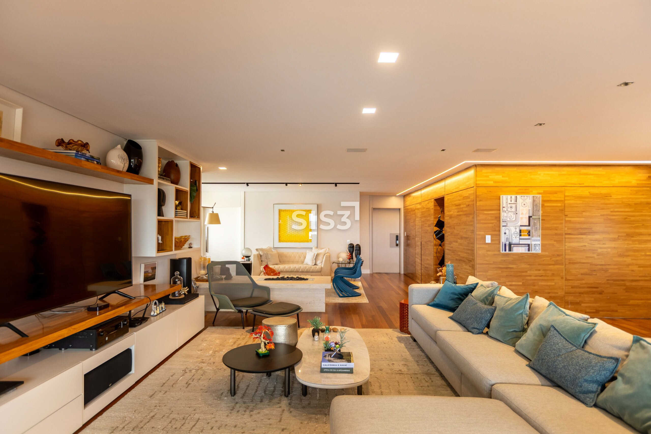 O projeto de interiores assinado por Carla Mattioli valoriza materiais atemporais, com marcenaria bem desenhada, automação e piso em madeira engenheirada Indusparquet.