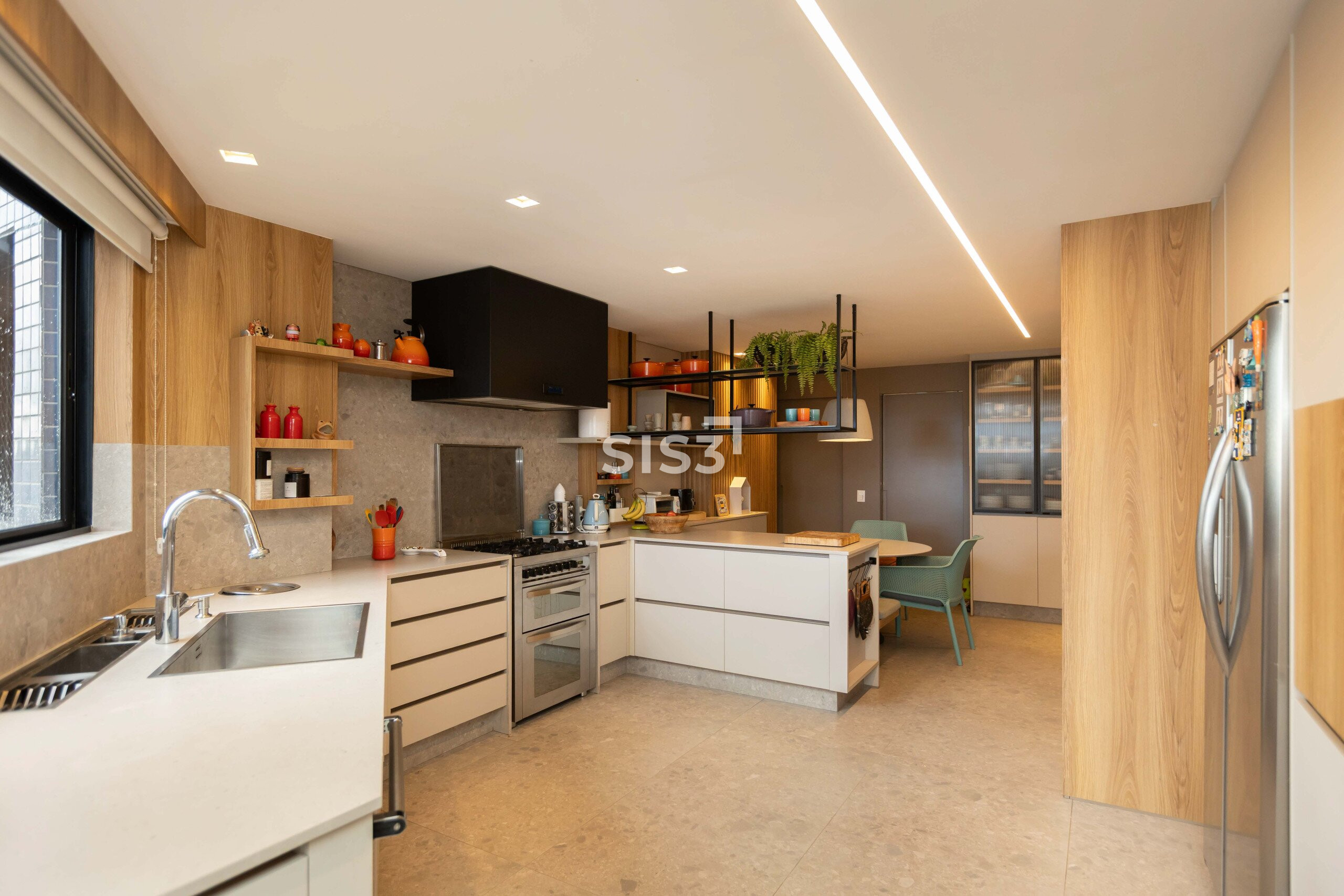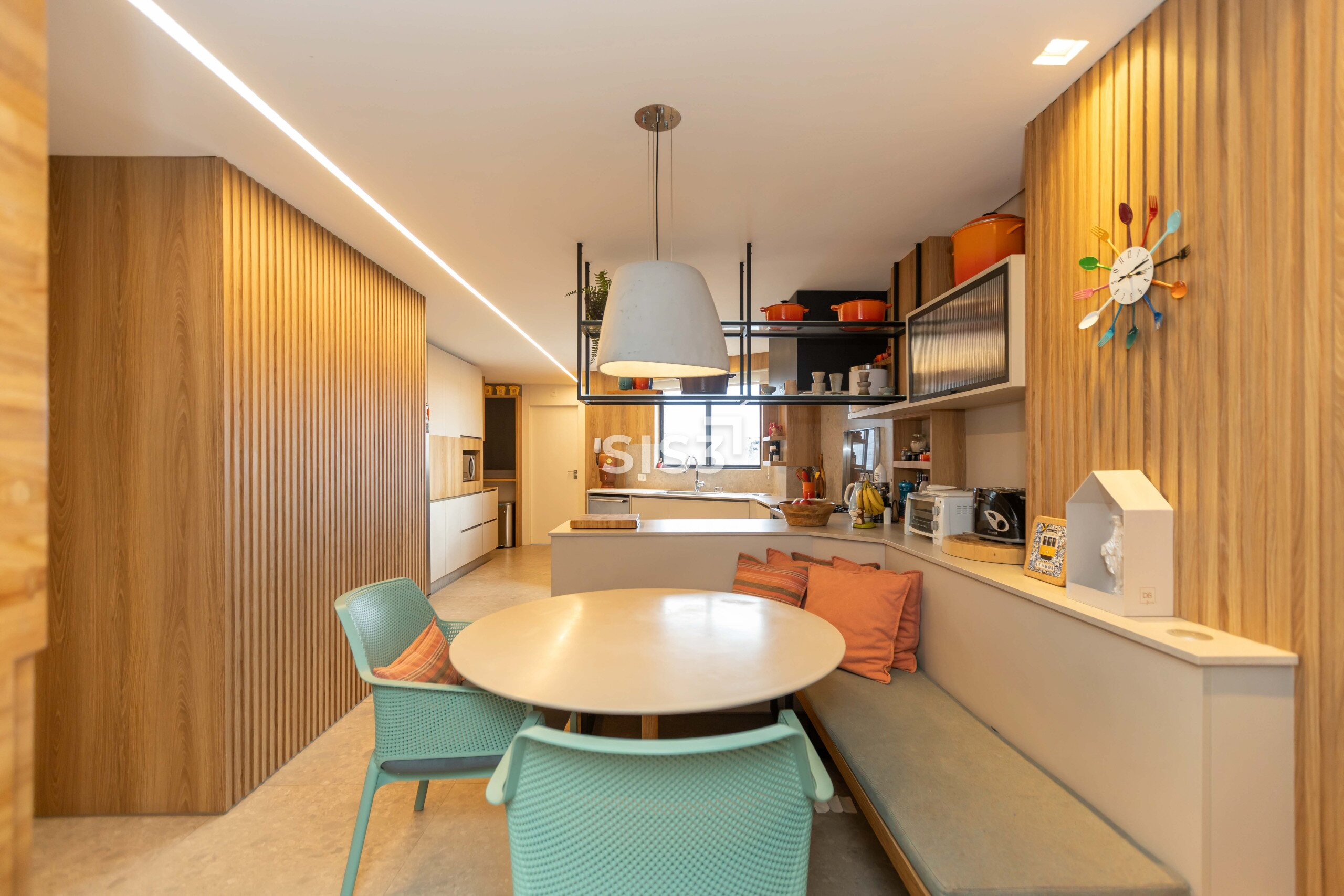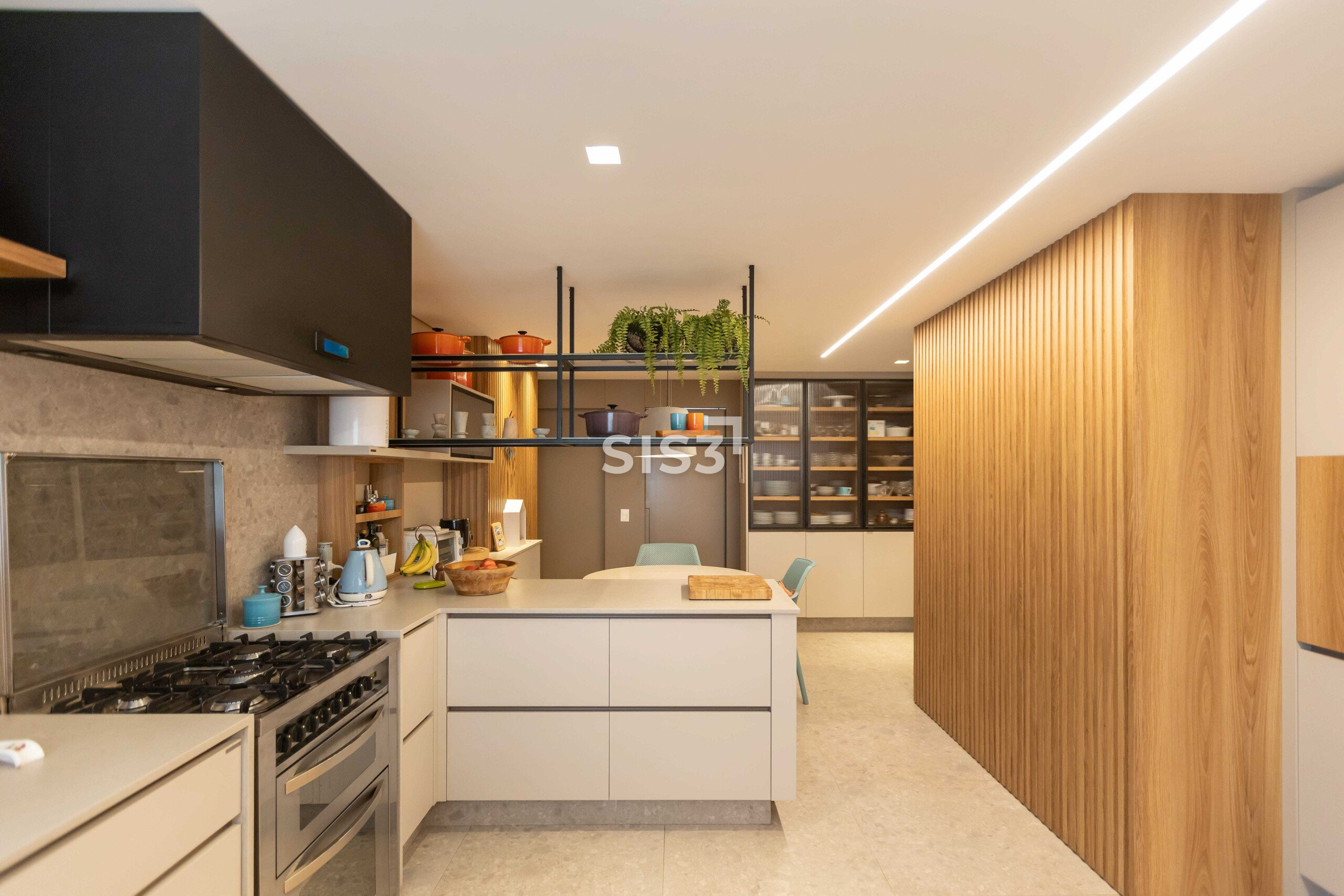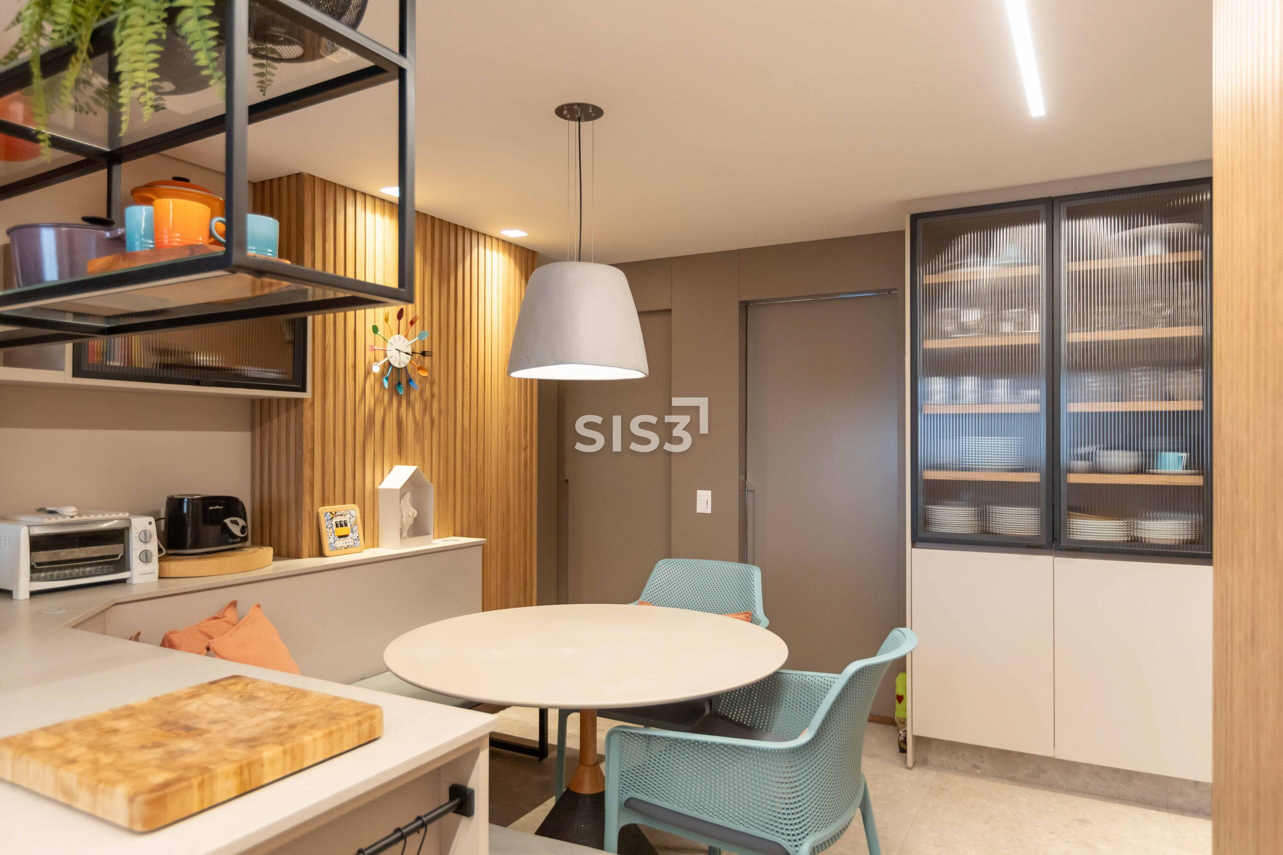 A cozinha merece um capítulo à parte. Ampla, fechada e muito bem executada, traz painéis em madeira que aquecem o ambiente, tampo em Dekton e marcenaria com detalhes em vidro canelado, criando um jogo sutil de texturas e cores. O canto alemão completa o espaço com um convite permanente para o uso, daqueles lugares que funcionam tanto no dia a dia quanto para receber.