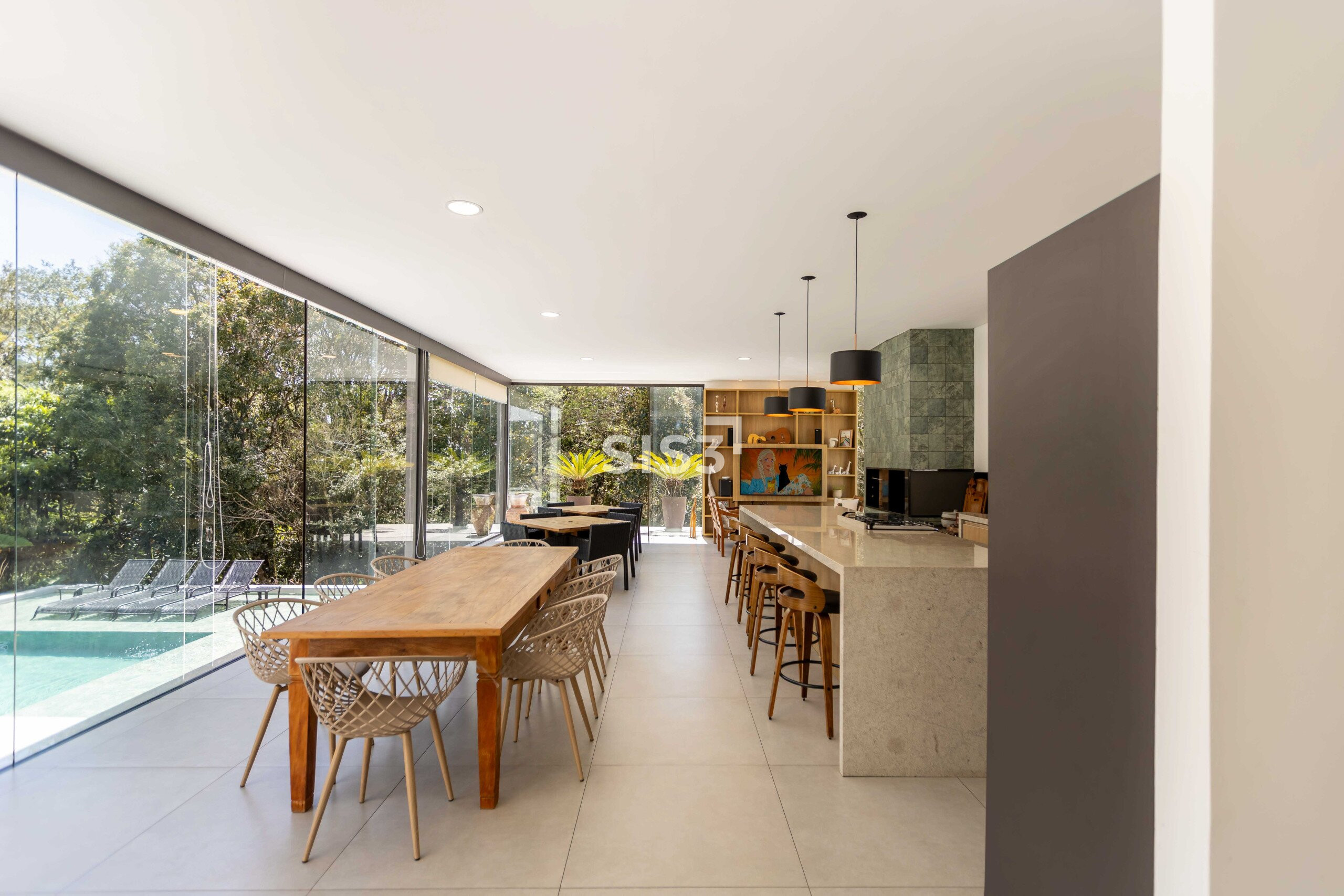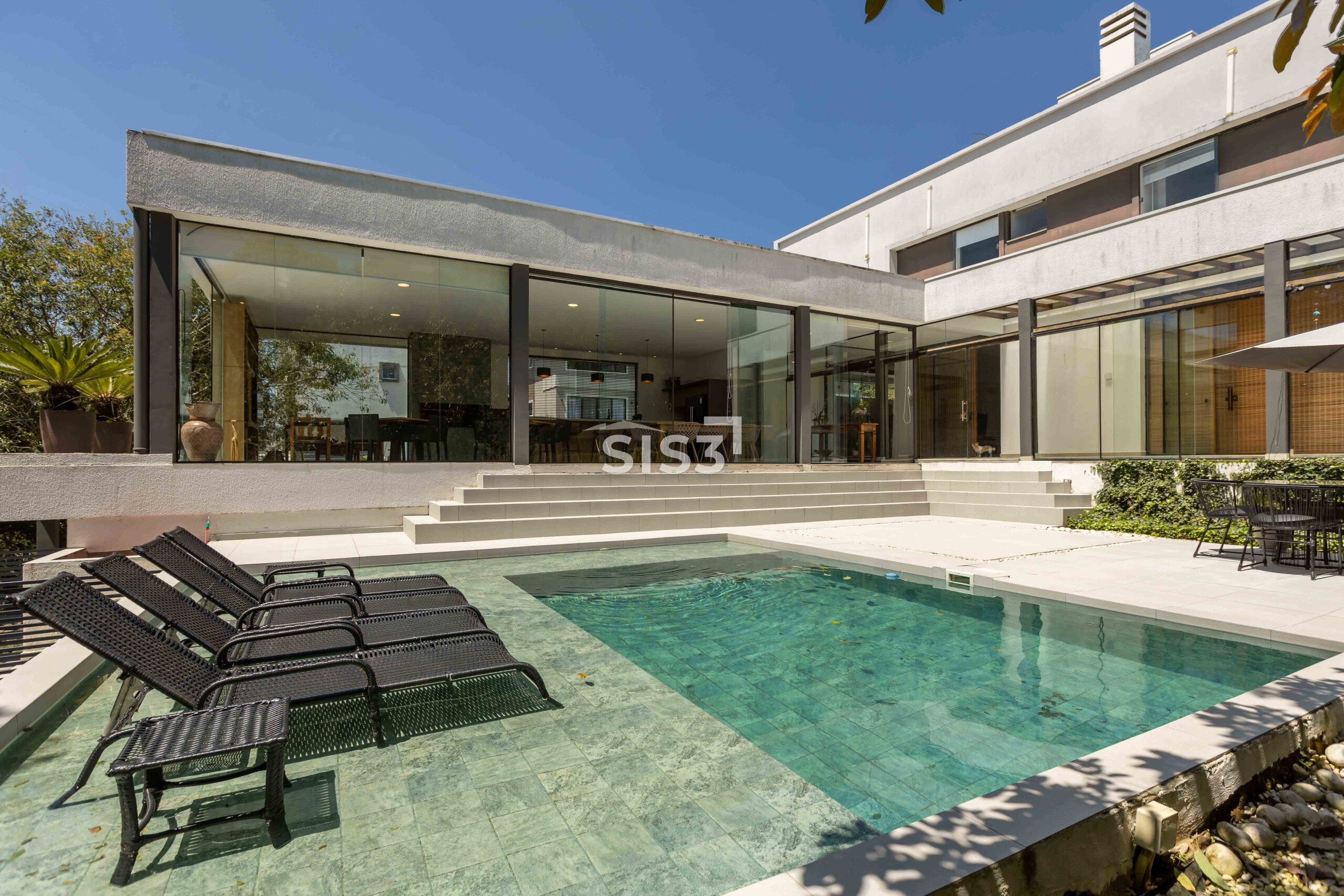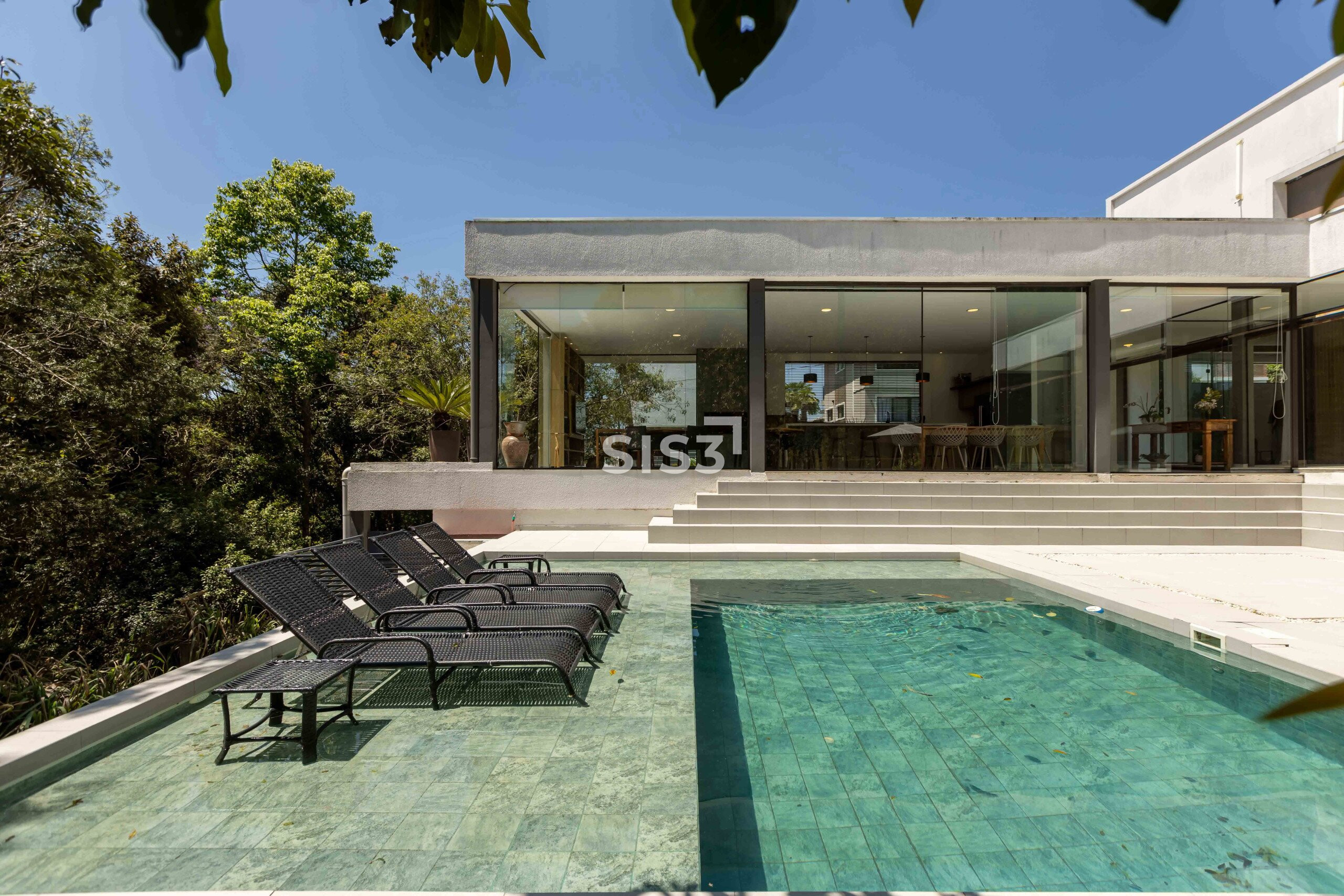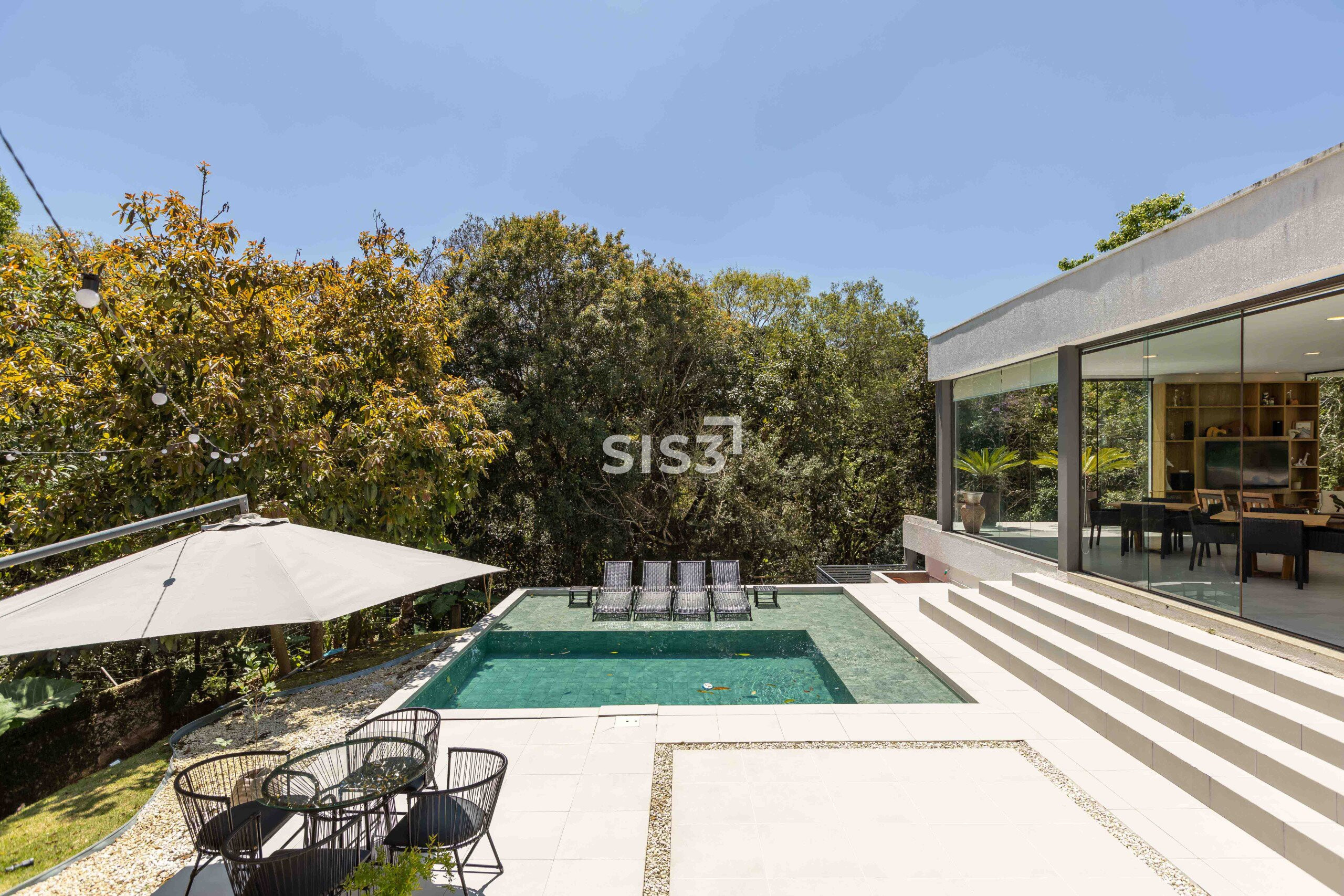 No térreo, os ambientes se abrem e se conectam. Sala, cozinha e área gourmet com churrasqueira formam um espaço contínuo, perfeito para reunir e aproveitar o tempo em casa. A piscina com aquecimento solar prolonga o uso da área externa ao longo do ano, enquanto o verde ao redor traz uma sensação constante de calma. A garagem coberta comporta até quatro carros.