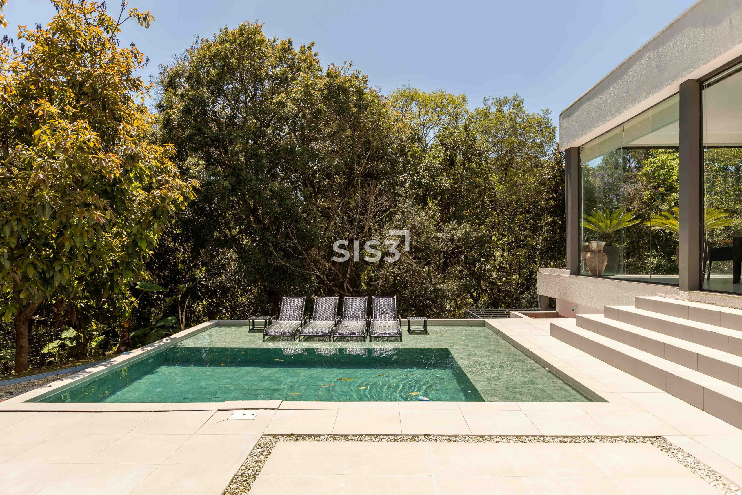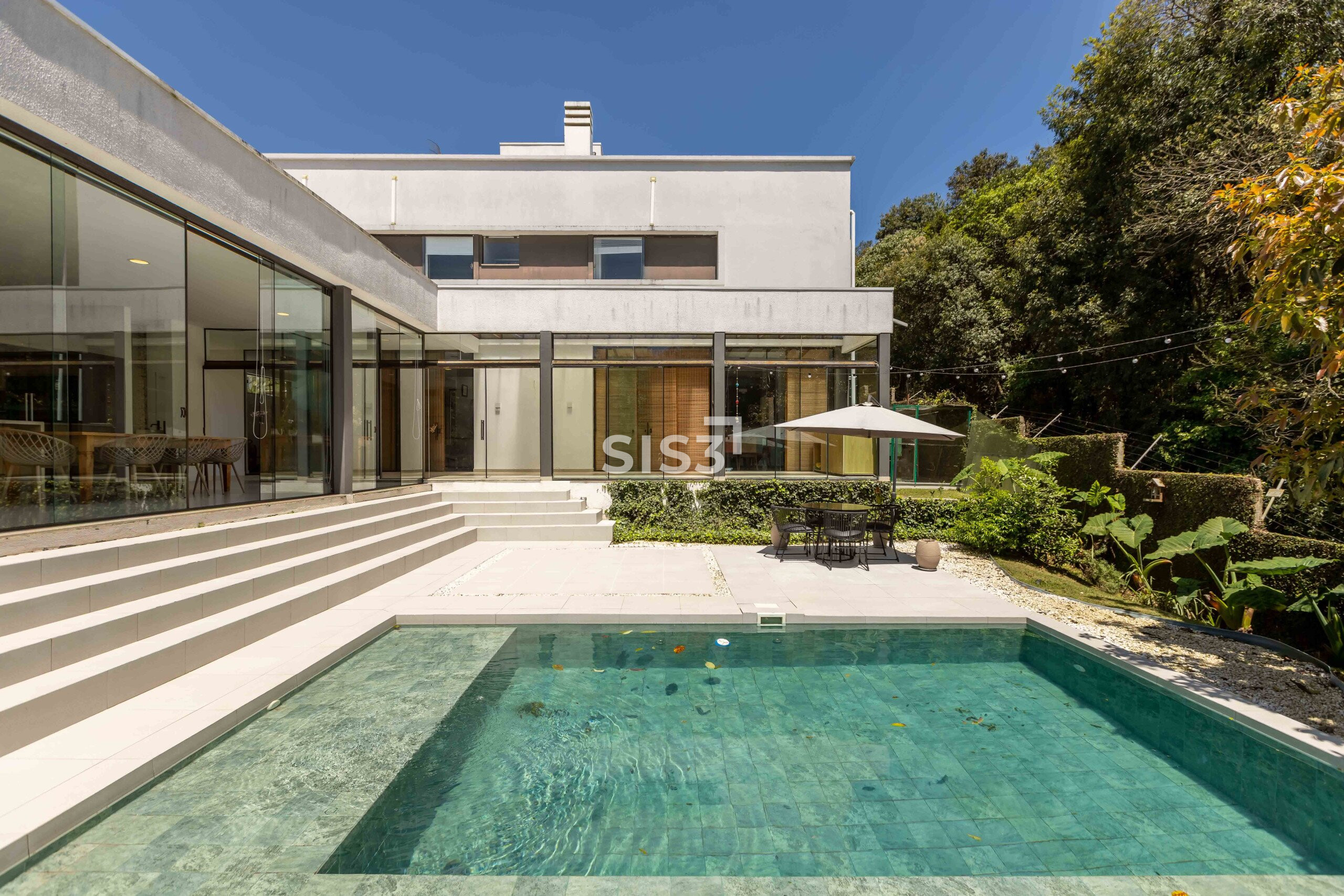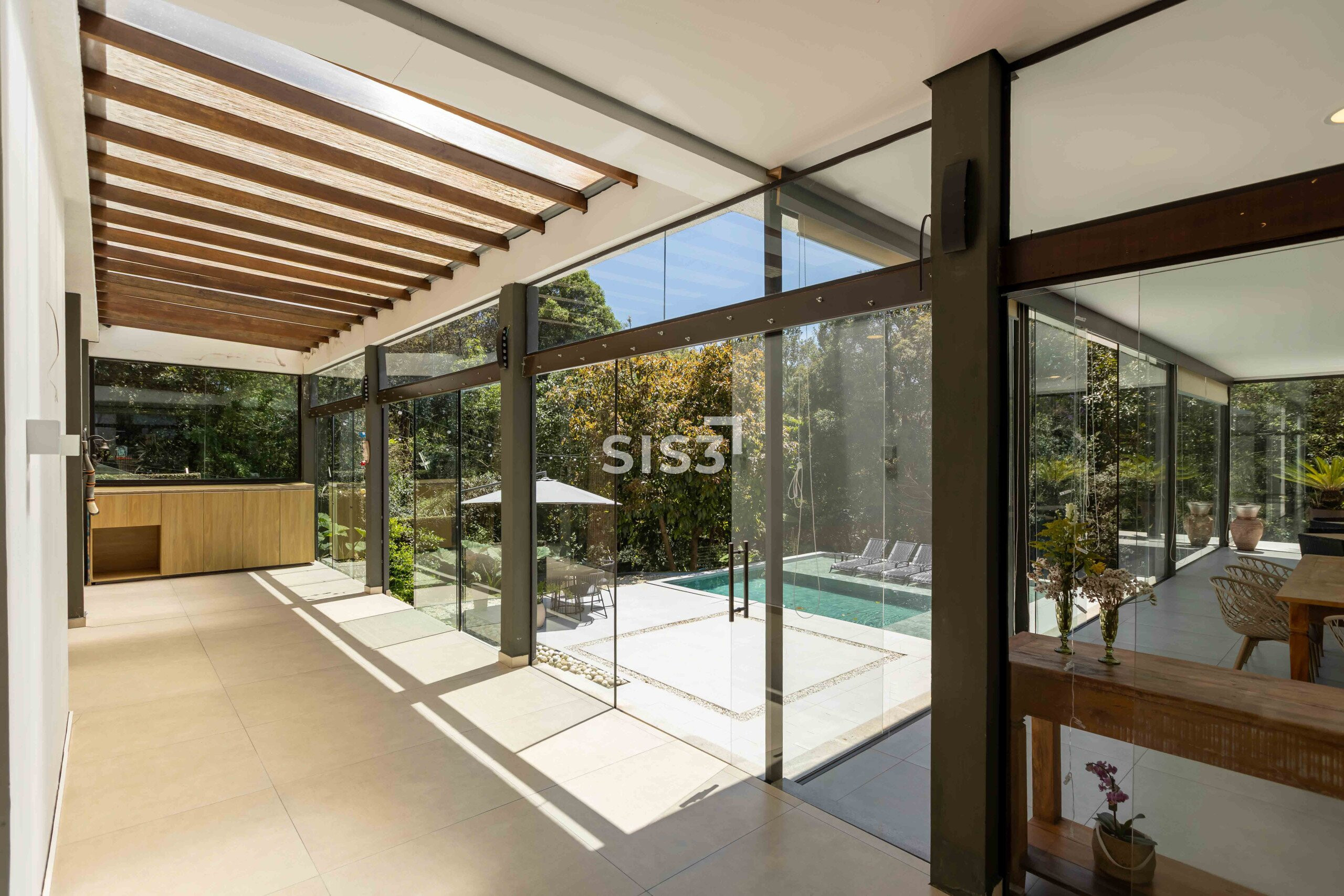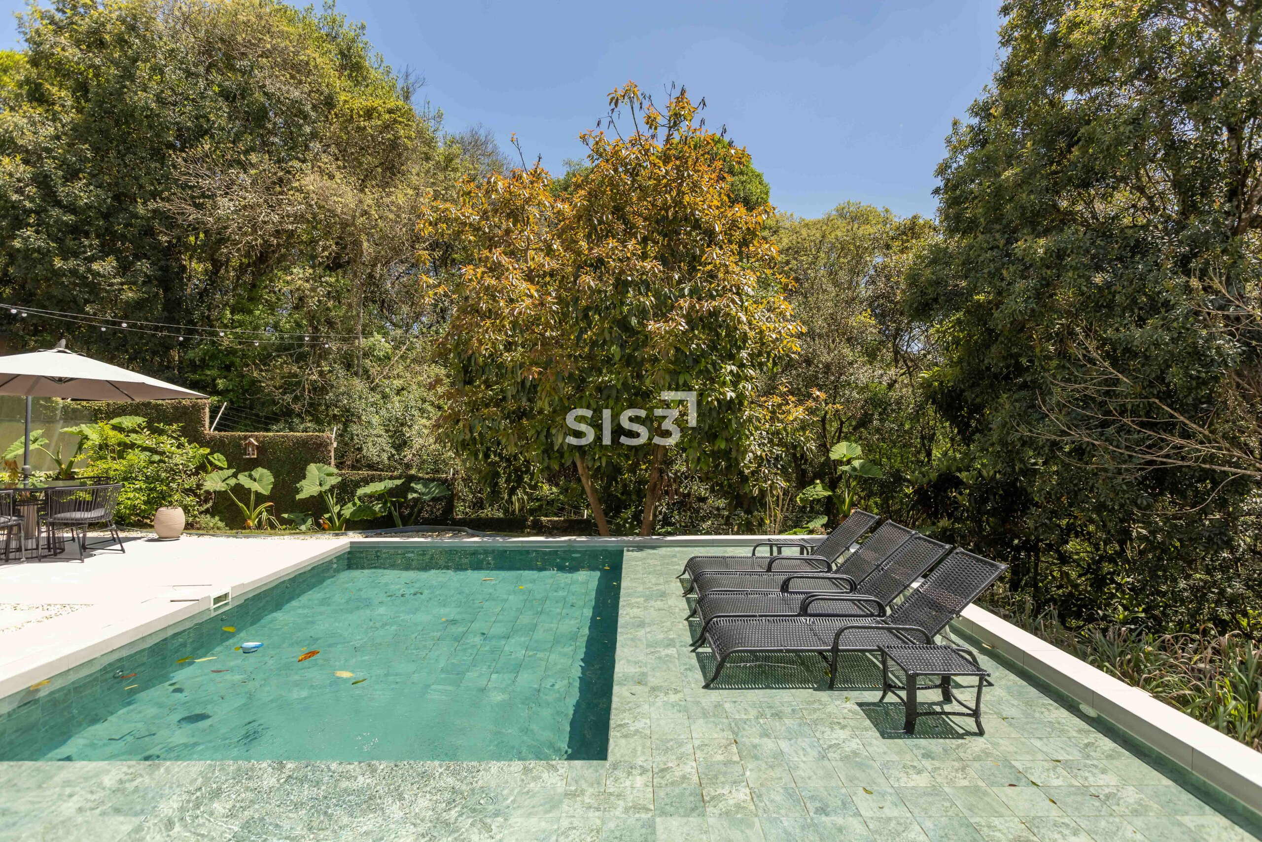 No térreo, os ambientes se abrem e se conectam. Sala, cozinha e área gourmet com churrasqueira formam um espaço contínuo, perfeito para reunir e aproveitar o tempo em casa. A piscina com aquecimento solar prolonga o uso da área externa ao longo do ano, enquanto o verde ao redor traz uma sensação constante de calma. A garagem coberta comporta até quatro carros.