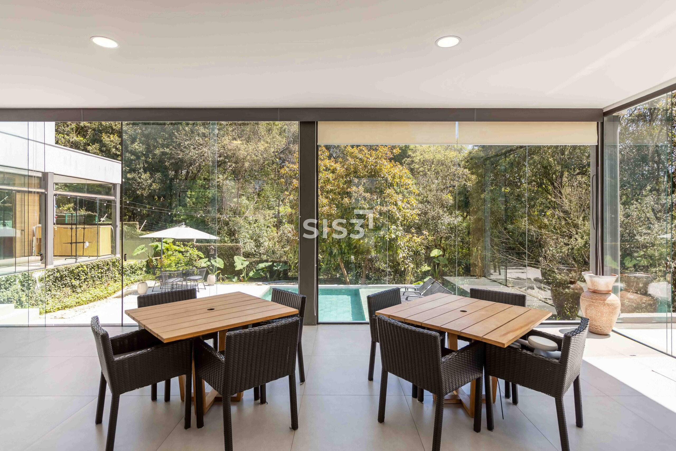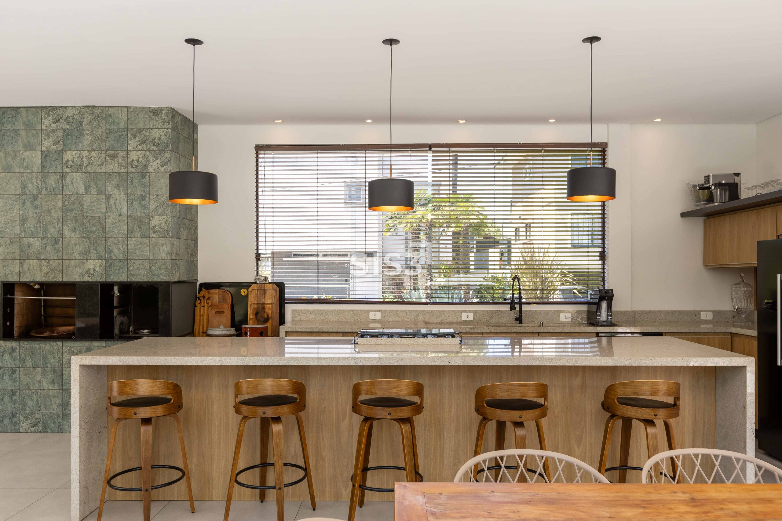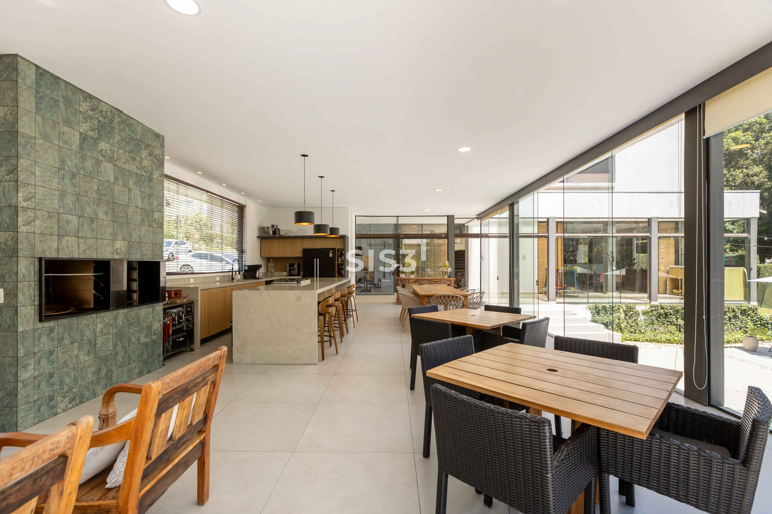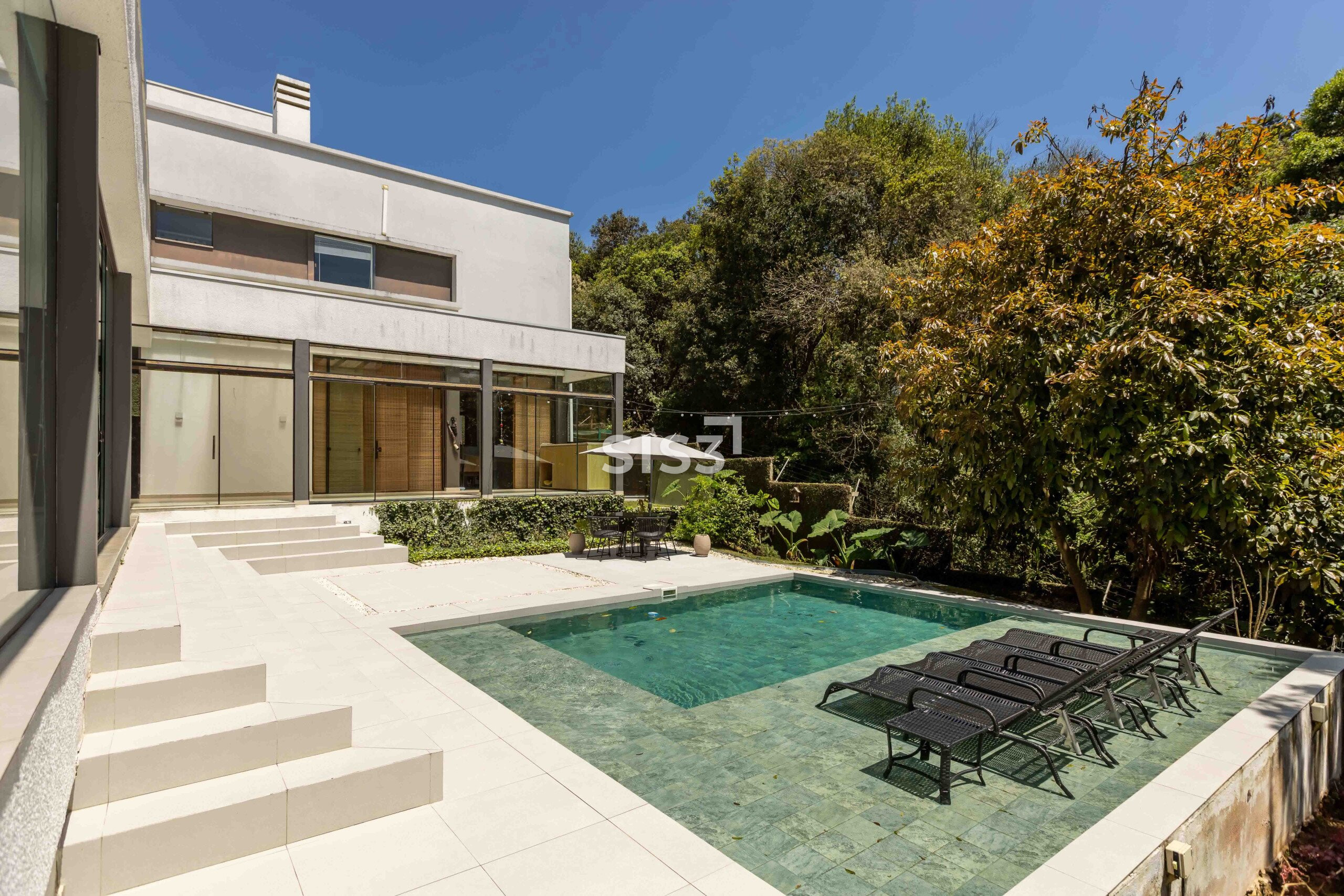 No térreo, os ambientes se abrem e se conectam. Sala, cozinha e área gourmet com churrasqueira formam um espaço contínuo, perfeito para reunir e aproveitar o tempo em casa. A piscina com aquecimento solar prolonga o uso da área externa ao longo do ano, enquanto o verde ao redor traz uma sensação constante de calma. A garagem coberta comporta até quatro carros.
