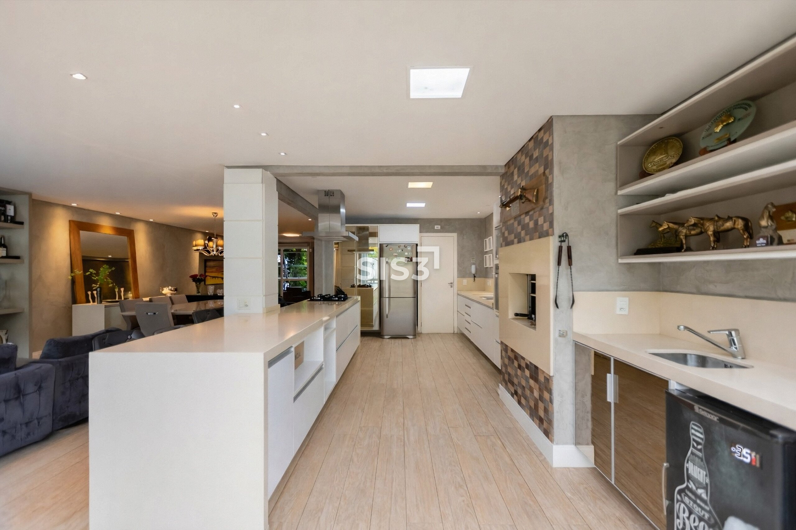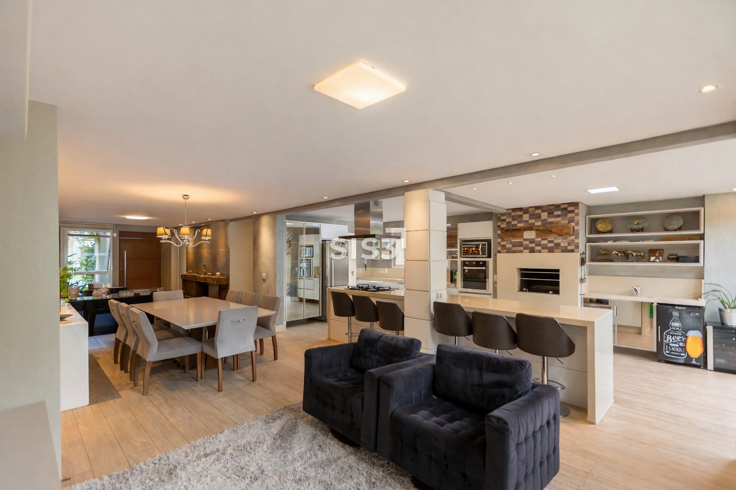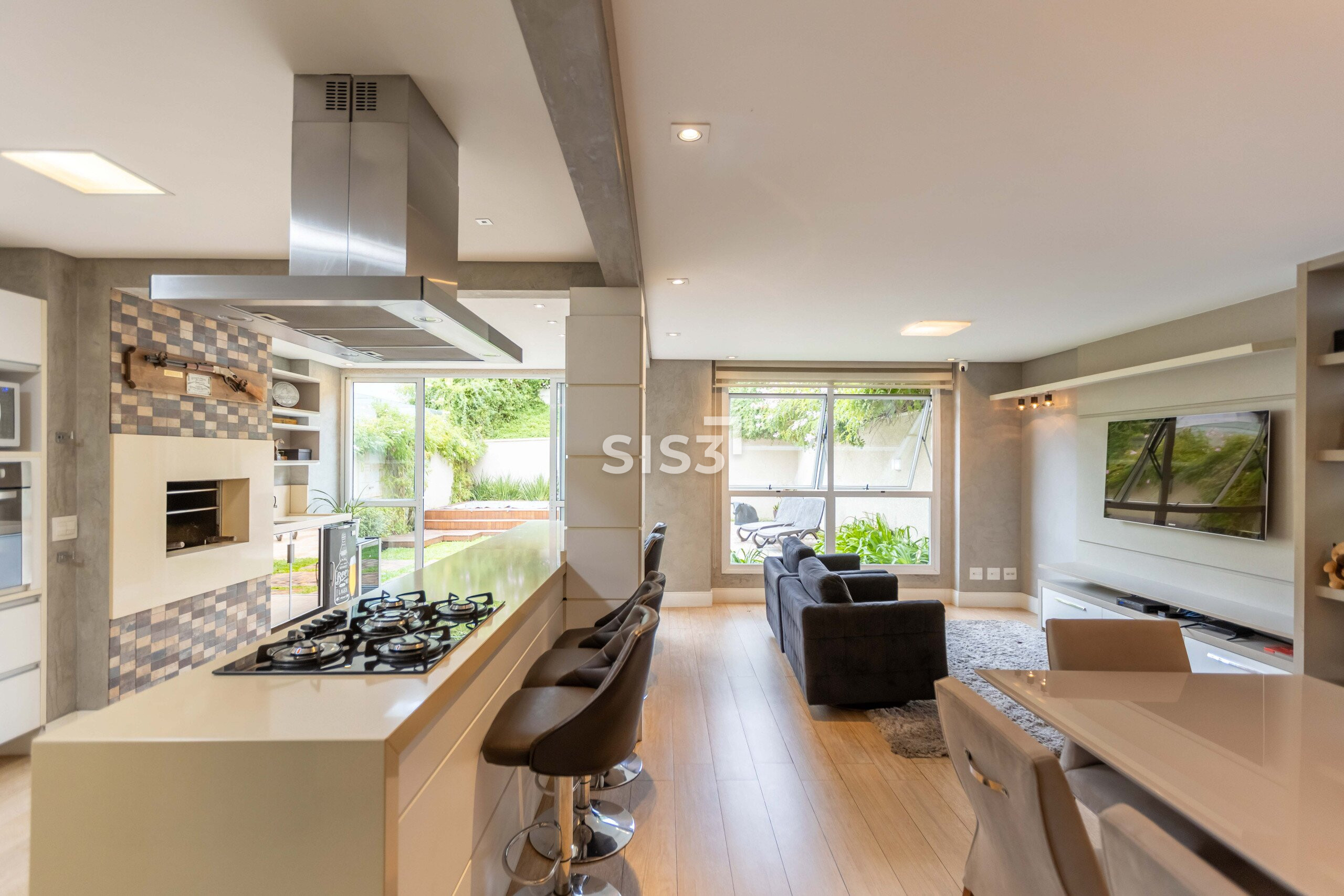 No térreo, a área social vai além do convencional. Estar, jantar e TV se conectam sem interrupções, criando um ambiente contínuo que se estende até a cozinha gourmet com churrasqueira a carvão, pensada para receber com naturalidade.