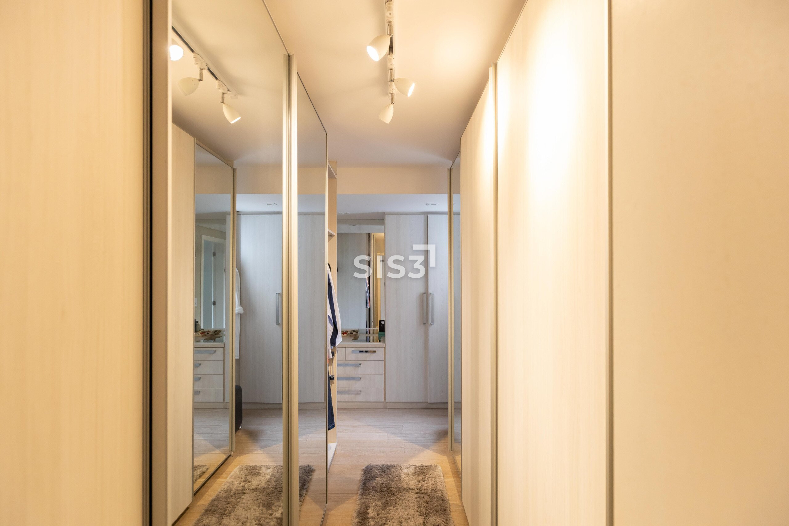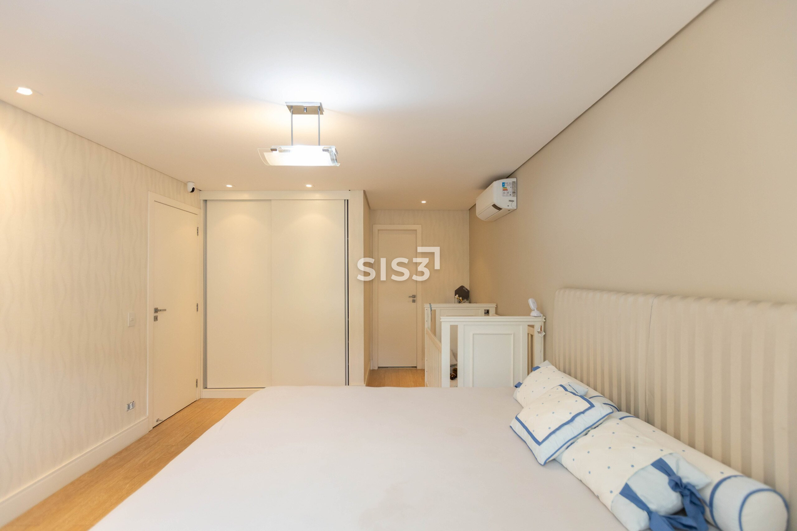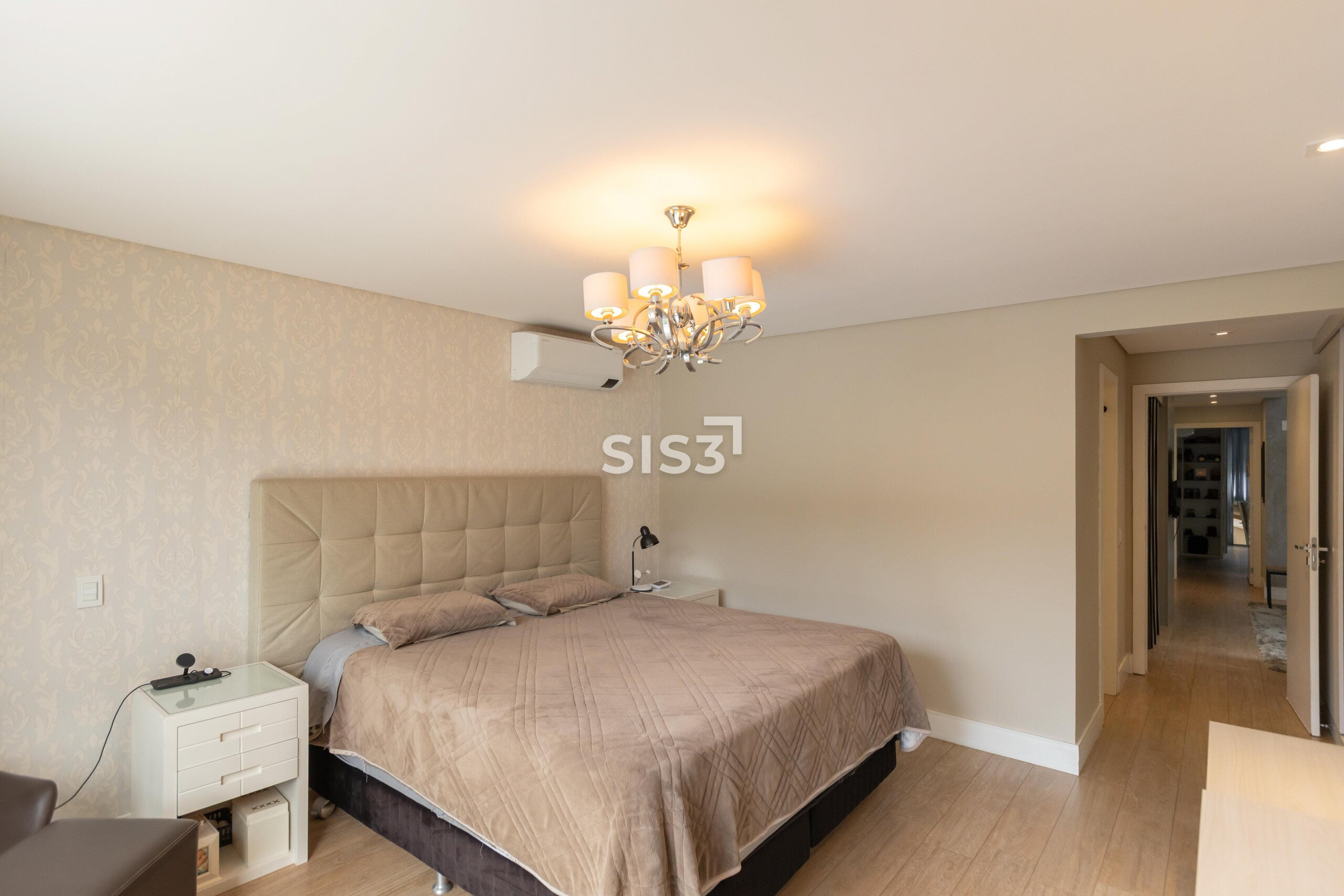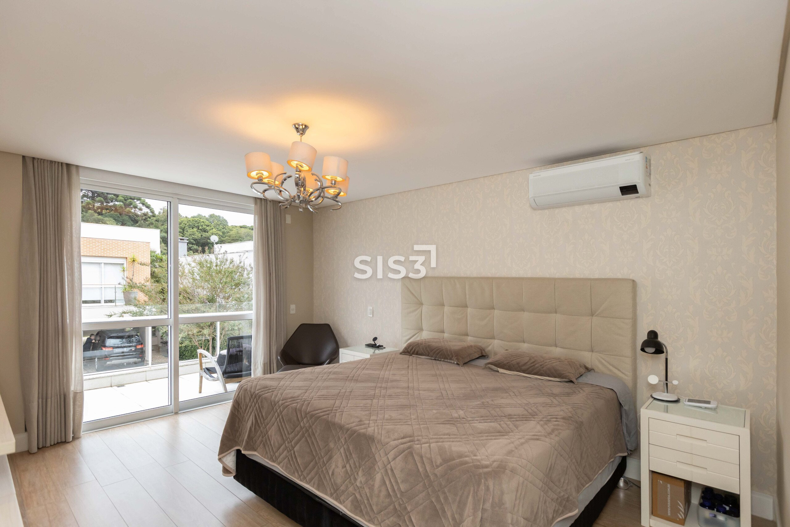 No pavimento superior, a área íntima organiza o conforto. São três suítes amplas, com destaque para a suíte master, que incorpora um closet generoso e uma sala de banho com hidromassagem, além de uma sacada que amplia a sensação de espaço.