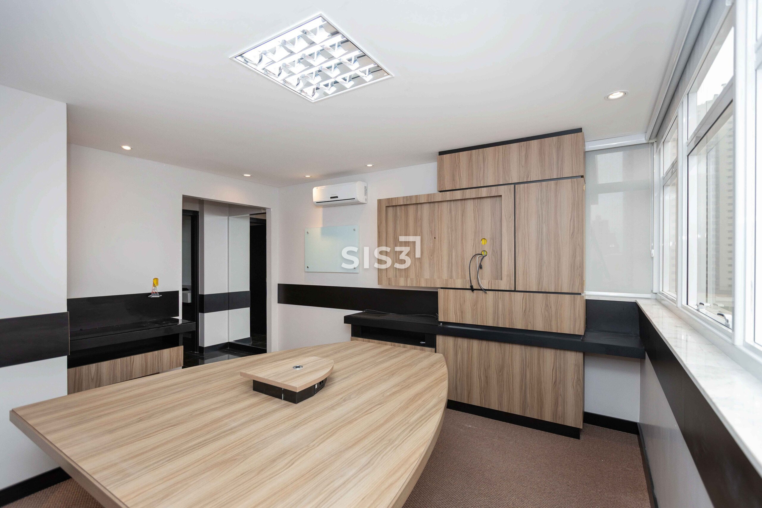 Logo na entrada, o ambiente destinado à recepção cria uma chegada agradável para clientes e visitantes, com lavabo de apoio. Na área principal, a sala já está organizada para encontros e atividades profissionais, com mesa de reuniões, ar-condicionado e painel para televisão, oferecendo um ambiente funcional para o trabalho cotidiano.