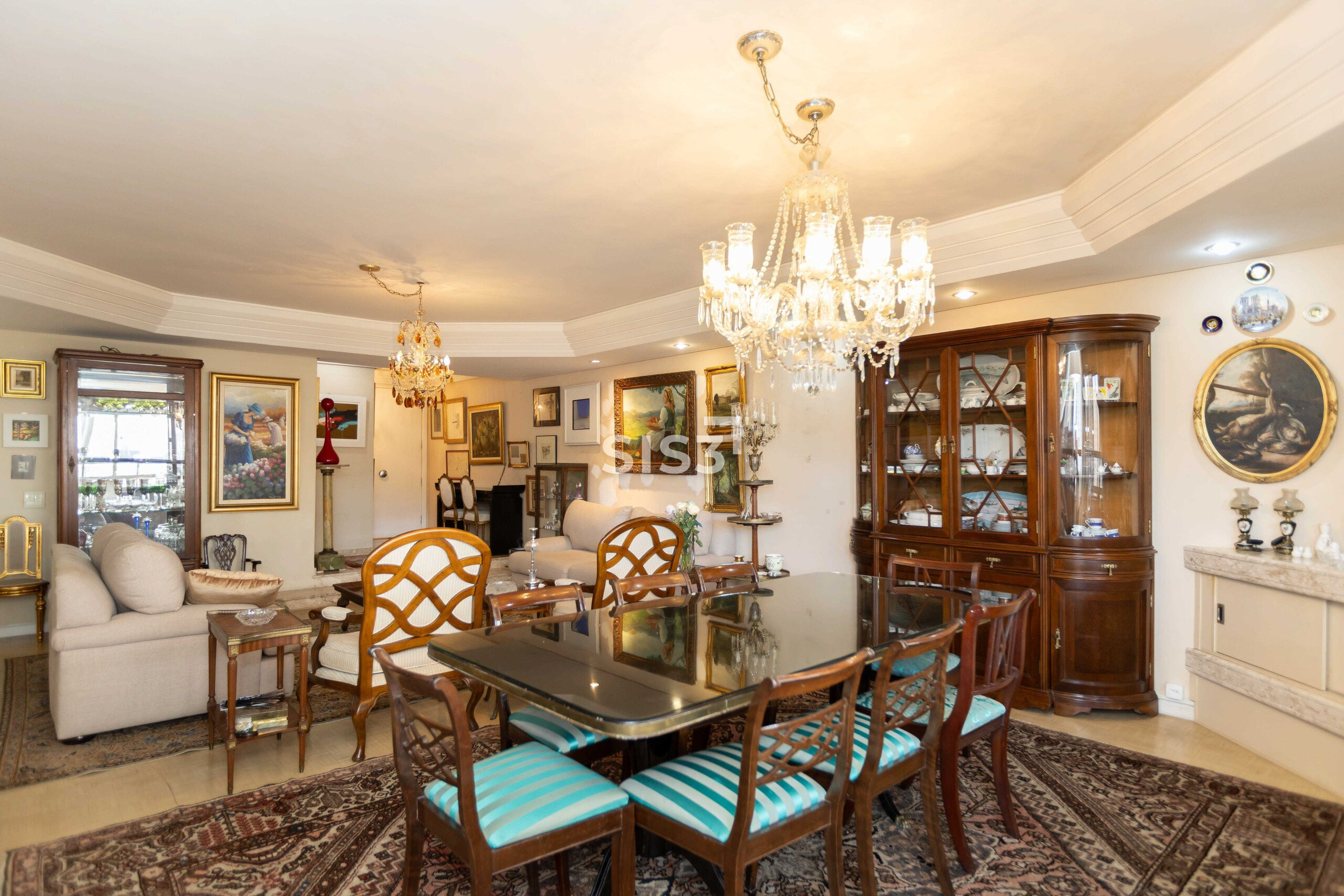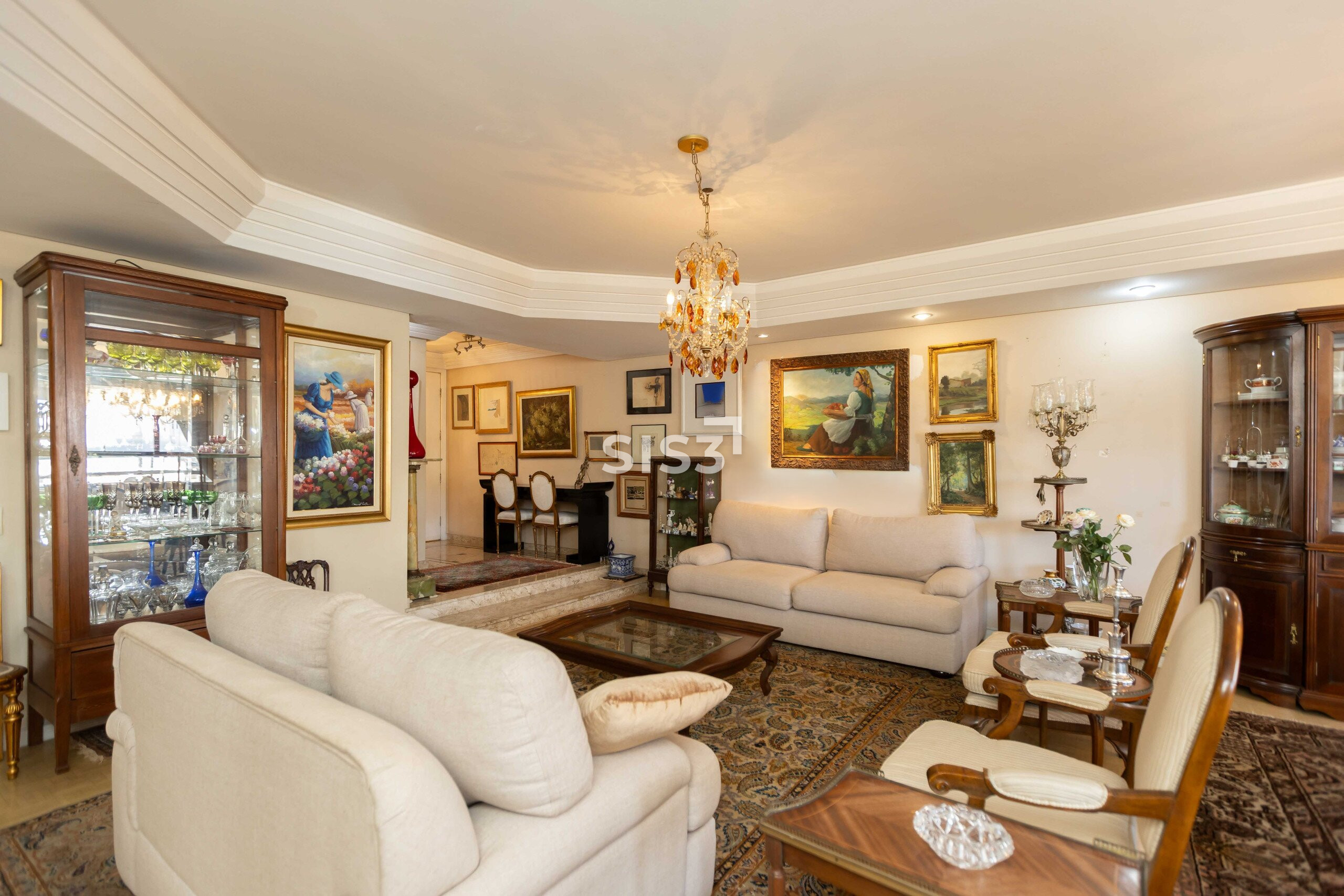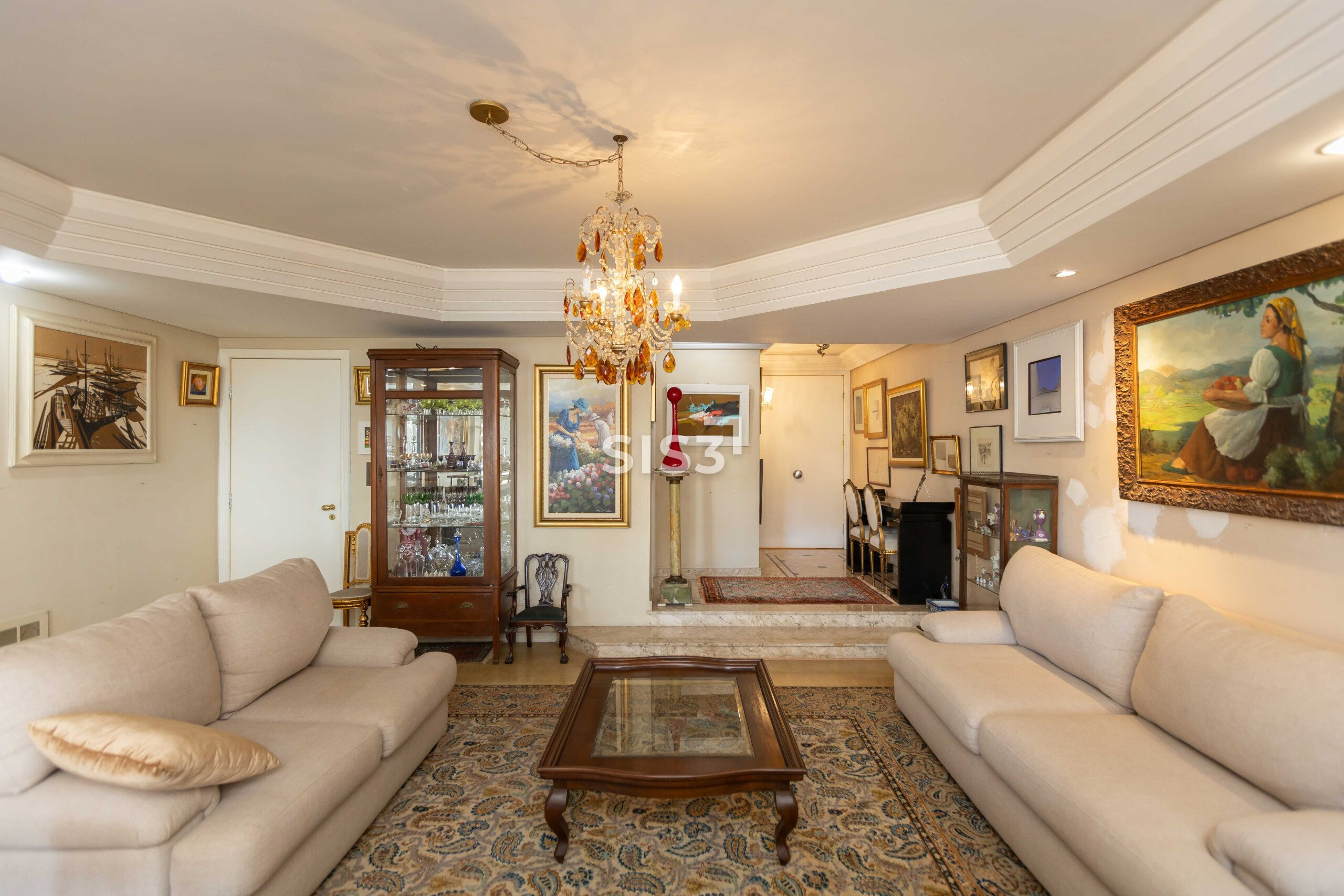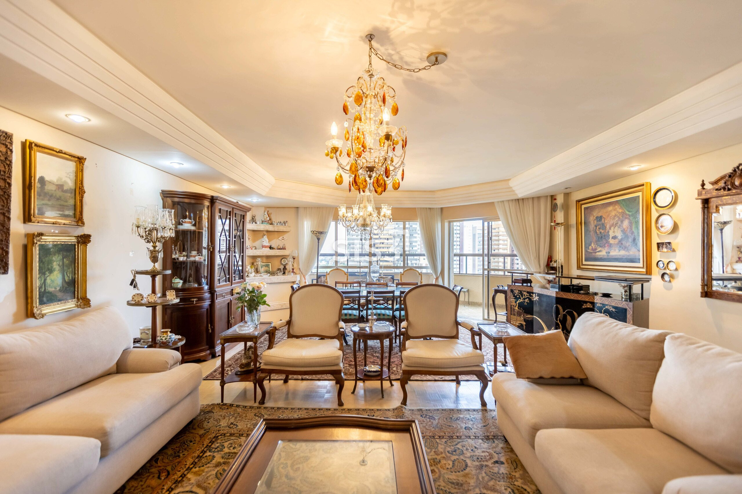 São 372,56 m² privativos onde cada detalhe revela camadas. Logo na entrada, o piso em mármore com desenho em mosaico encontra o taco marfim, um clássico raro que atravessa o tempo com personalidade.