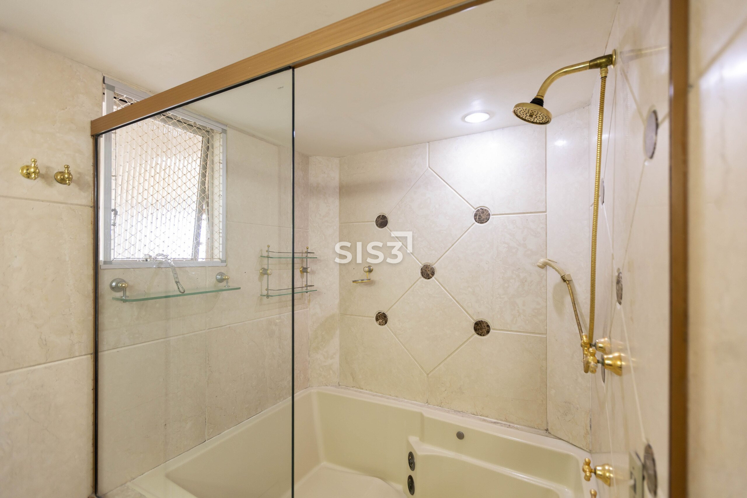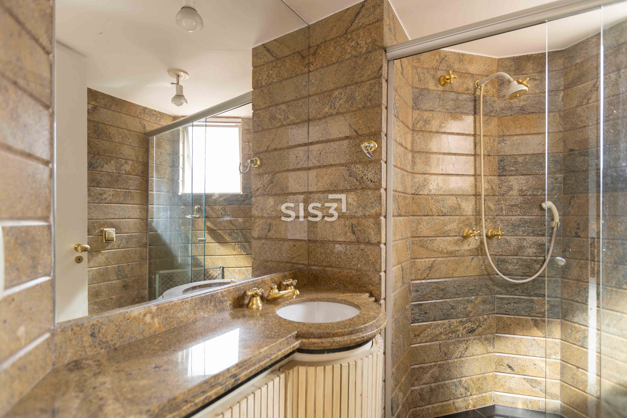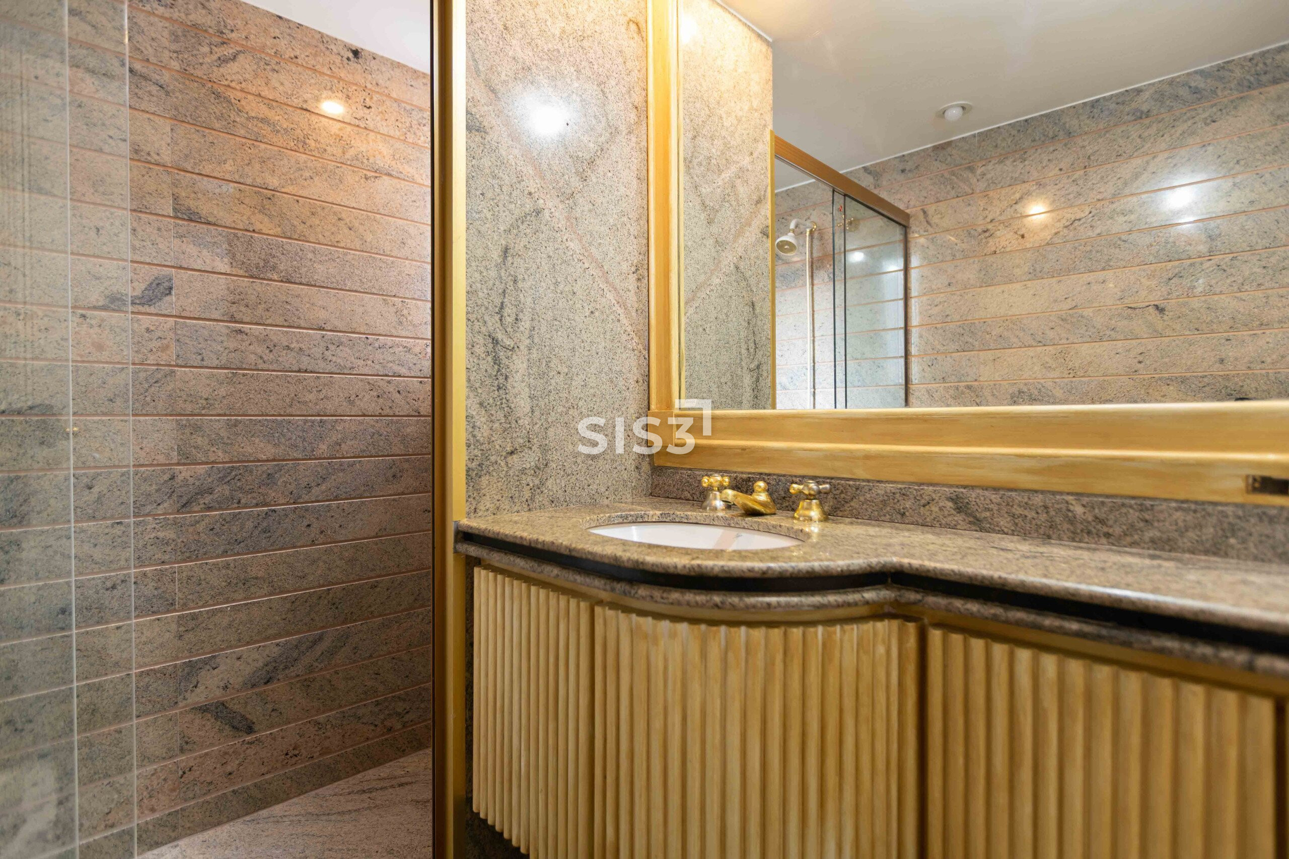 Na área íntima, três dormitórios (duas suítes + um quarto com banheiro social). A suíte principal tem porta-janela antirruído, closet espaçoso e um banho com hidromassagem em travertino, material que percorre todos os banheiros, criando unidade.