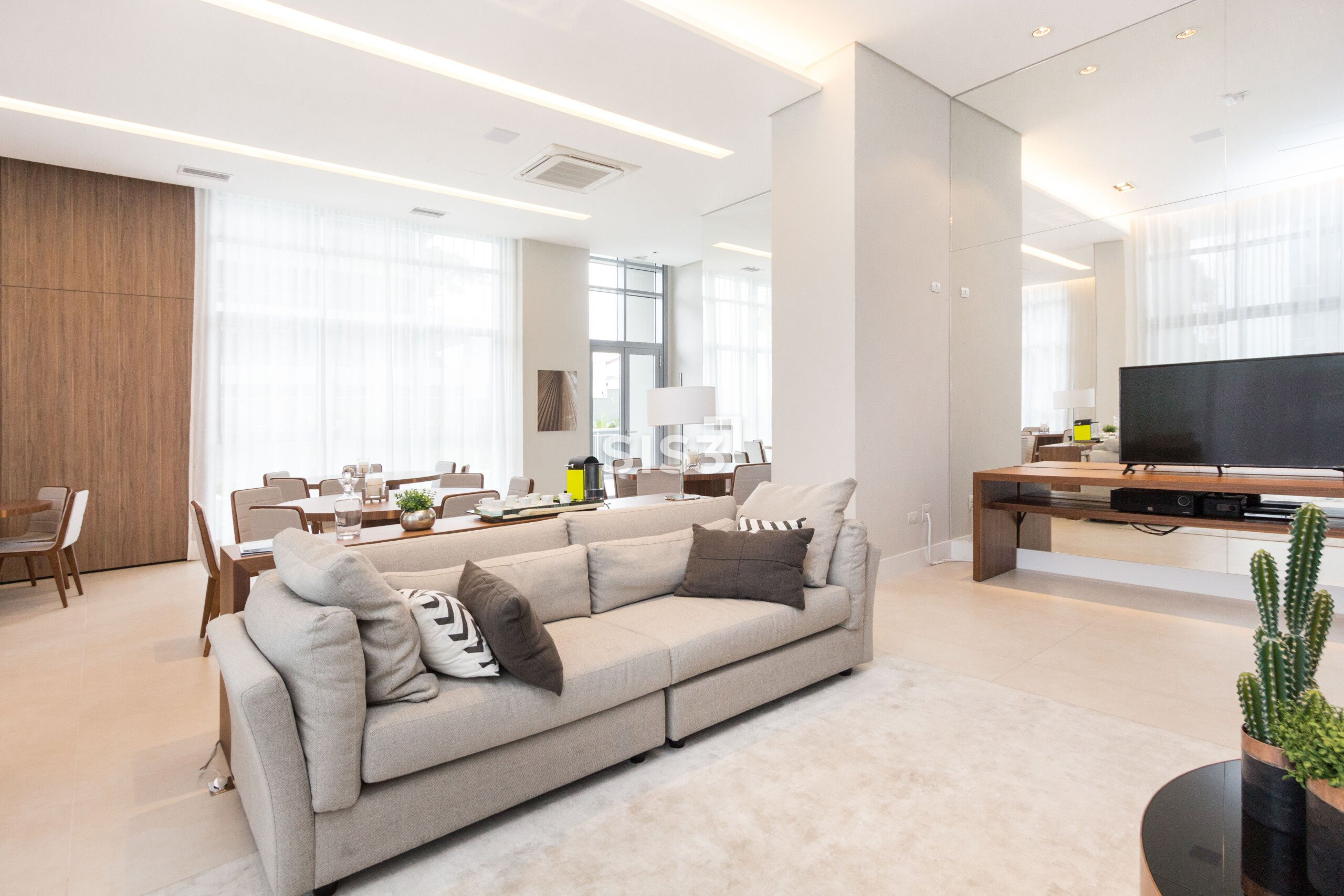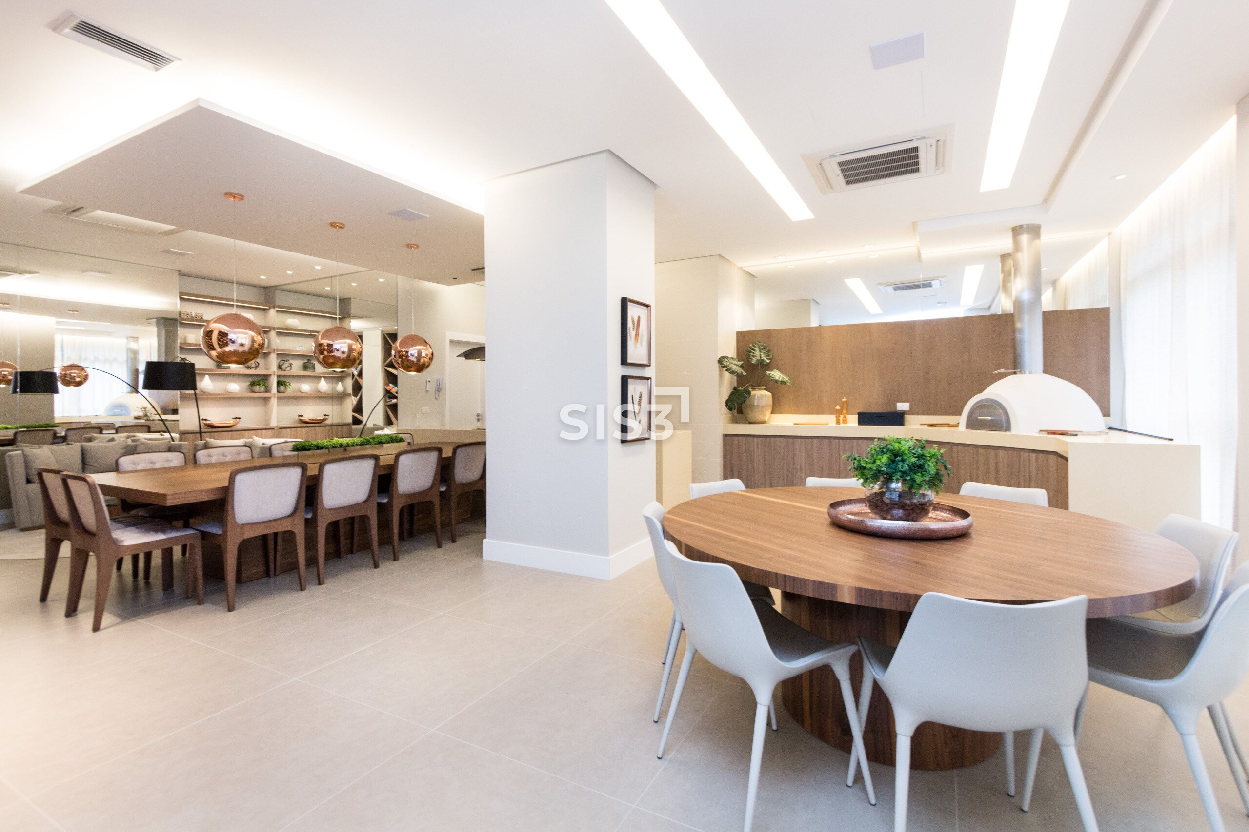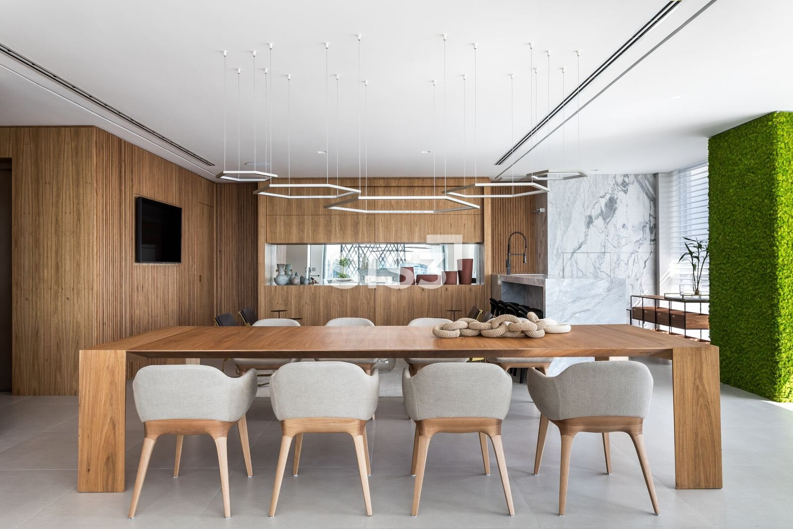 A área social integra sala de estar, jantar e cozinha, criando um espaço fluido e convidativo. As janelas de piso a teto revelam o verde do Parque Barigui e a vista urbana da cidade, trazendo a paisagem para dentro do apartamento.