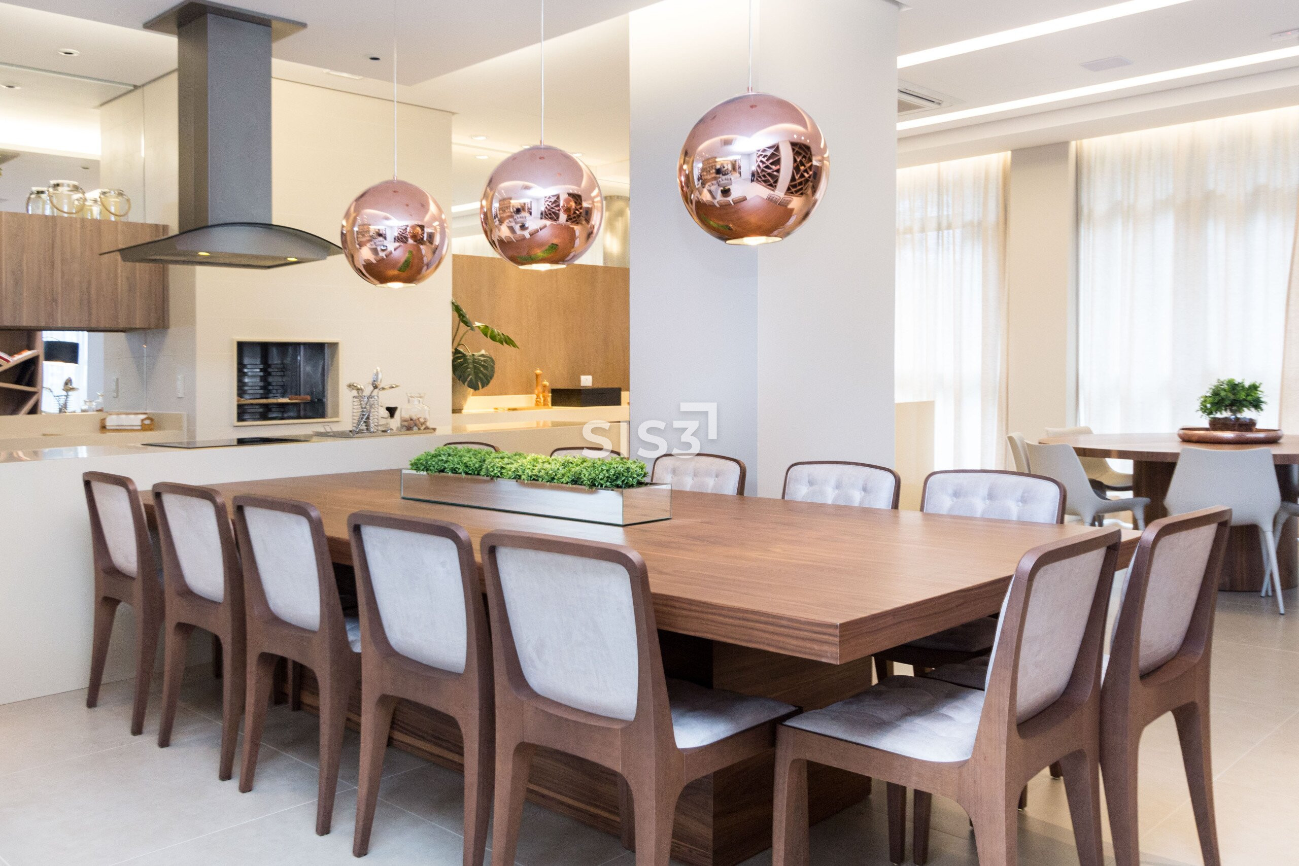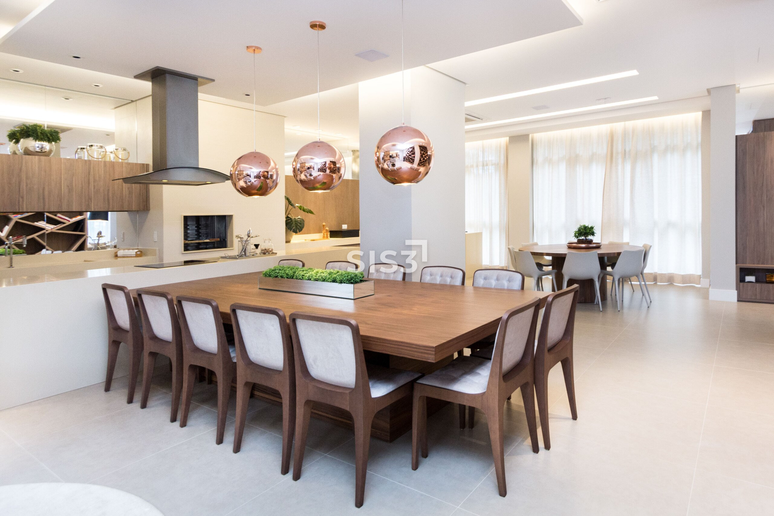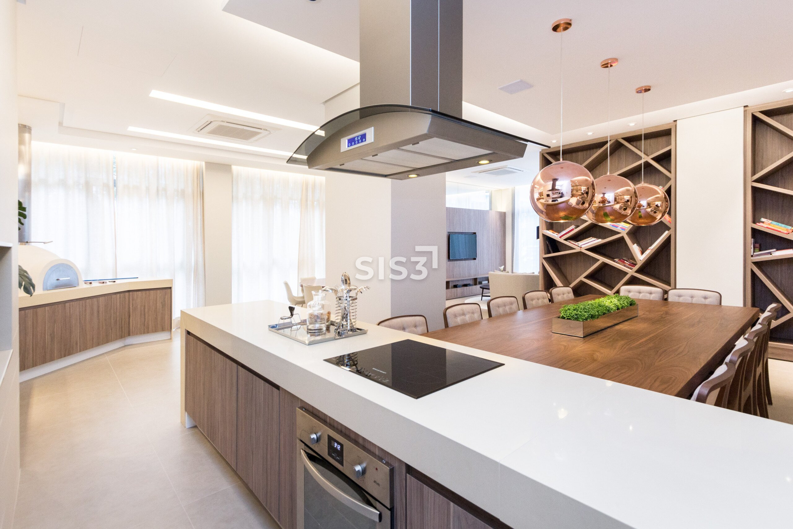 A área social integra sala de estar, jantar e cozinha, criando um espaço fluido e convidativo. As janelas de piso a teto revelam o verde do Parque Barigui e a vista urbana da cidade, trazendo a paisagem para dentro do apartamento.