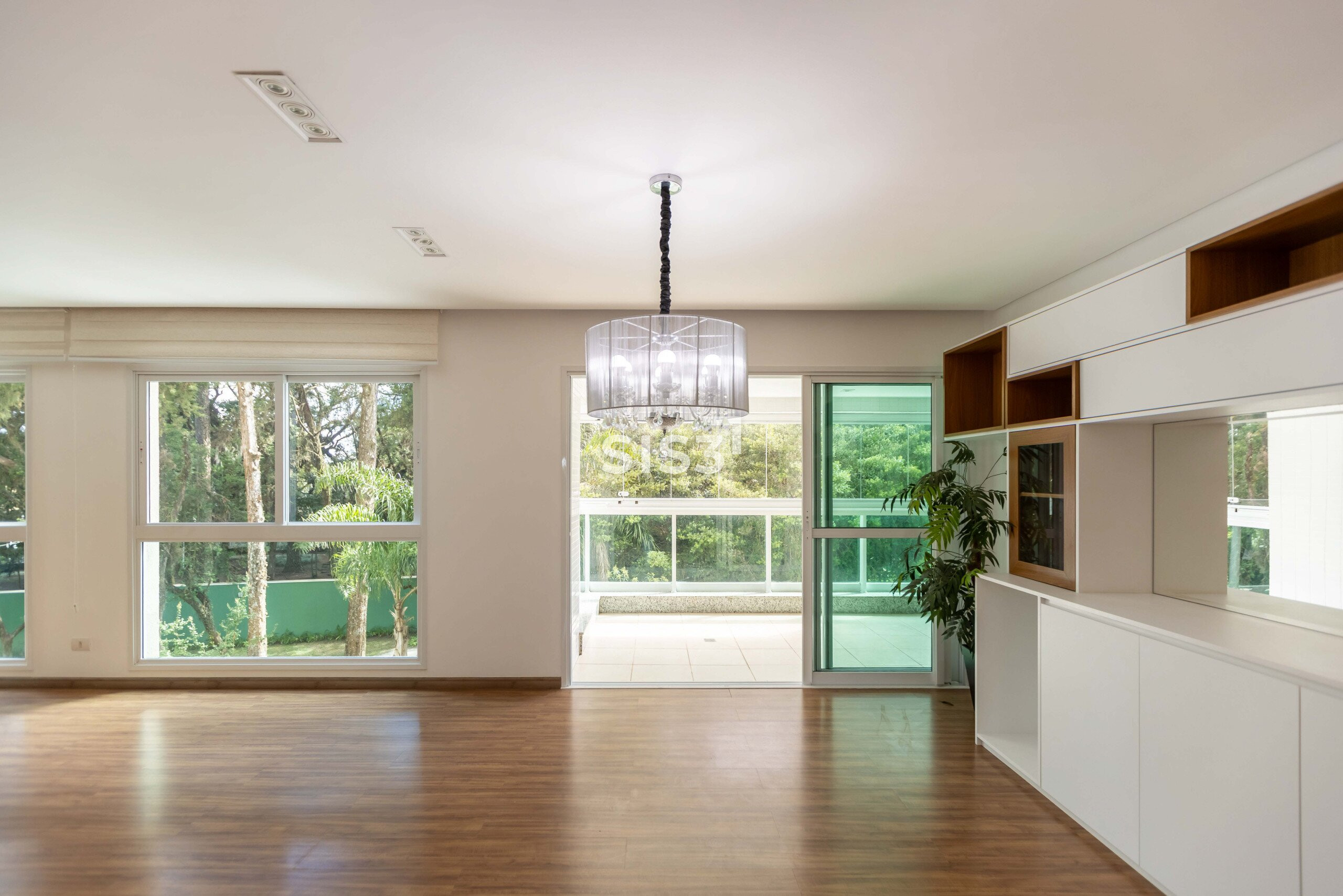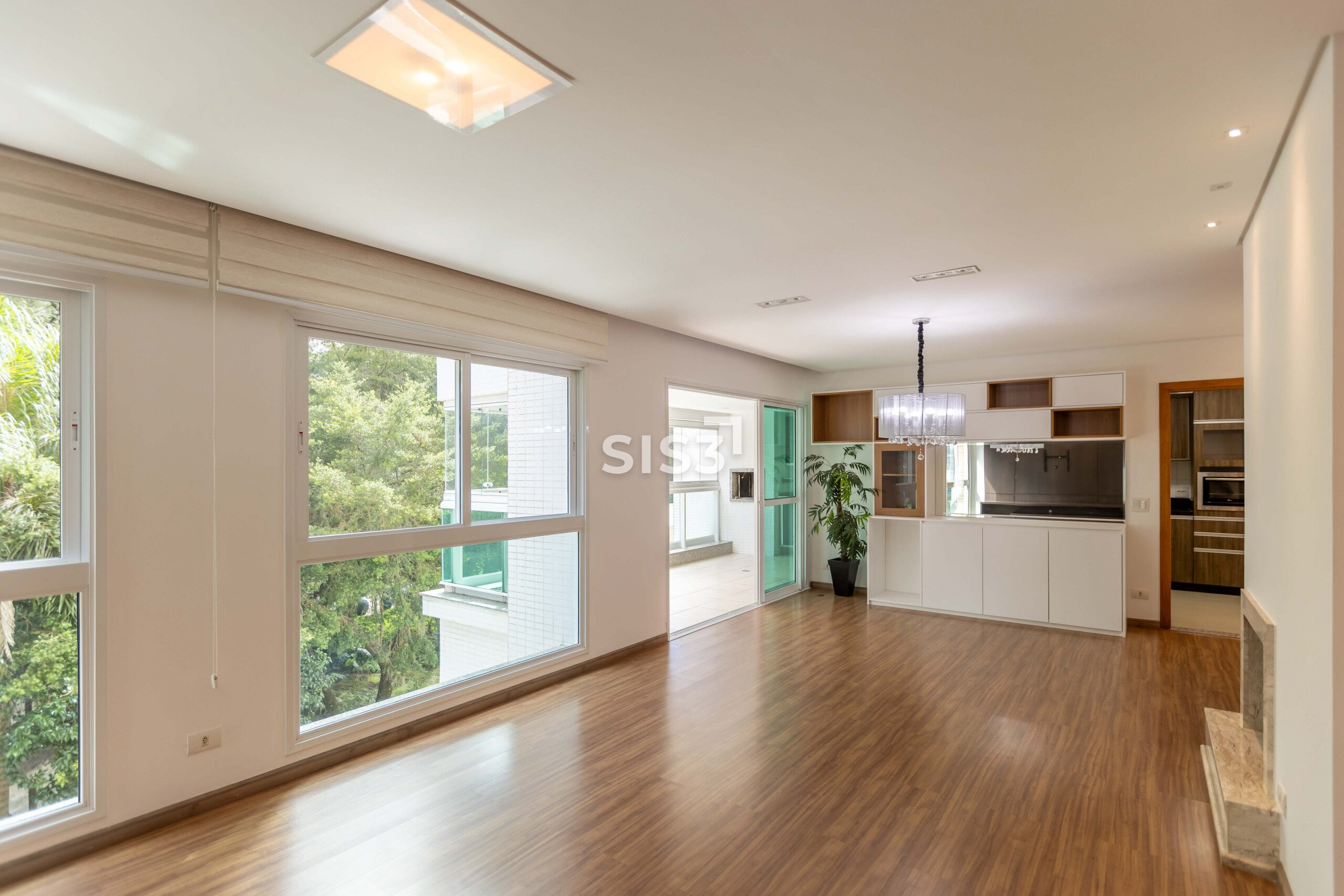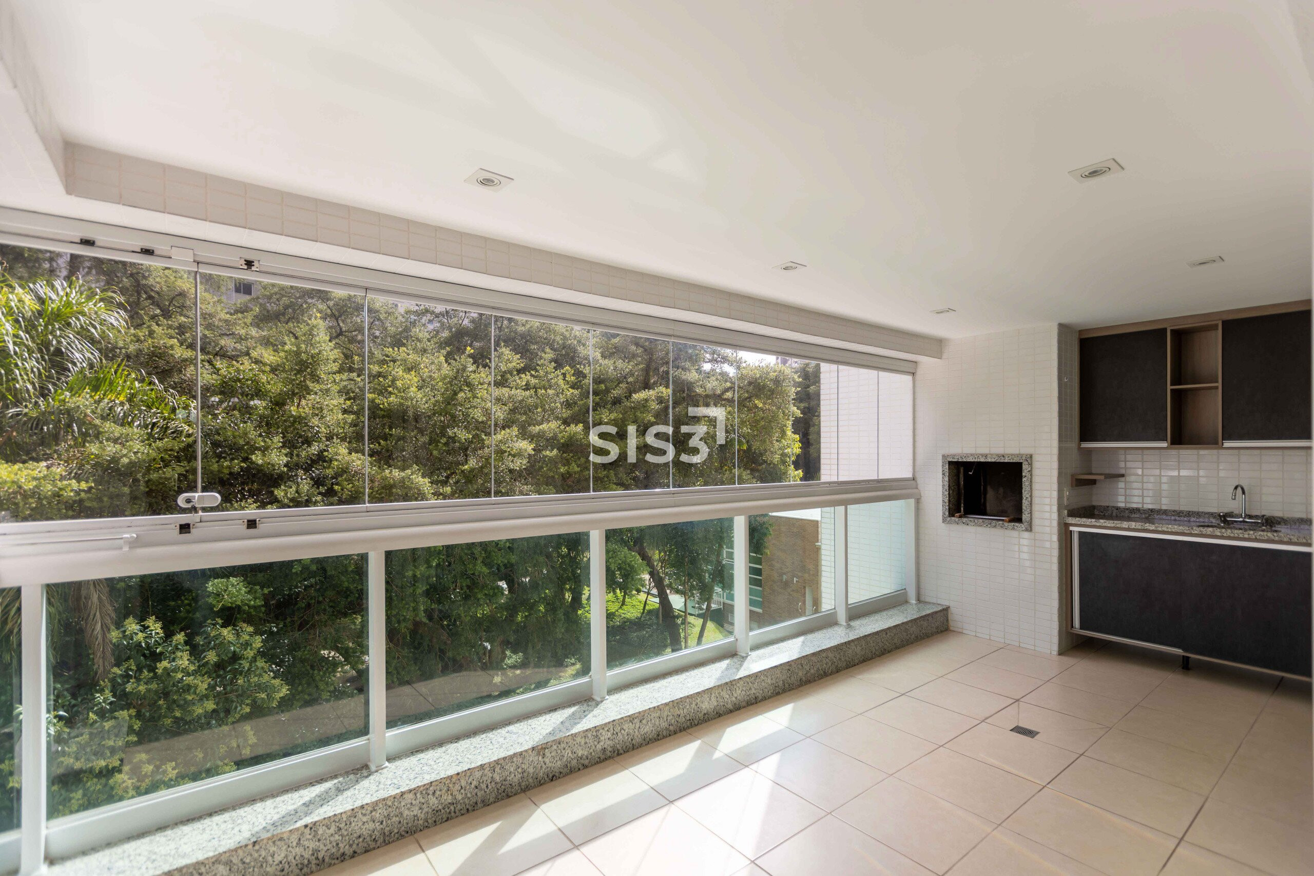 A área social se abre para a paisagem e se conecta à sacada com churrasqueira, criando um ambiente convidativo para encontros e momentos de convivência. A vista para a copa das árvores traz uma atmosfera tranquila, como se a natureza fizesse parte do cotidiano.