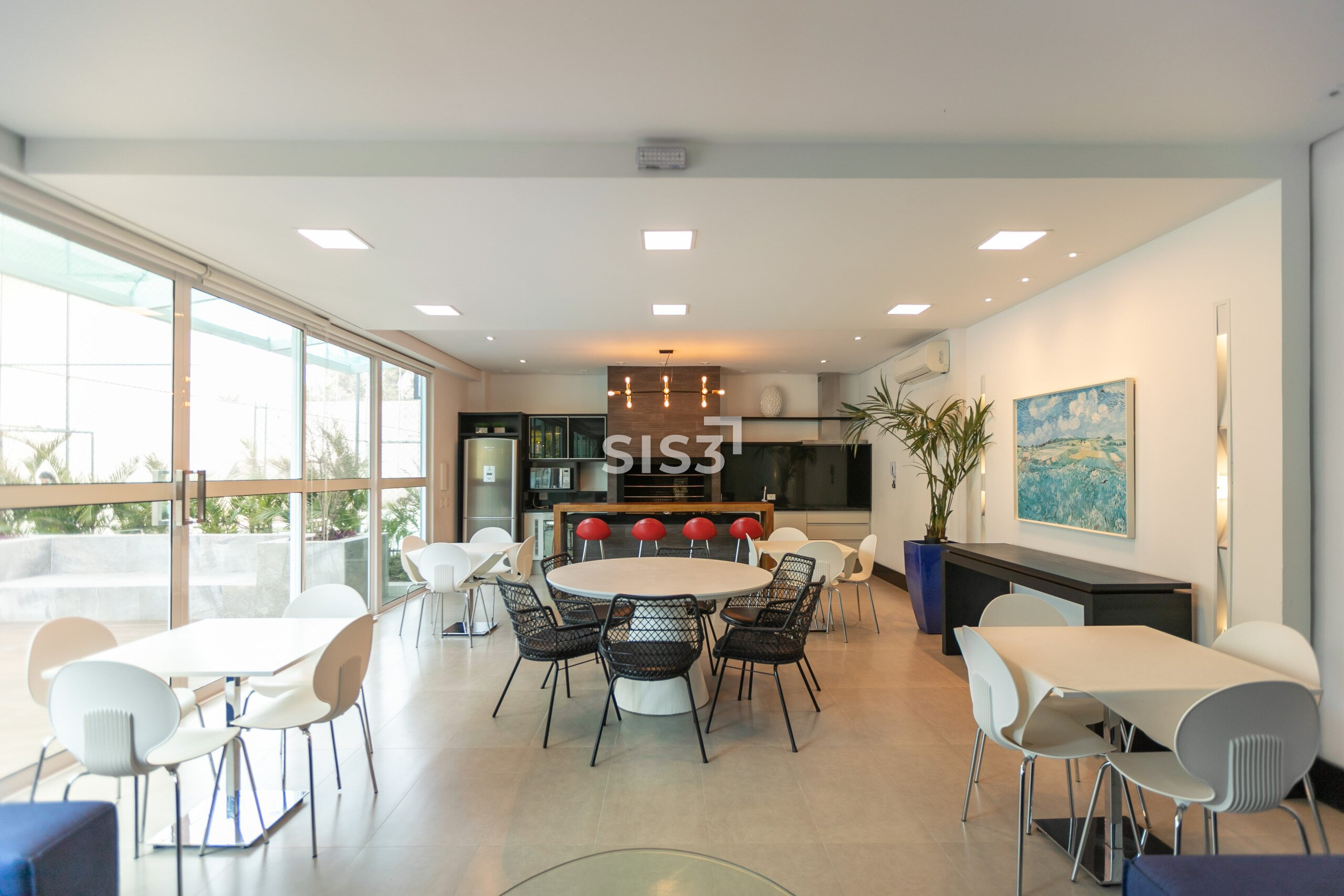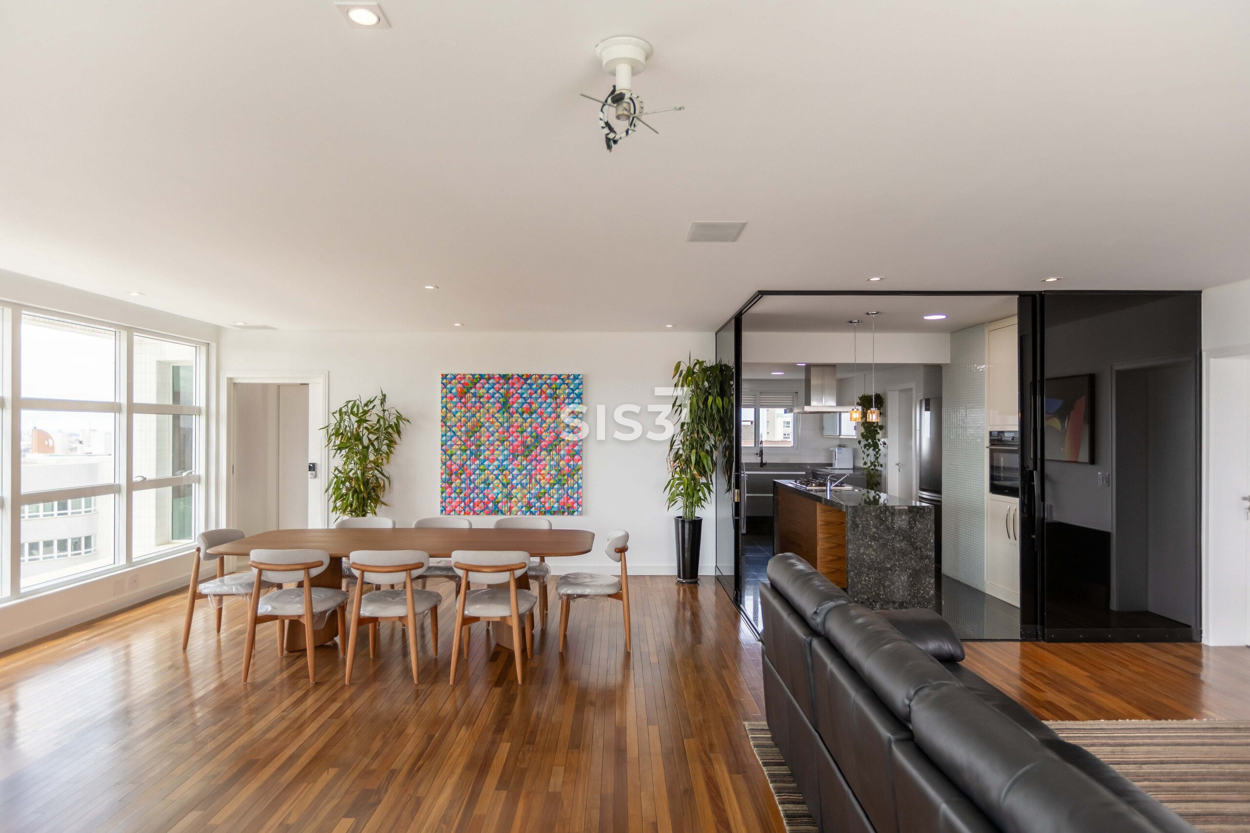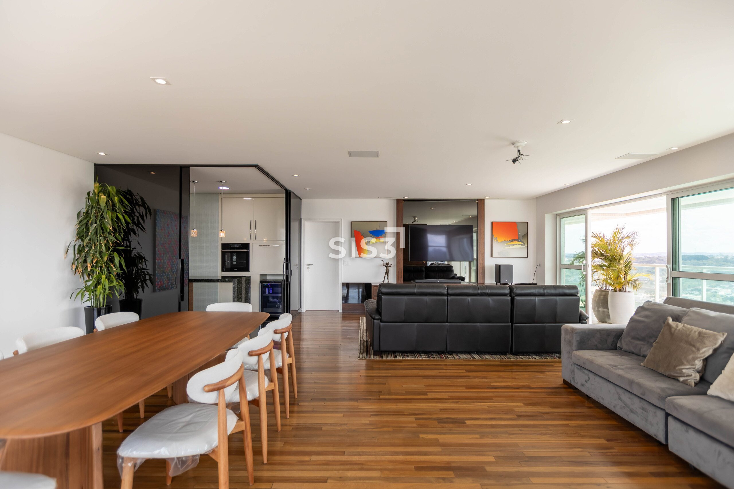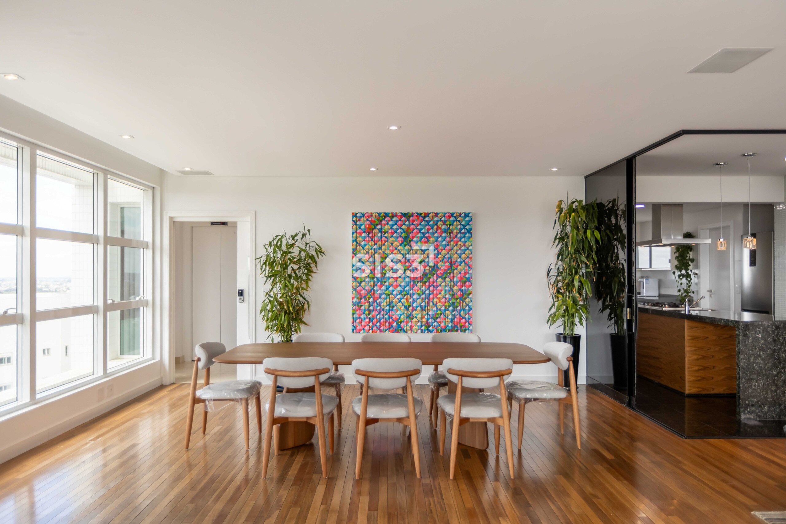 A área social é ampla e integrada, com cozinha aberta para a sala, permitindo fluidez e ventilação cruzada. As grandes janelas emolduram a vista verde do parque, proporcionando uma atmosfera leve e luminosa.