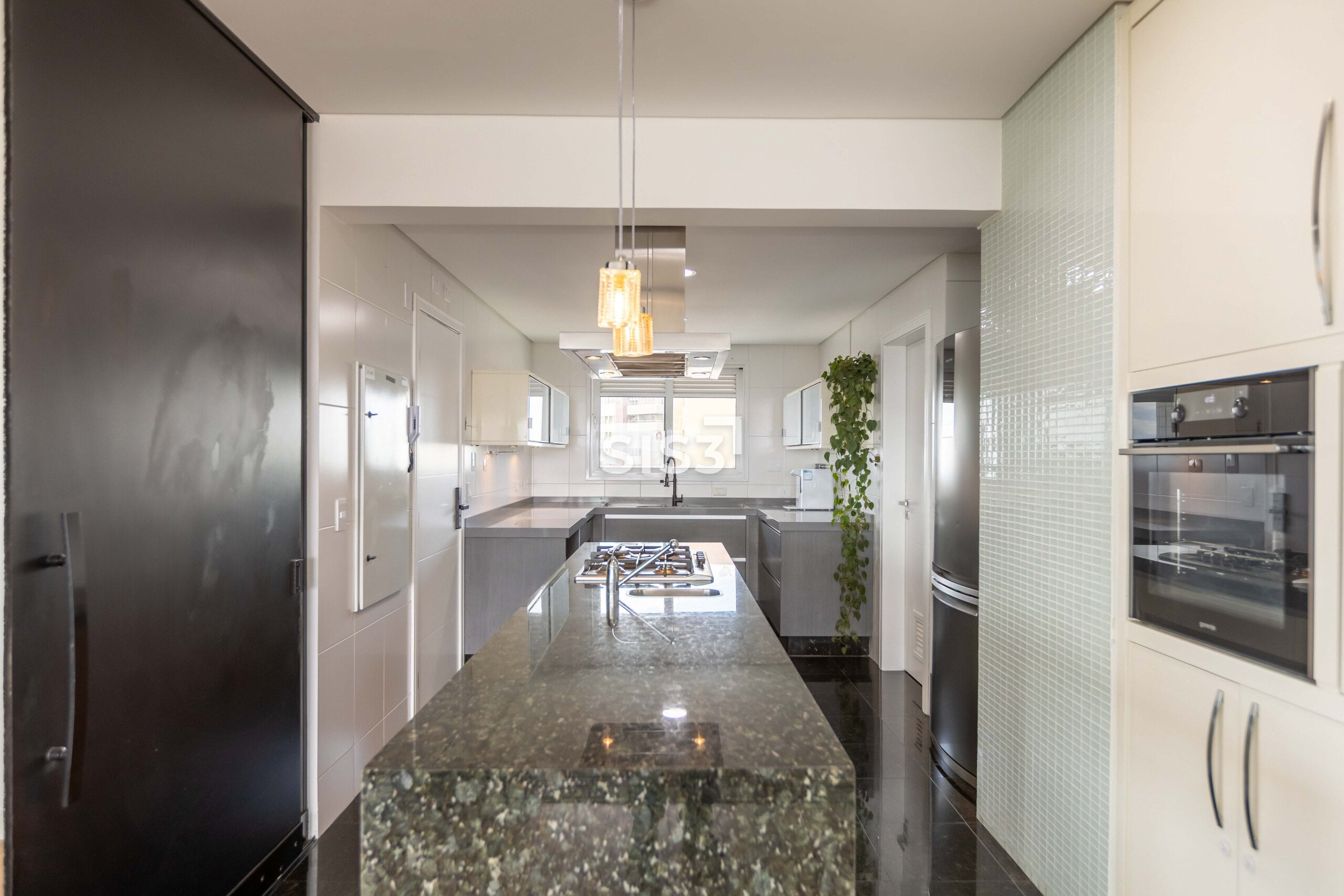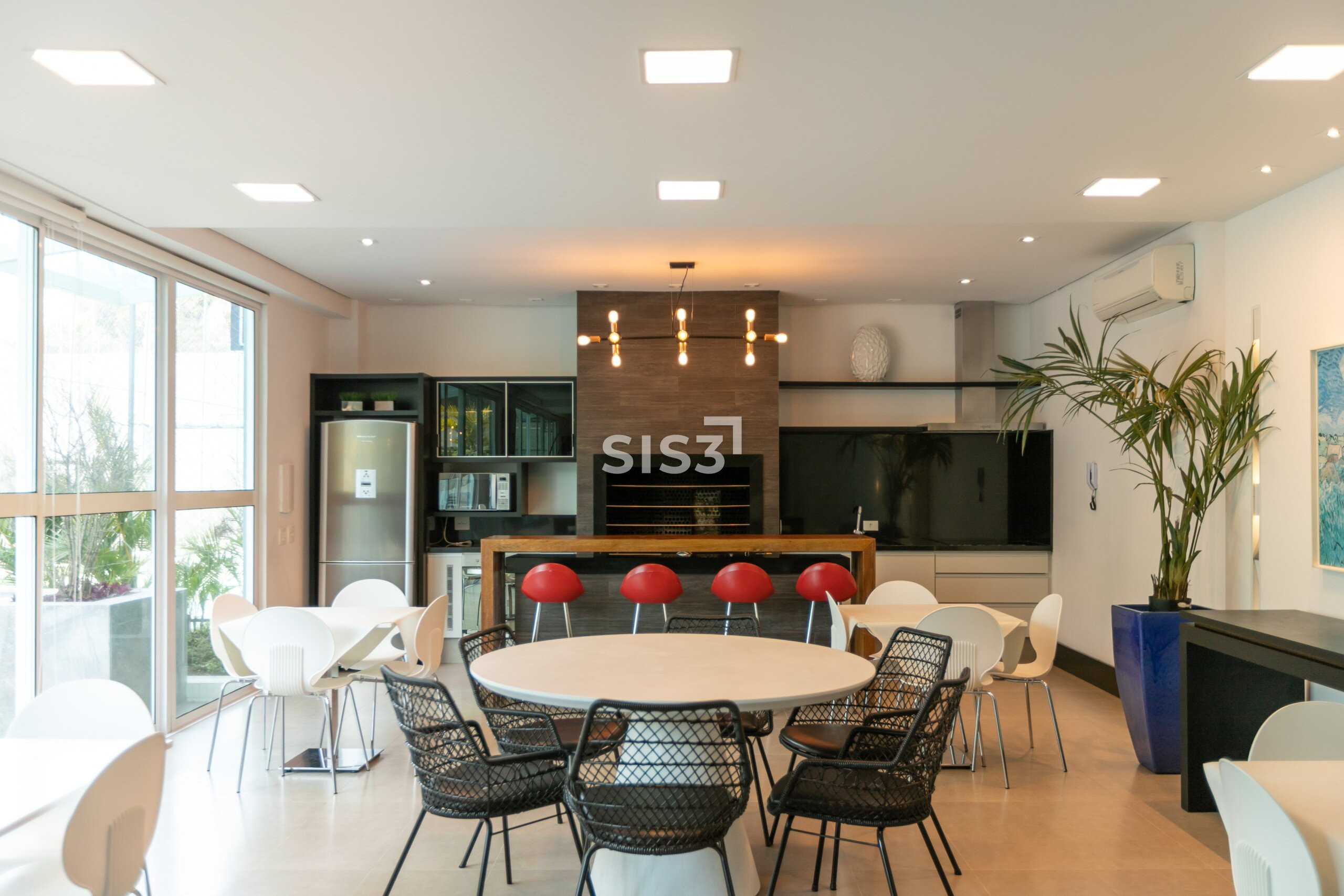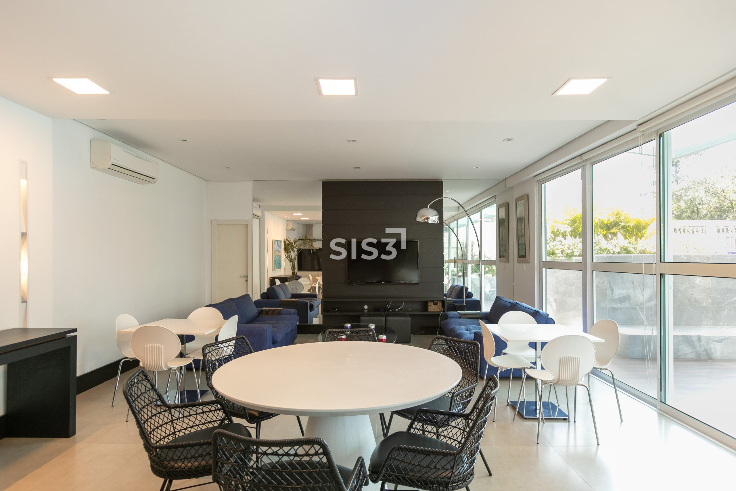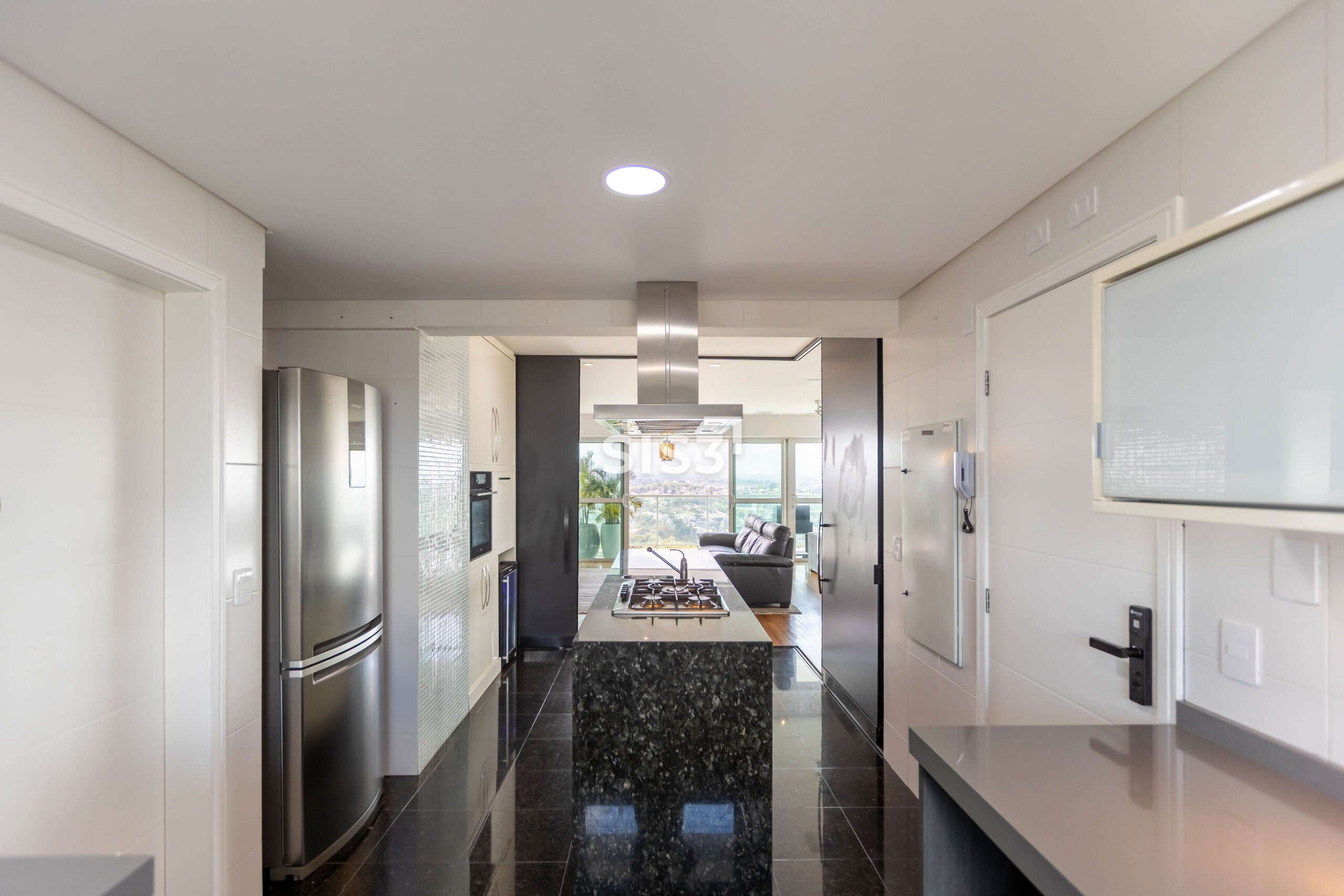 A área social é ampla e integrada, com cozinha aberta para a sala, permitindo fluidez e ventilação cruzada. As grandes janelas emolduram a vista verde do parque, proporcionando uma atmosfera leve e luminosa.