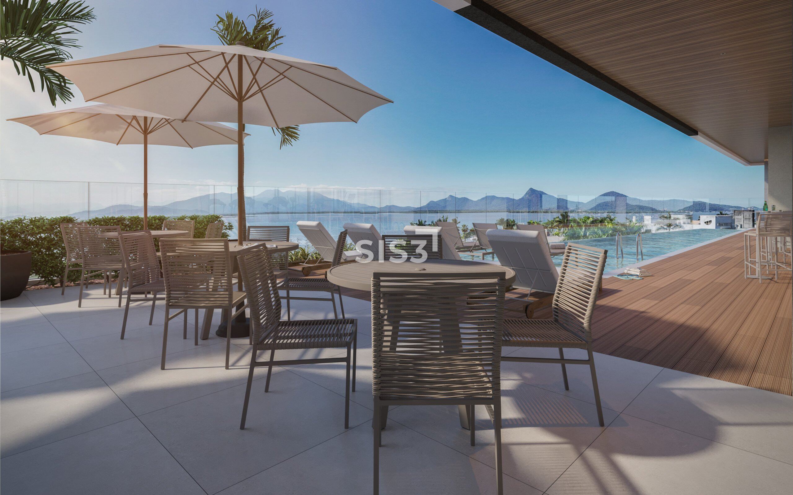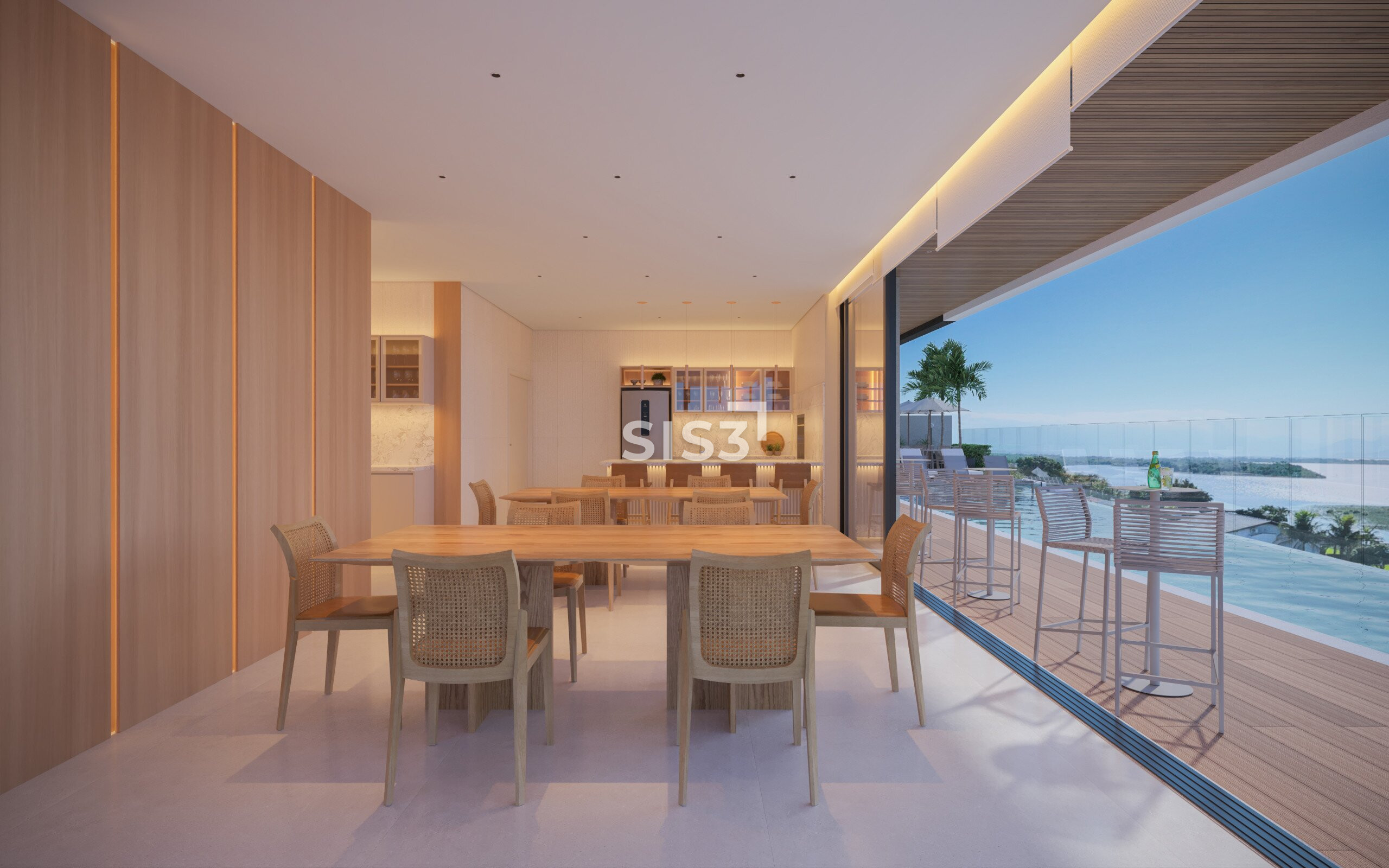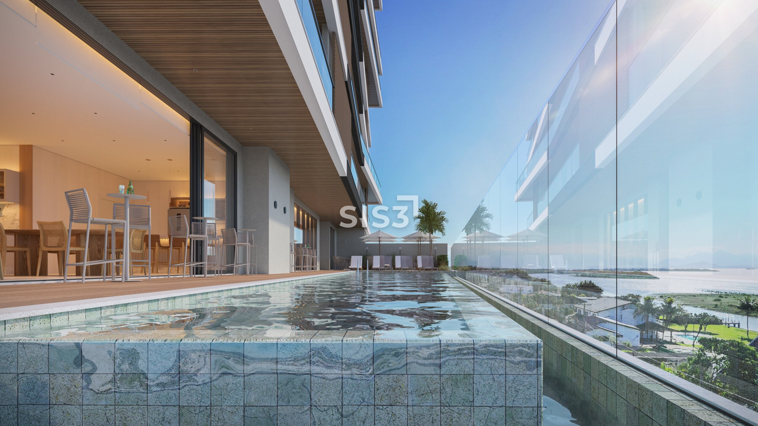 A área de lazer foi pensada para prolongar a experiência da baía, com piscina com borda infinita, espaço gourmet com churrasqueira, playground e ambientes voltados ao bem-estar da família.
