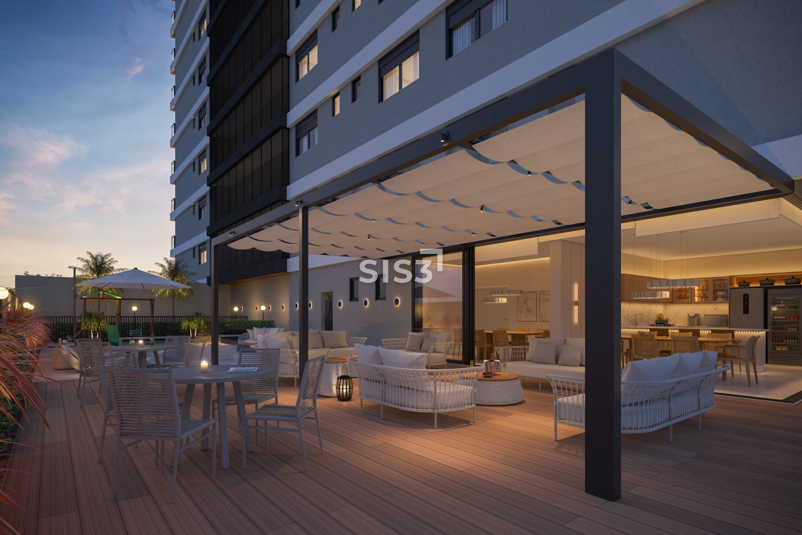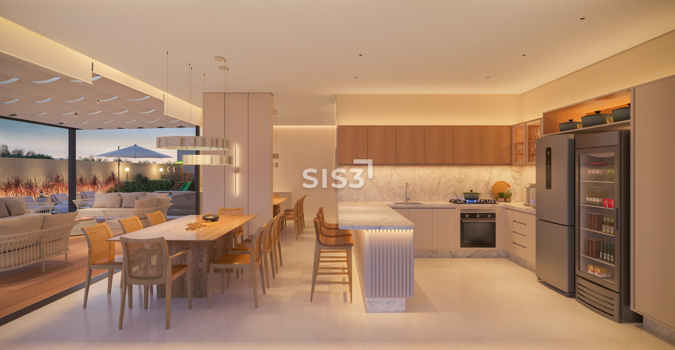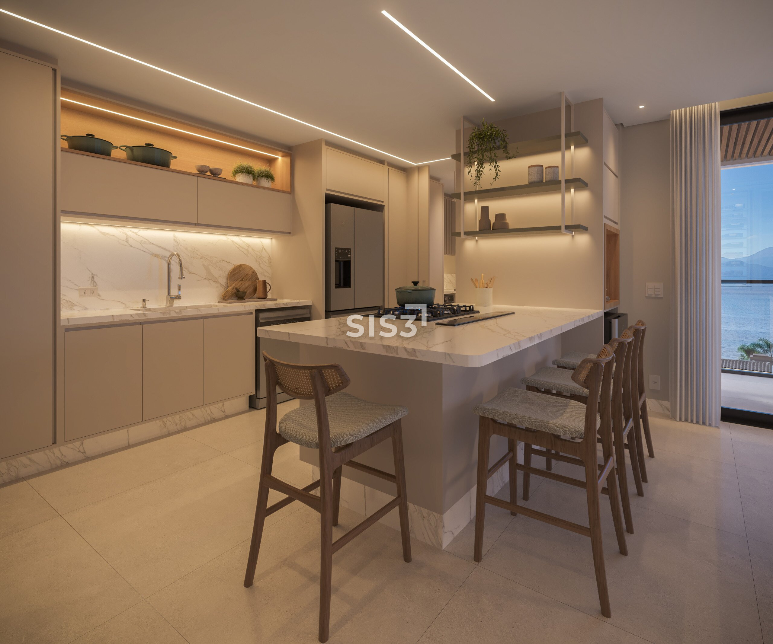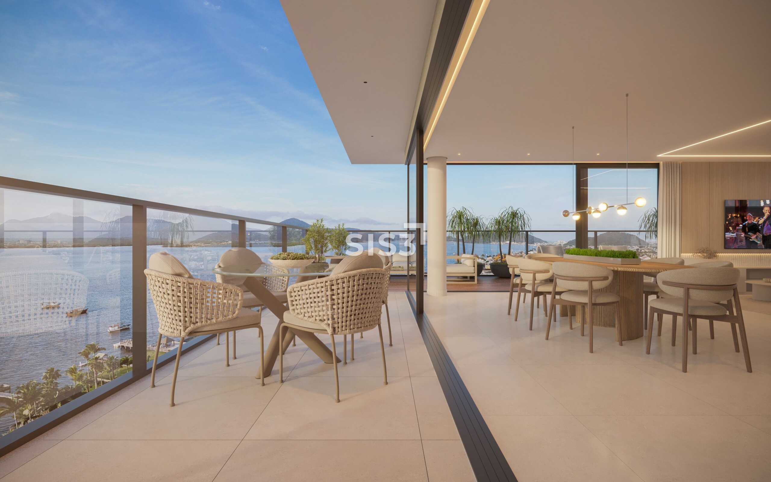 A área de lazer foi pensada para prolongar a experiência da baía, com piscina com borda infinita, espaço gourmet com churrasqueira, playground e ambientes voltados ao bem-estar da família.