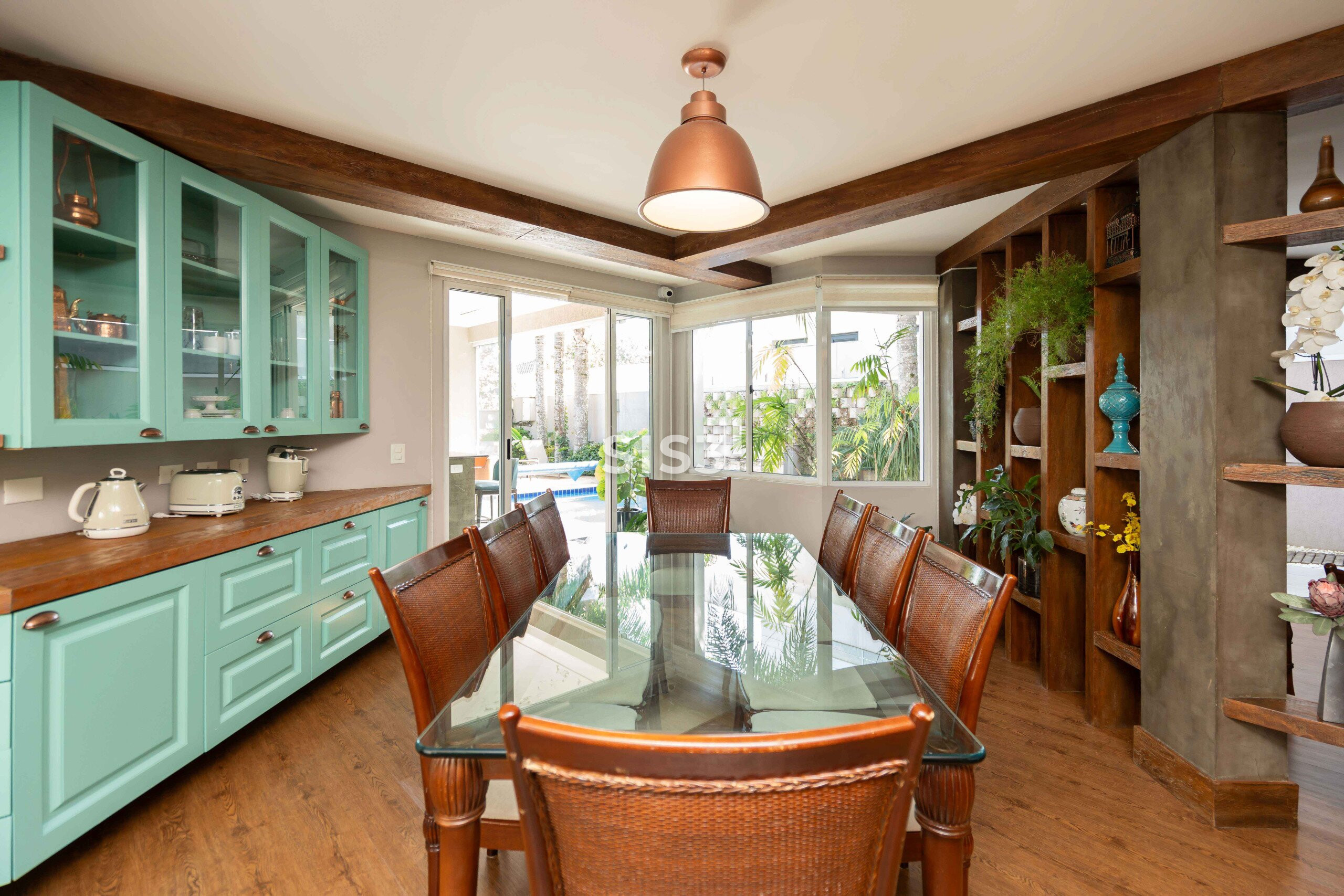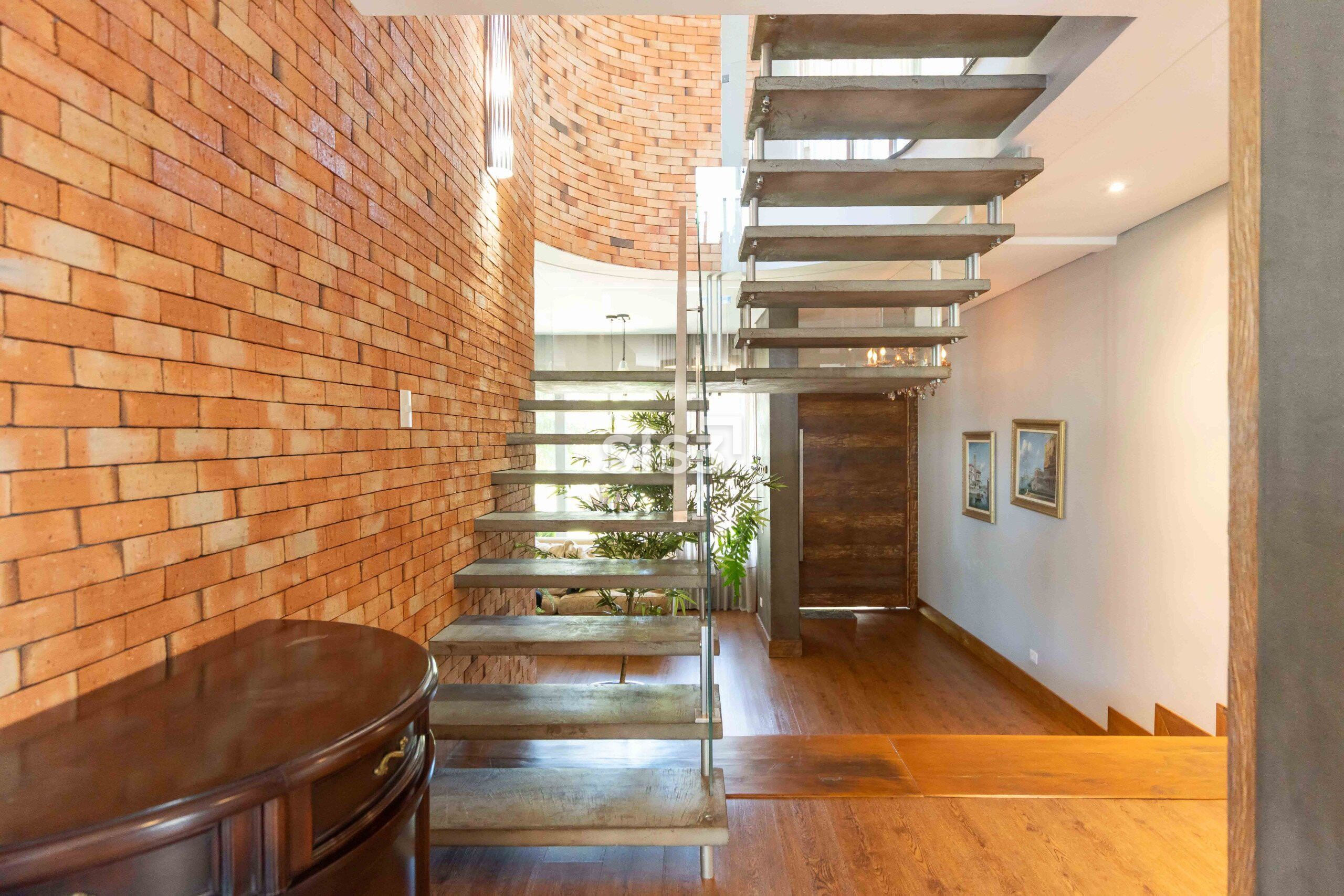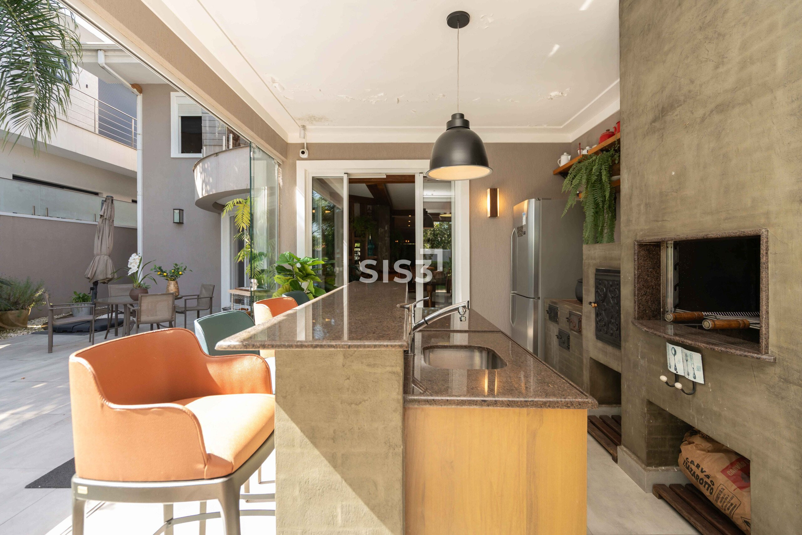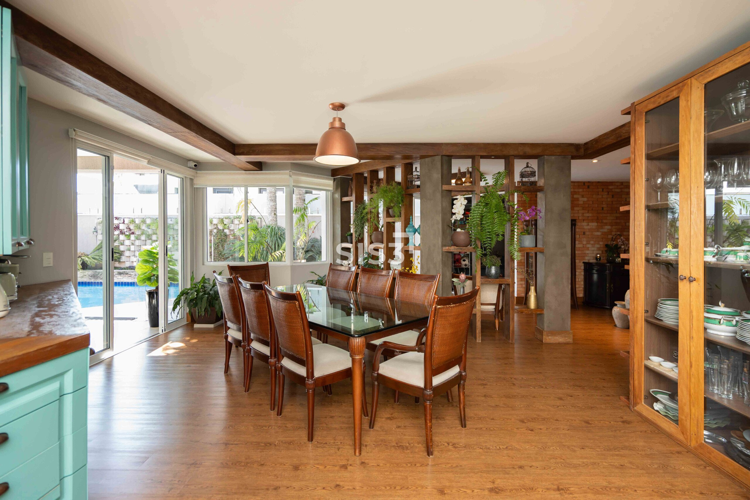 A área social combina madeira, concreto, vidro e tijolos aparentes em uma composição equilibrada e acolhedora. O living se integra à área externa, criando uma transição fluida entre interior e jardim, ideal para quem gosta de receber e viver a casa em diferentes momentos do dia.