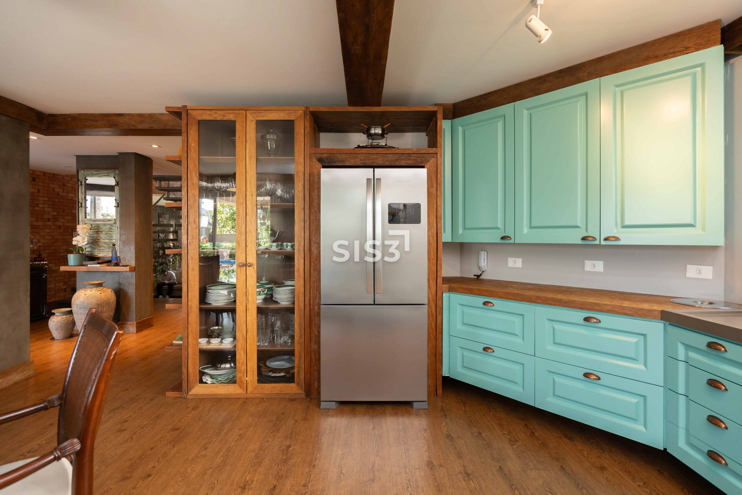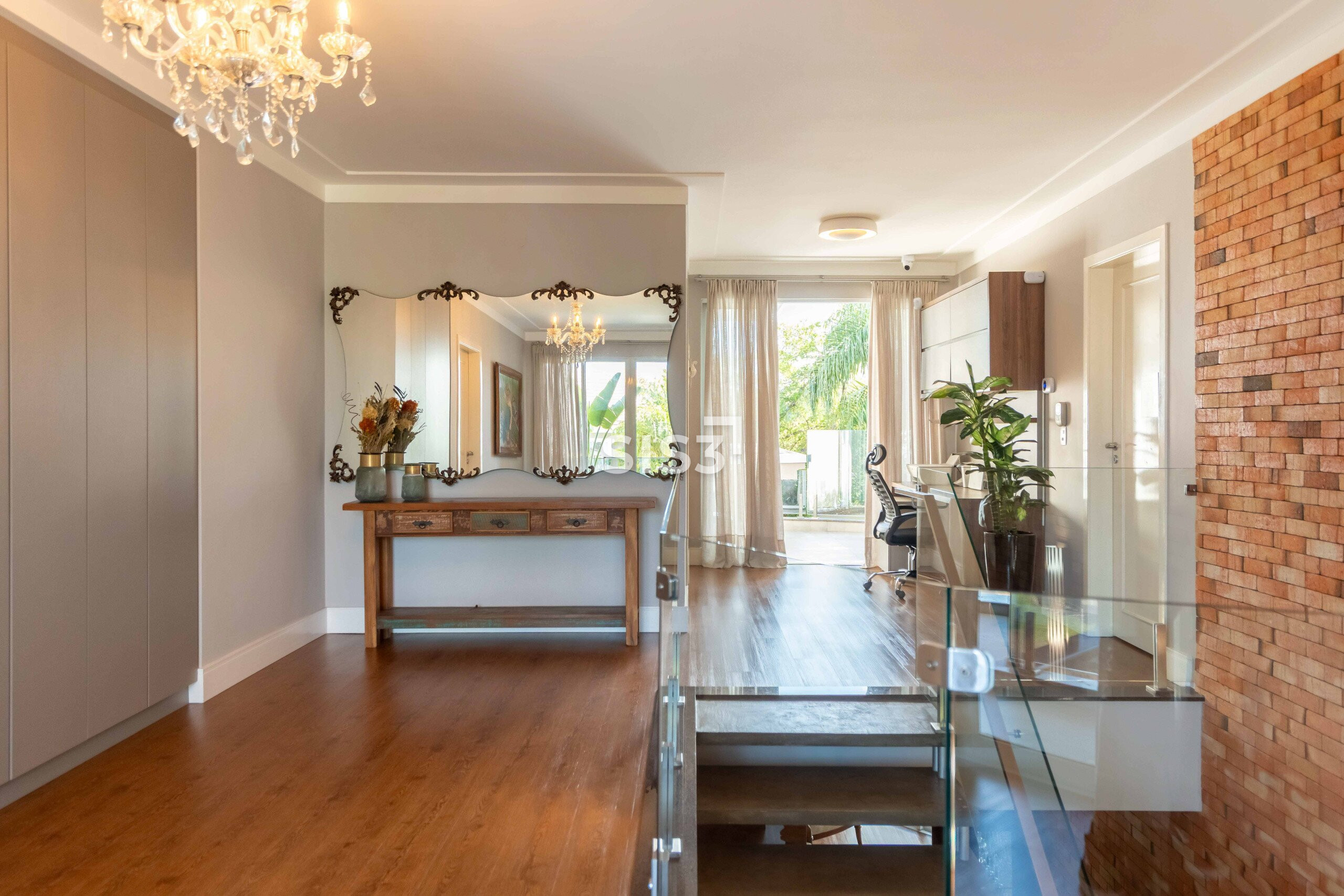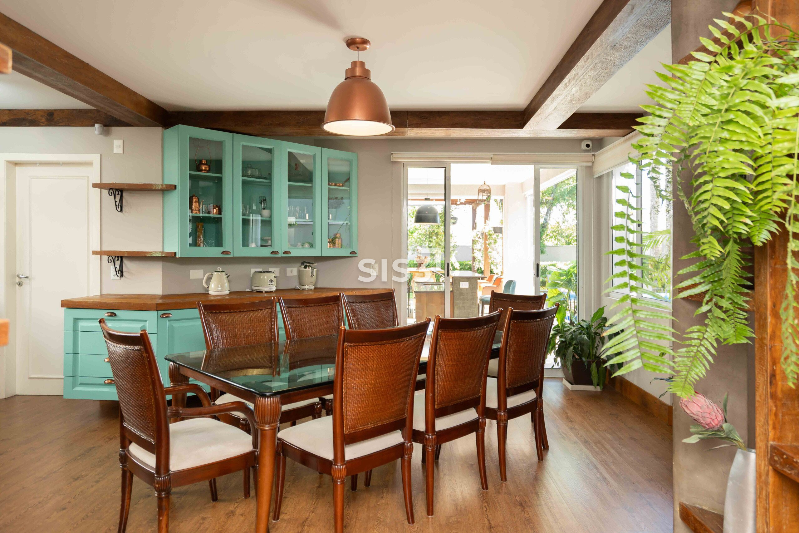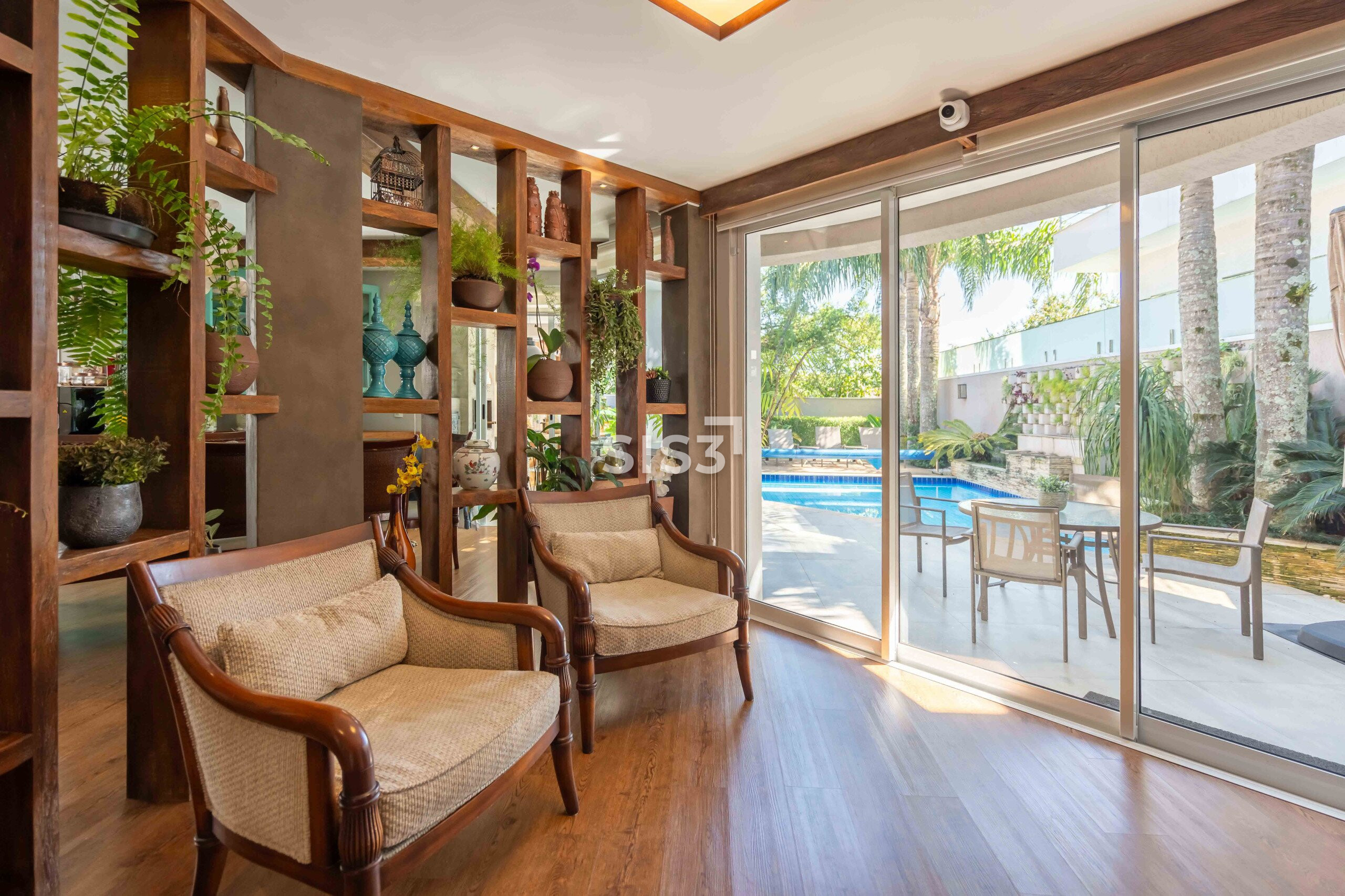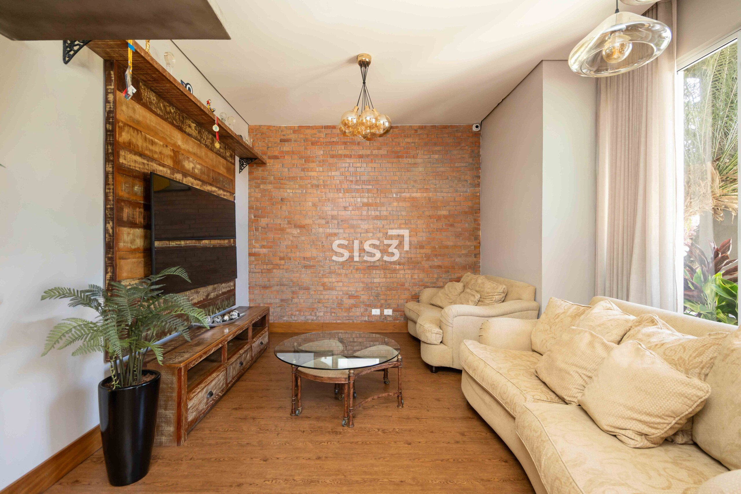 A área social combina madeira, concreto, vidro e tijolos aparentes em uma composição equilibrada e acolhedora. O living se integra à área externa, criando uma transição fluida entre interior e jardim, ideal para quem gosta de receber e viver a casa em diferentes momentos do dia.