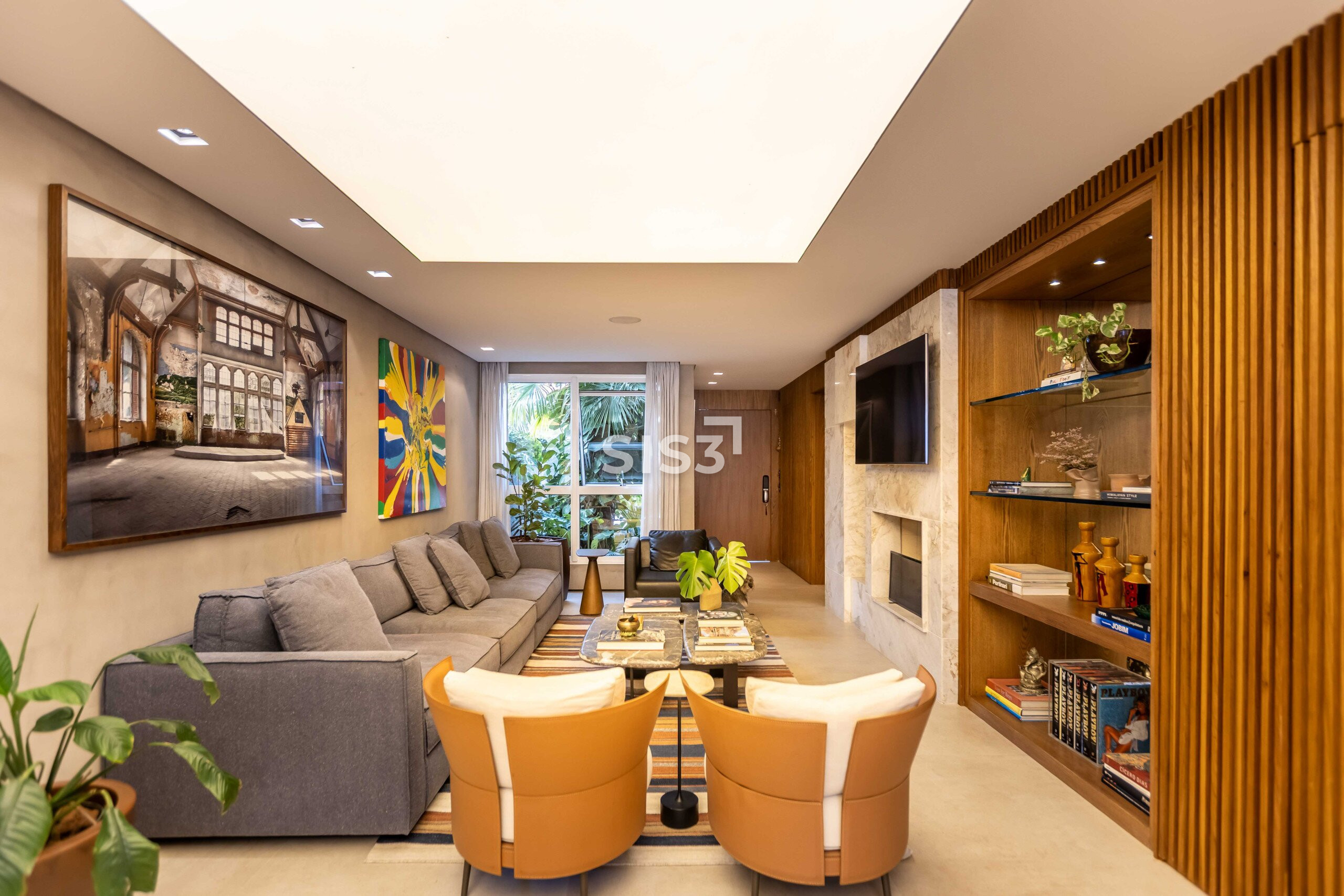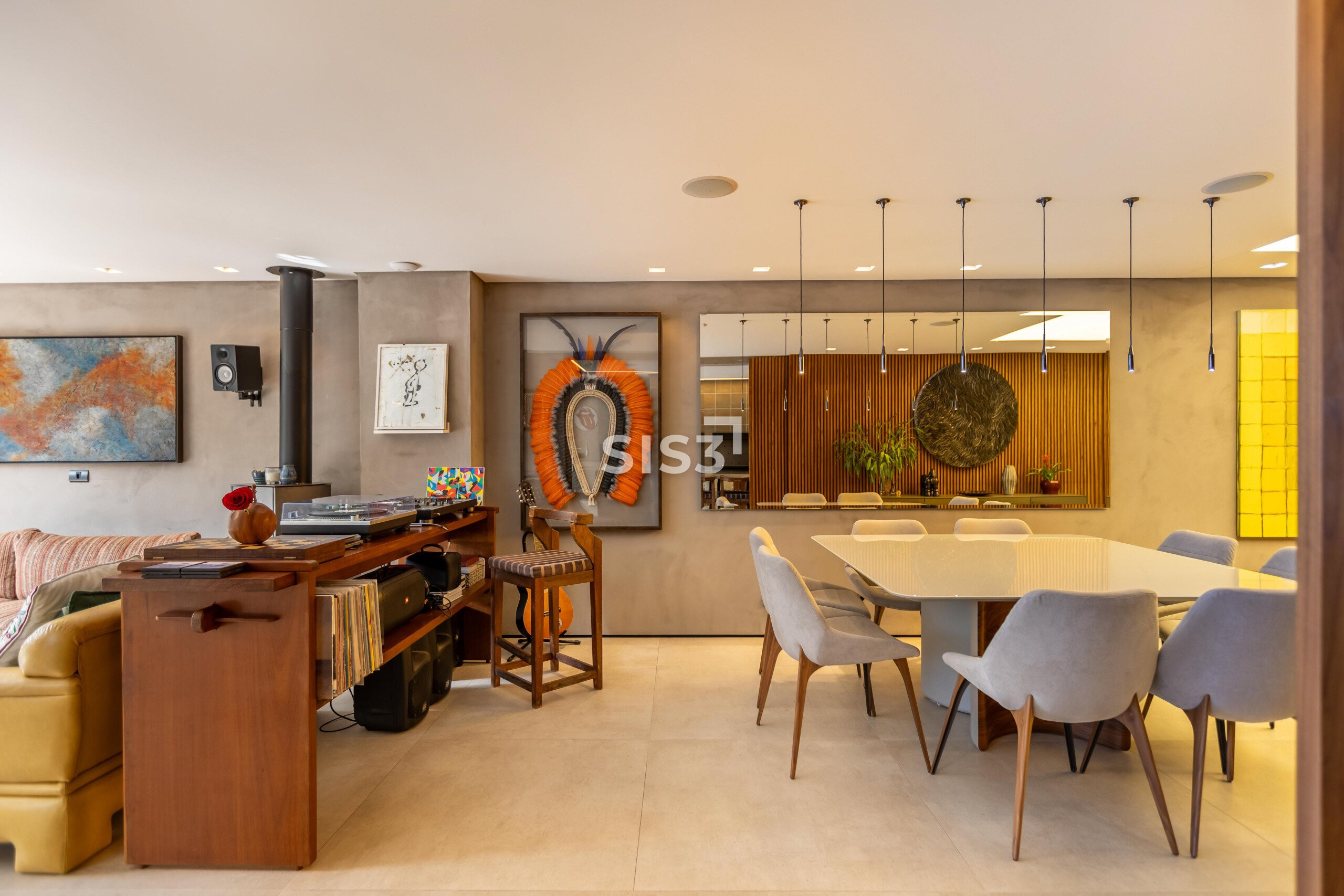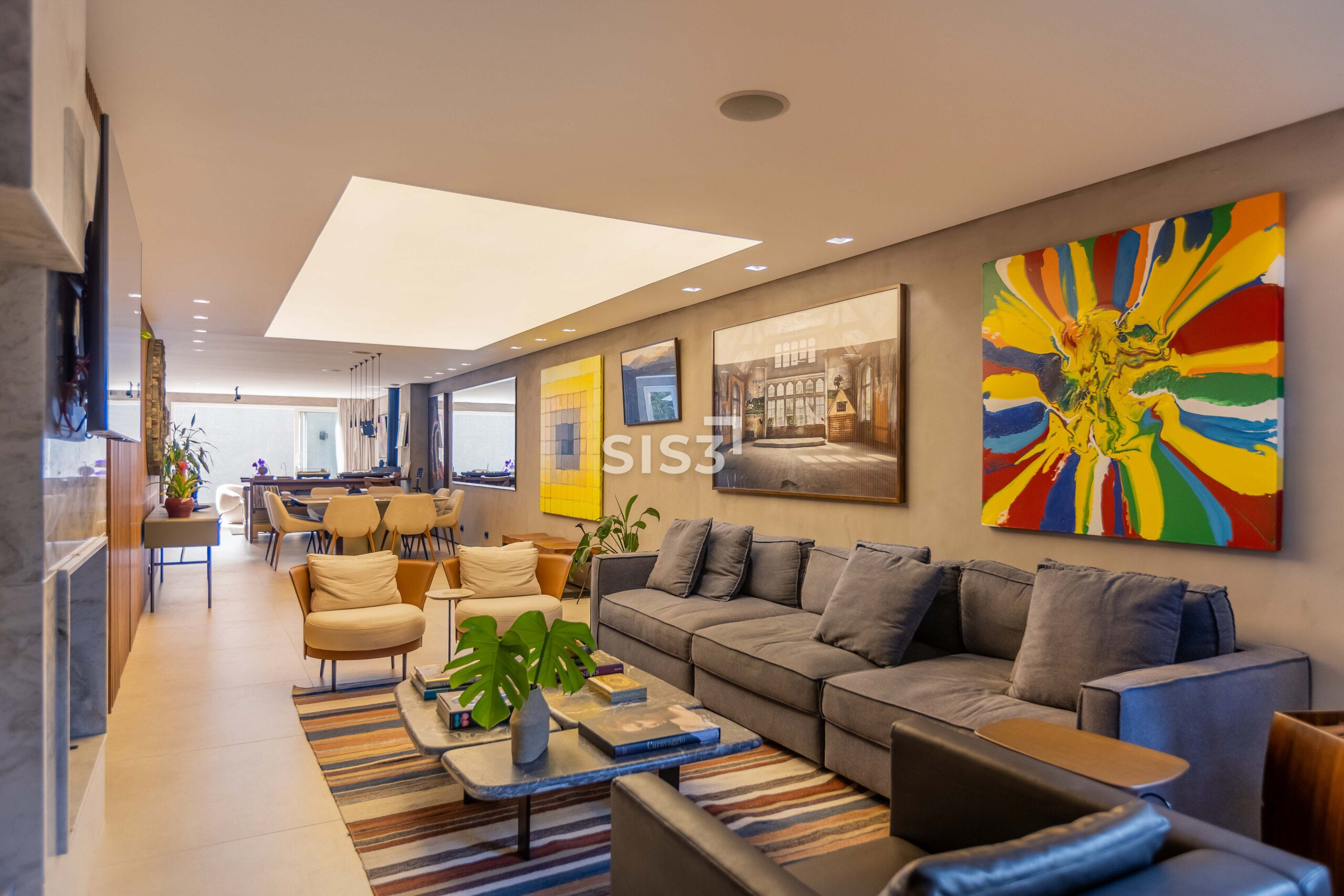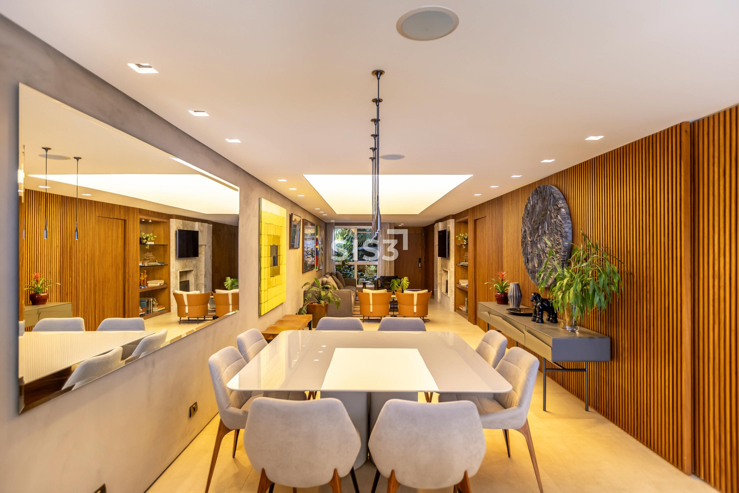 A sala integrada ganha protagonismo com uma luminária que simula uma claraboia, um recurso luminotécnico que cria uma atmosfera natural, leve e absolutamente