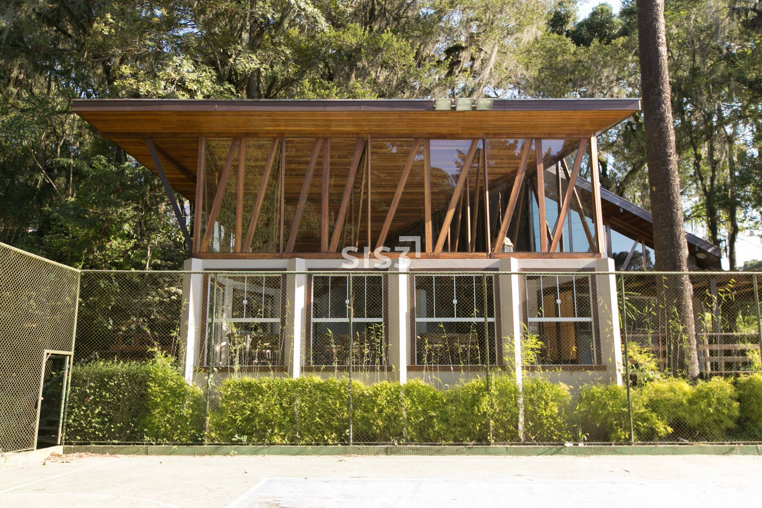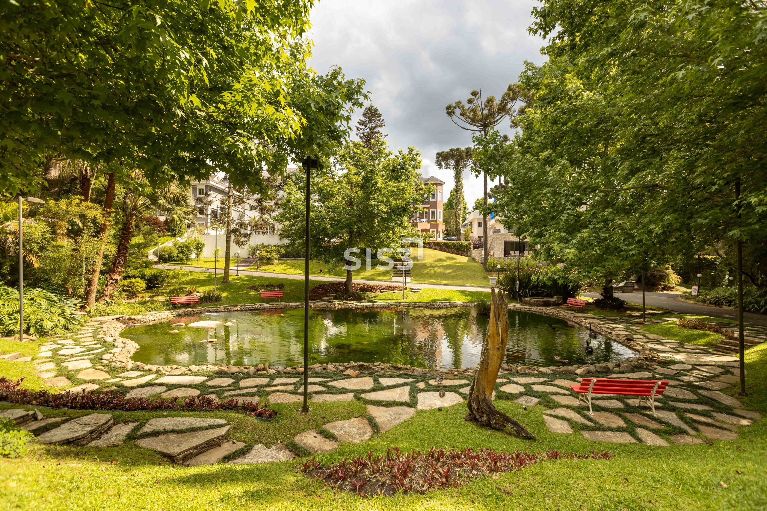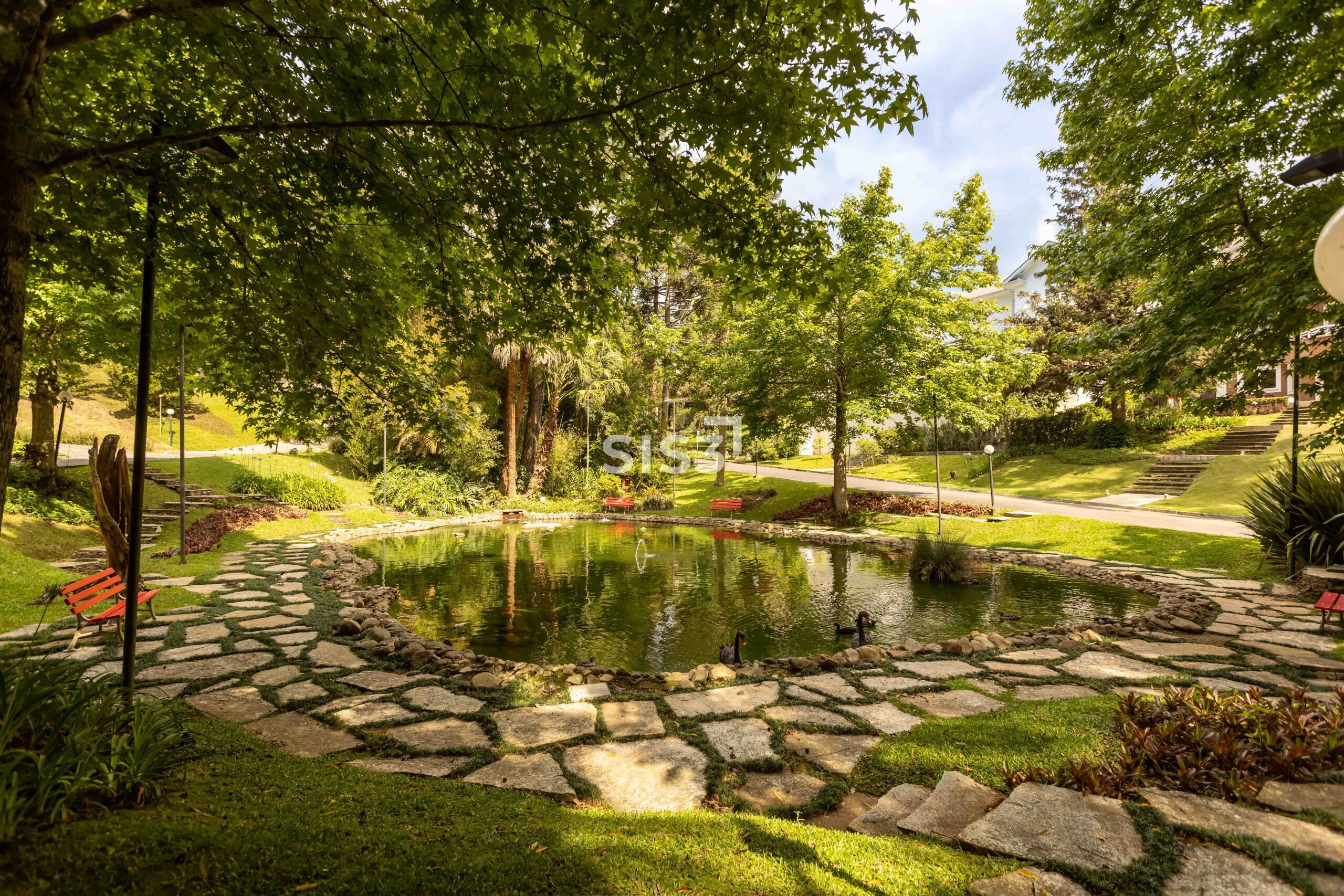 No condomínio, lago, trilha entre árvores, quadra e salão reforçam a sensação de morar cercado pela natureza, com estrutura e conforto.