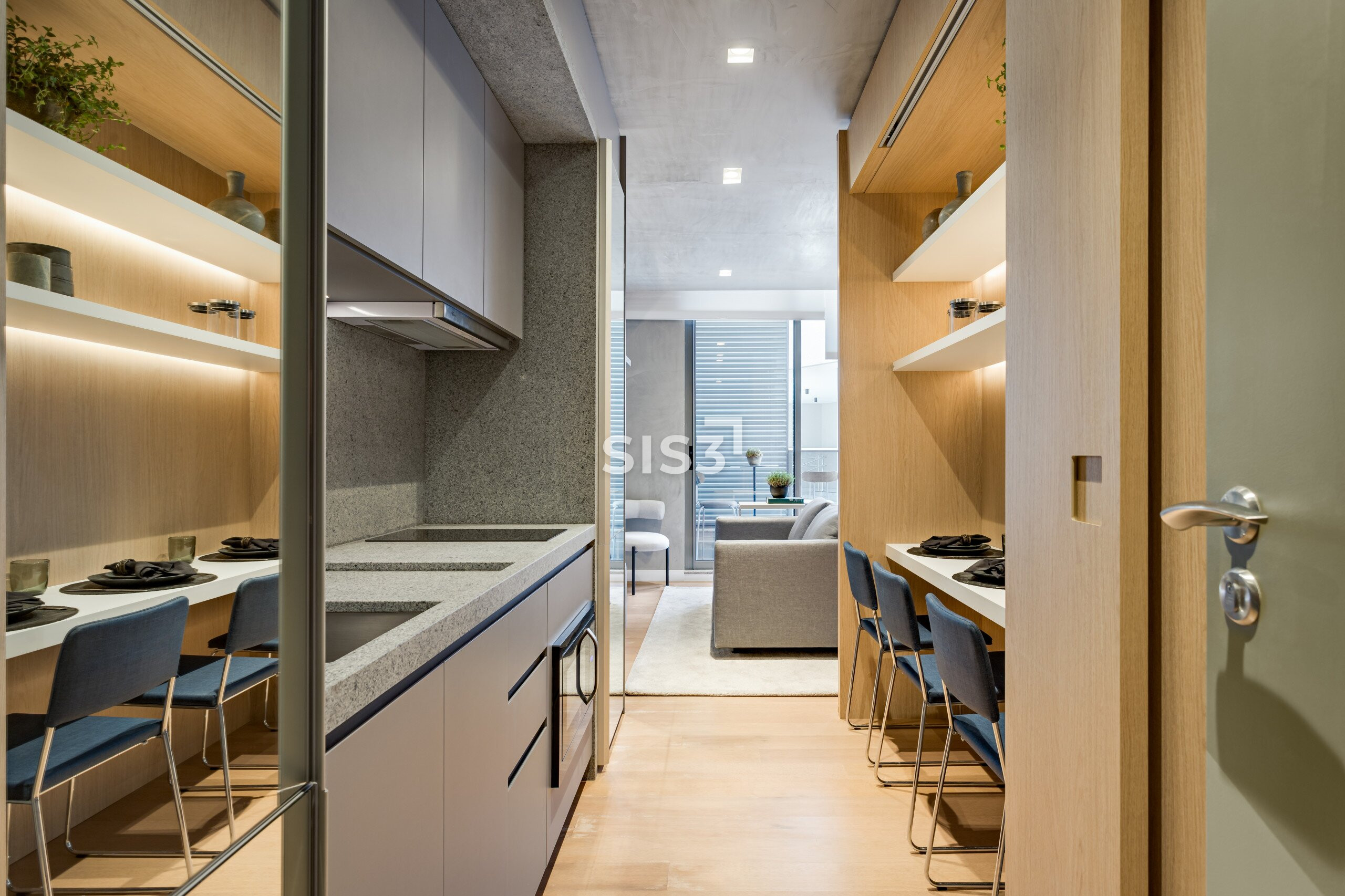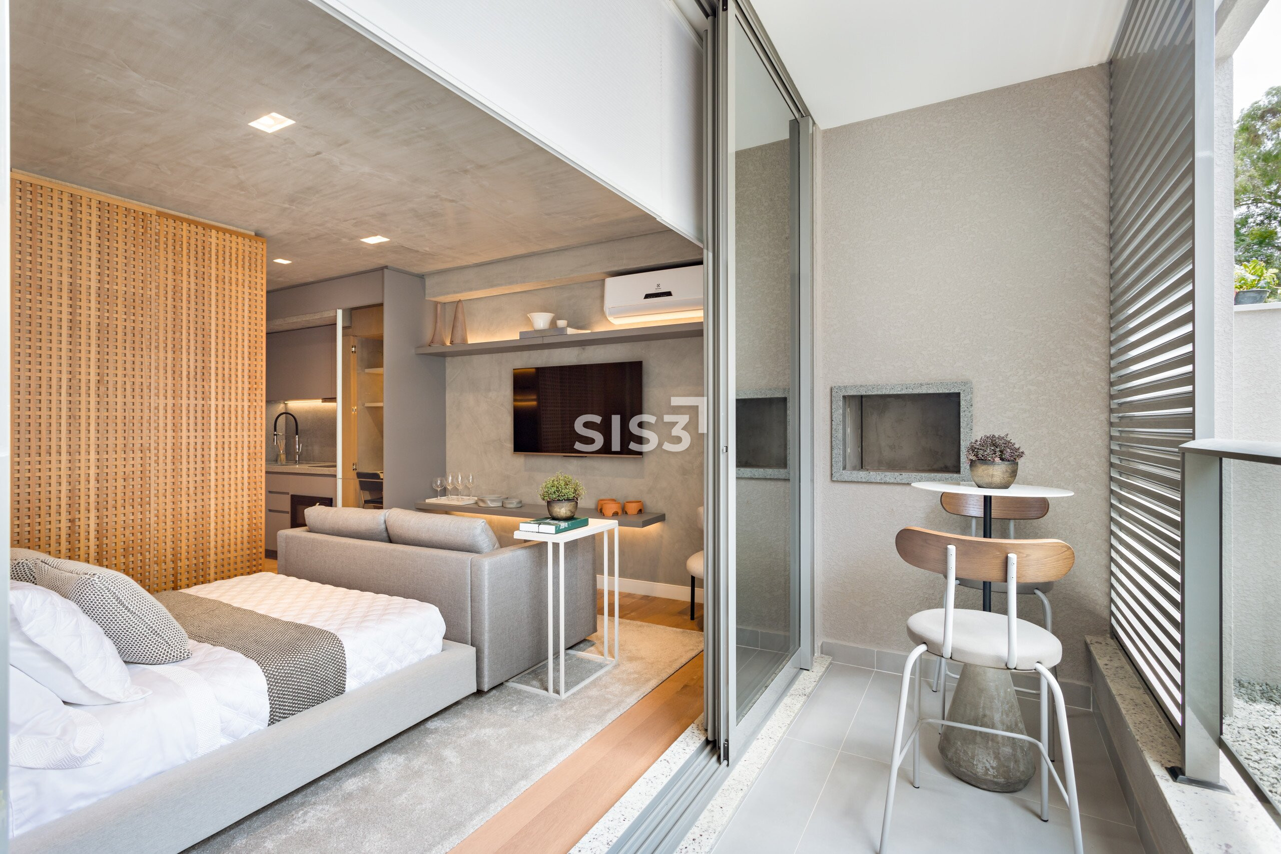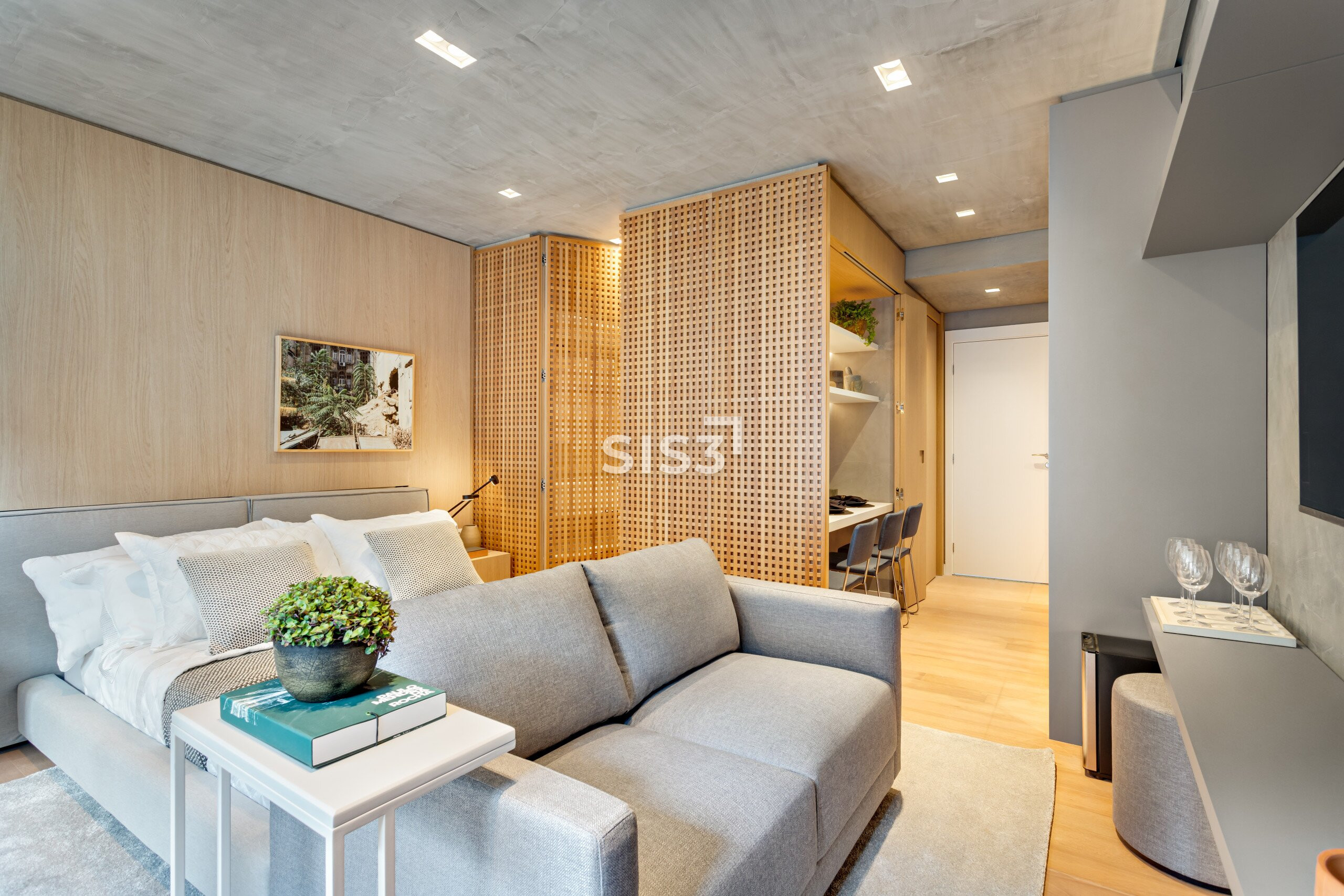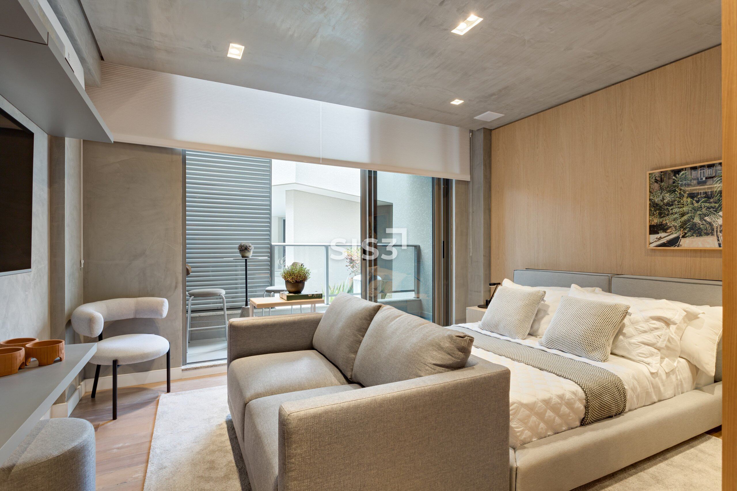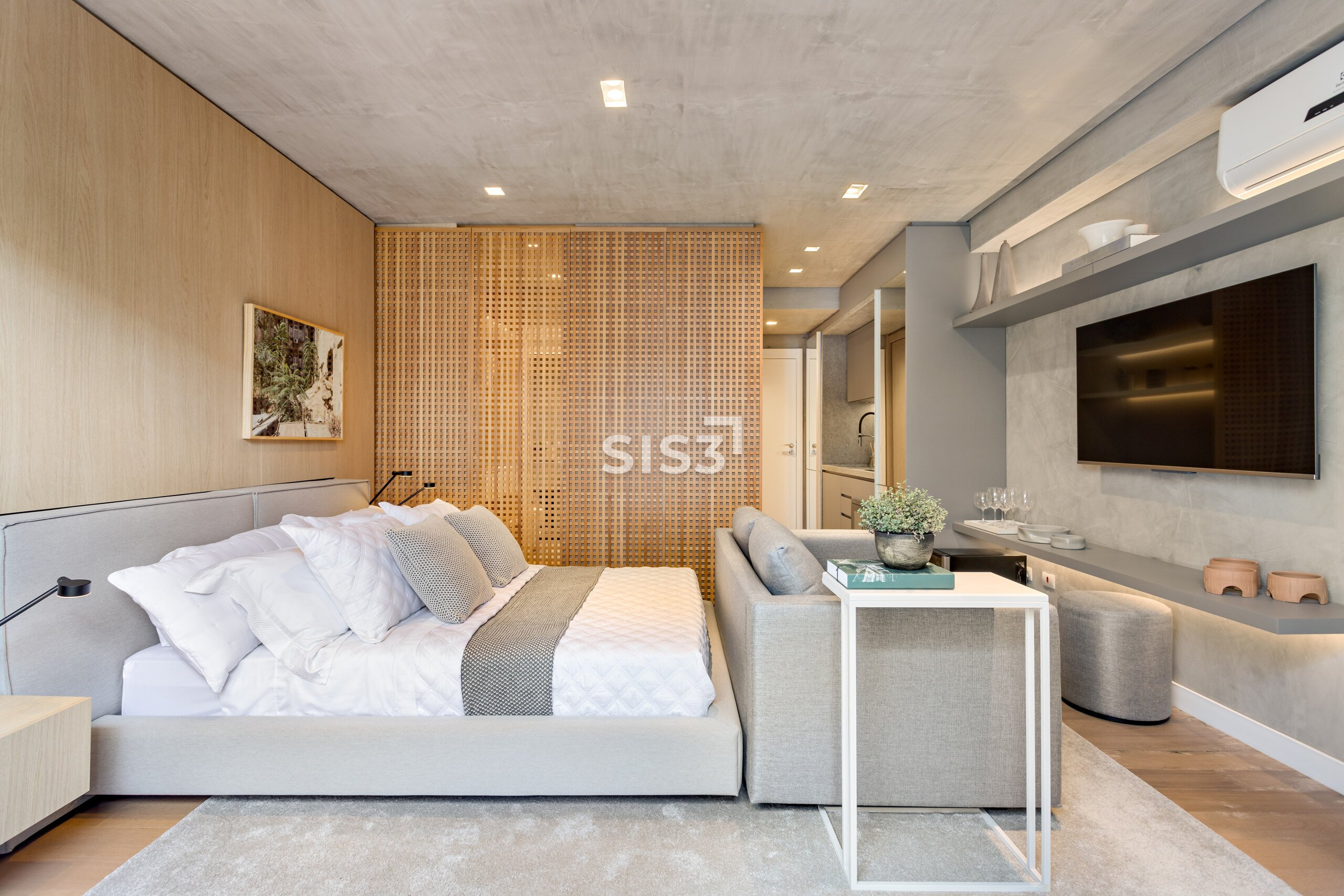 Com layout minimalista e bem planejado, o studio conta com uma suíte, banheiro e cozinha, organizados para aproveitar cada metro de maneira eficiente. O apartamento está vazio, mas as fotos do decorado servem como inspiração para quem deseja visualizar o potencial do espaço e criar um ambiente personalizado.