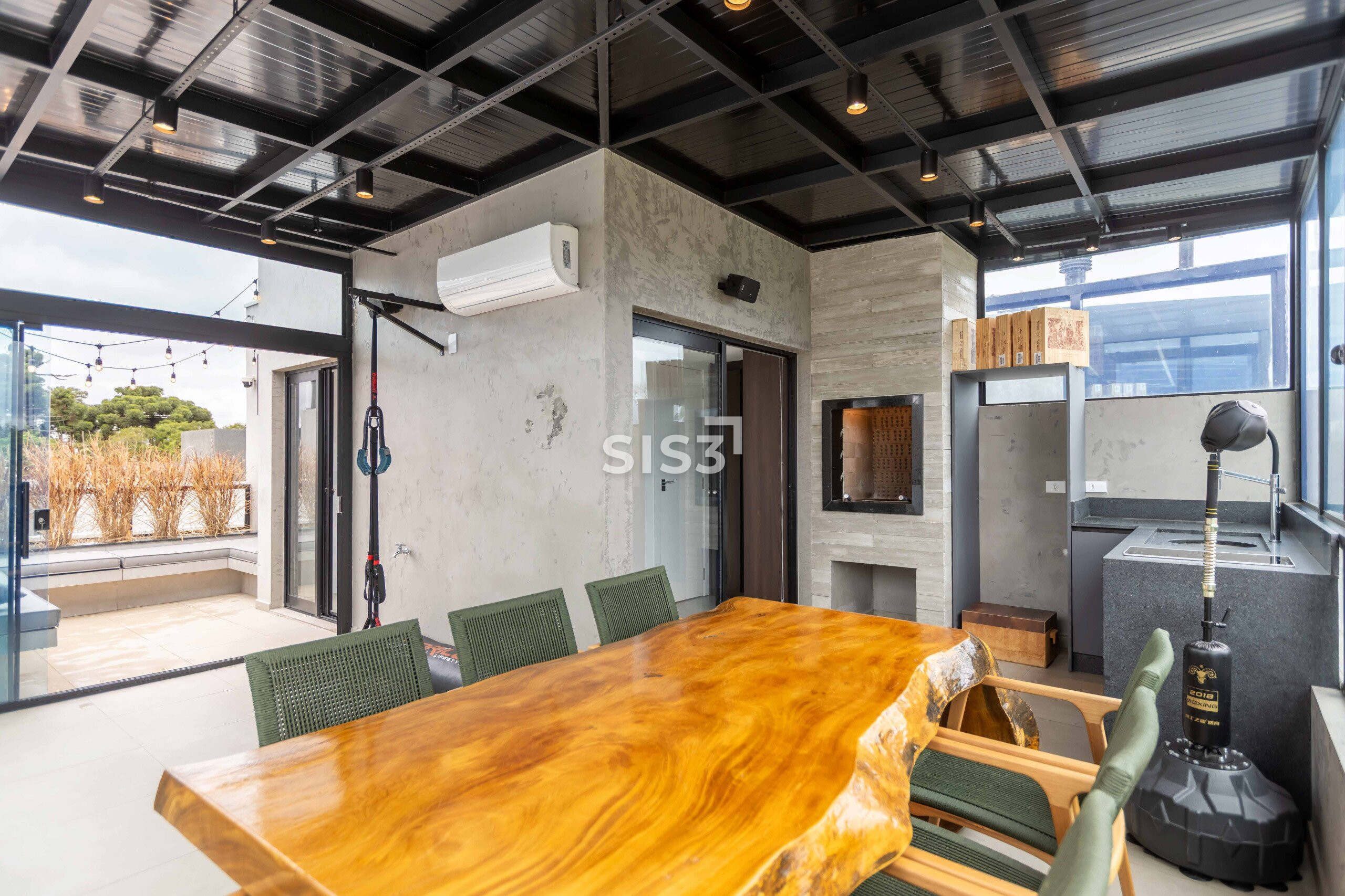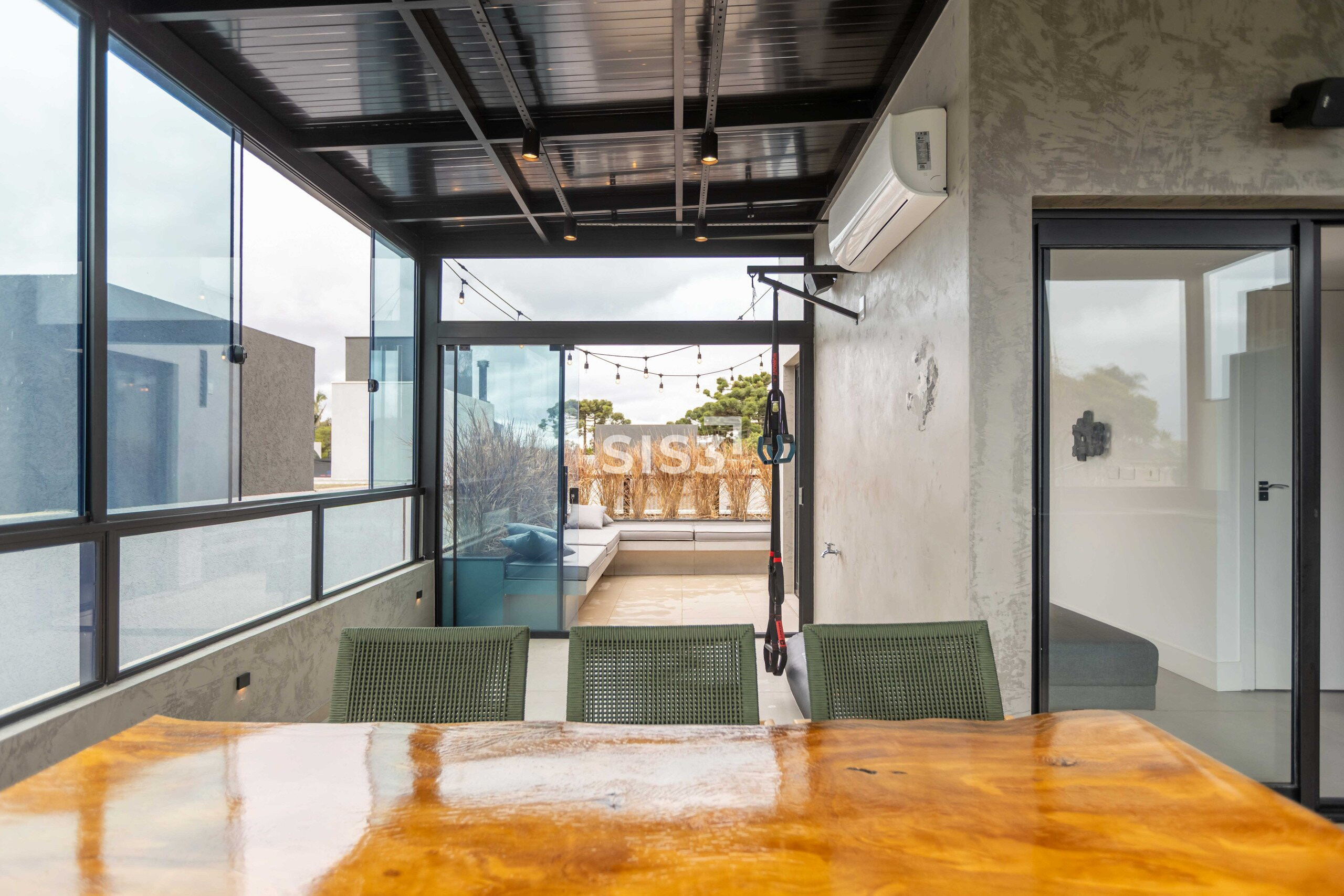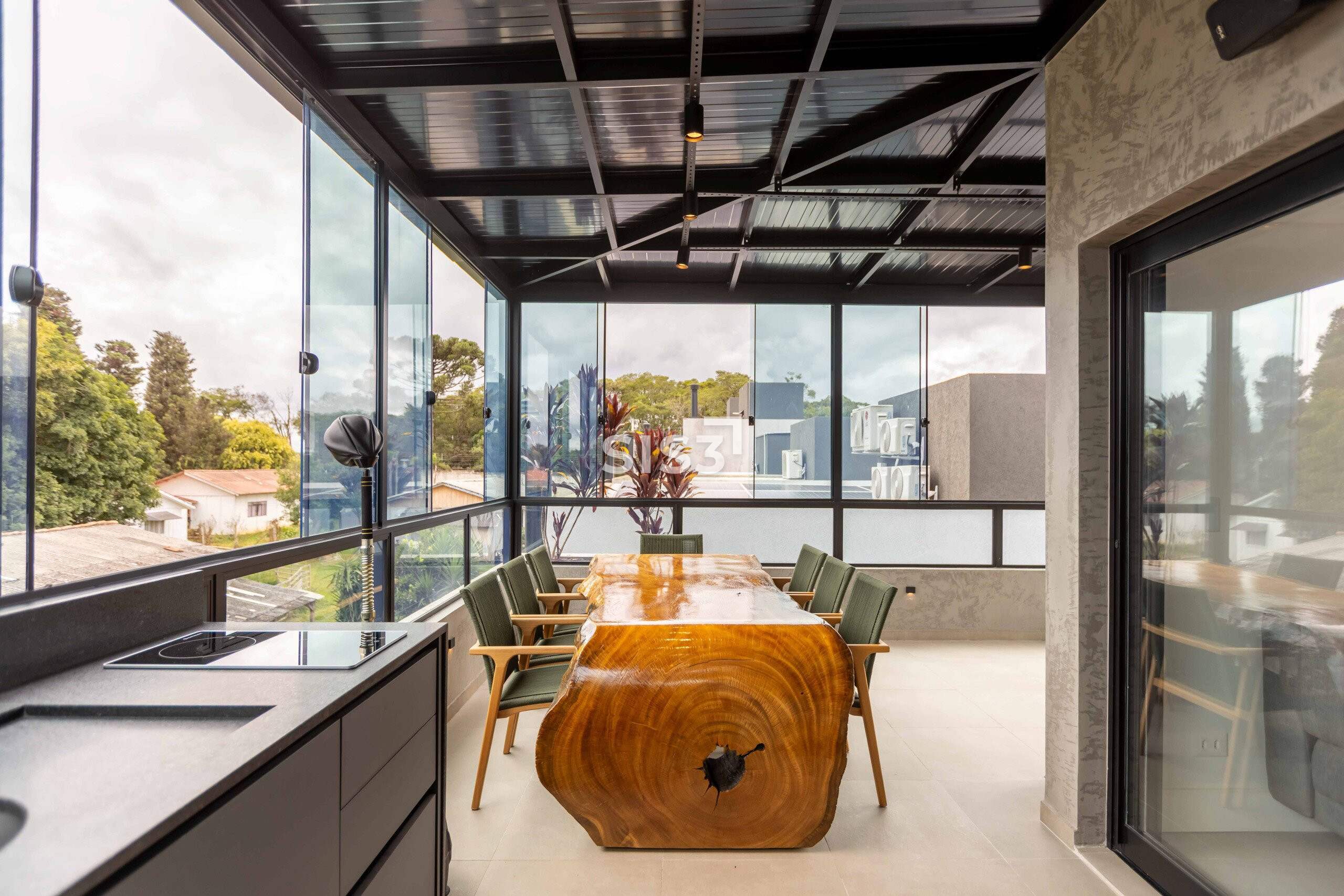 O ático amplia a experiência da casa. Um espaço versátil, com churrasqueira a carvão, fechamento em vidro e acesso a um terraço externo com sofá, perfeito para momentos mais descontraídos, com vista aberta e um respiro ao ar livre.
