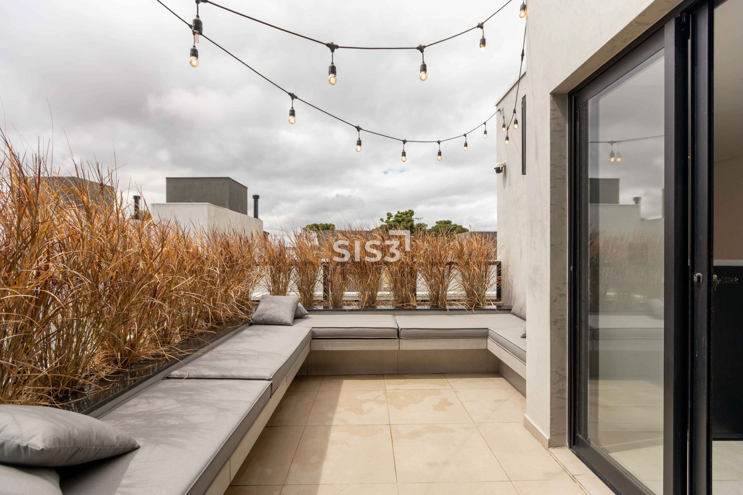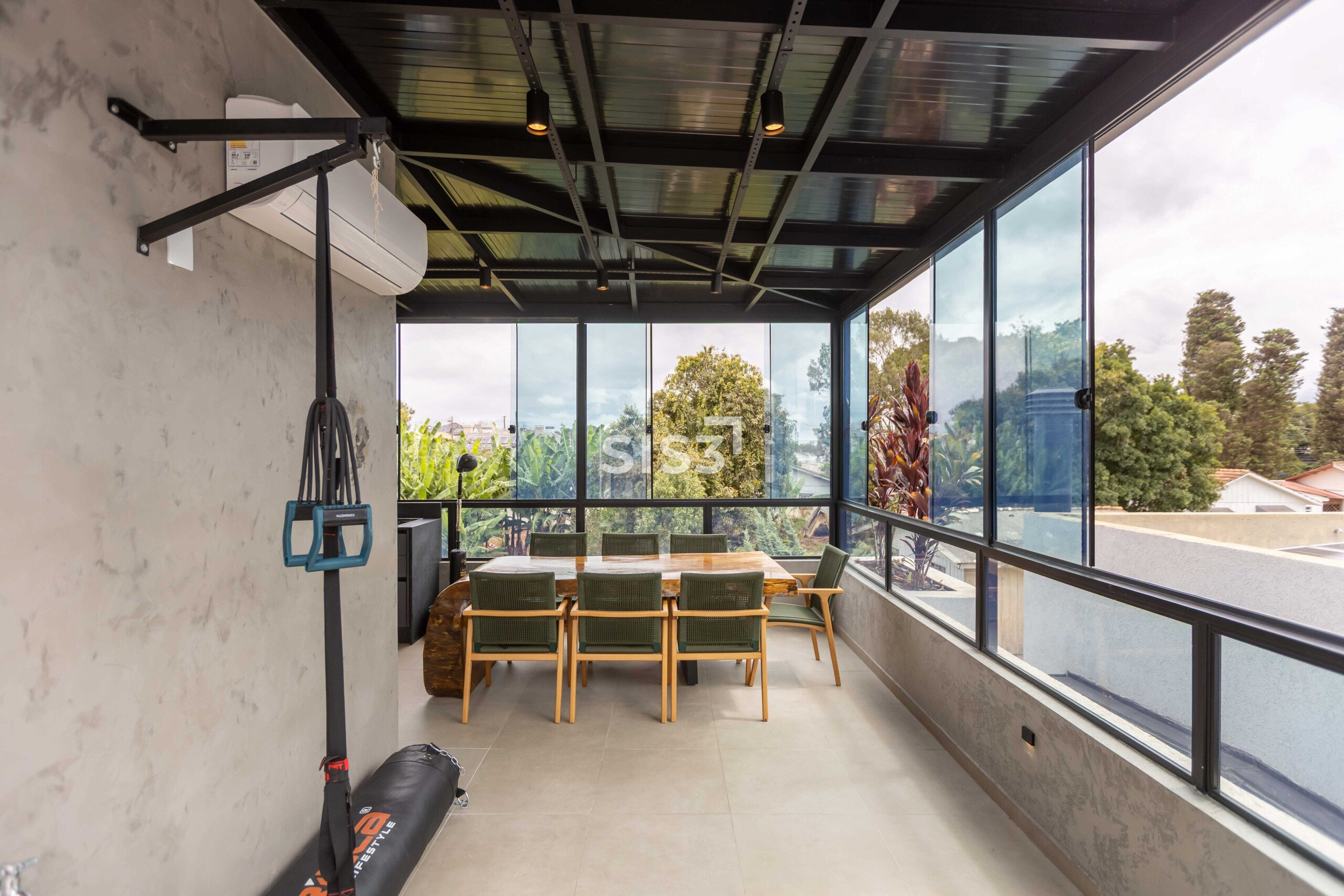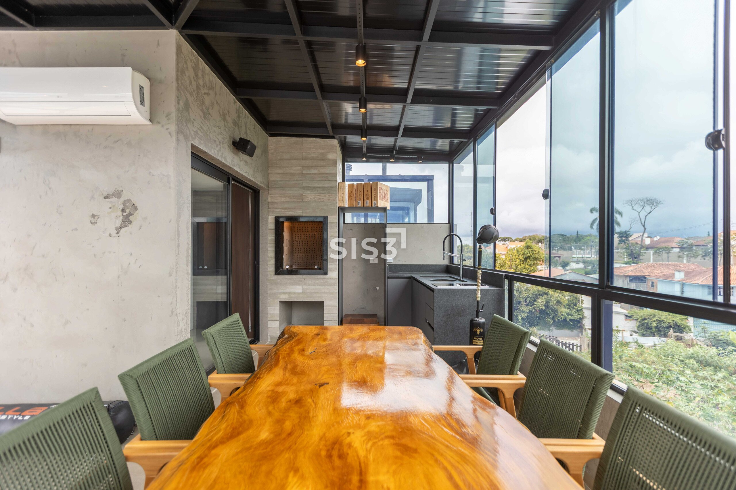 O ático amplia a experiência da casa. Um espaço versátil, com churrasqueira a carvão, fechamento em vidro e acesso a um terraço externo com sofá, perfeito para momentos mais descontraídos, com vista aberta e um respiro ao ar livre.