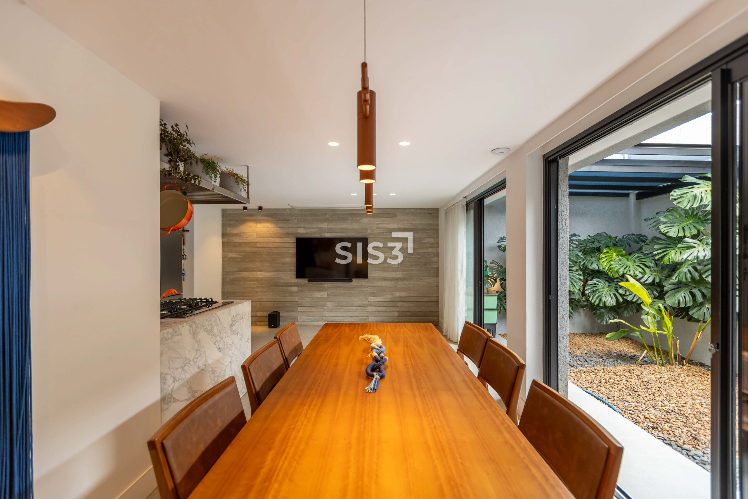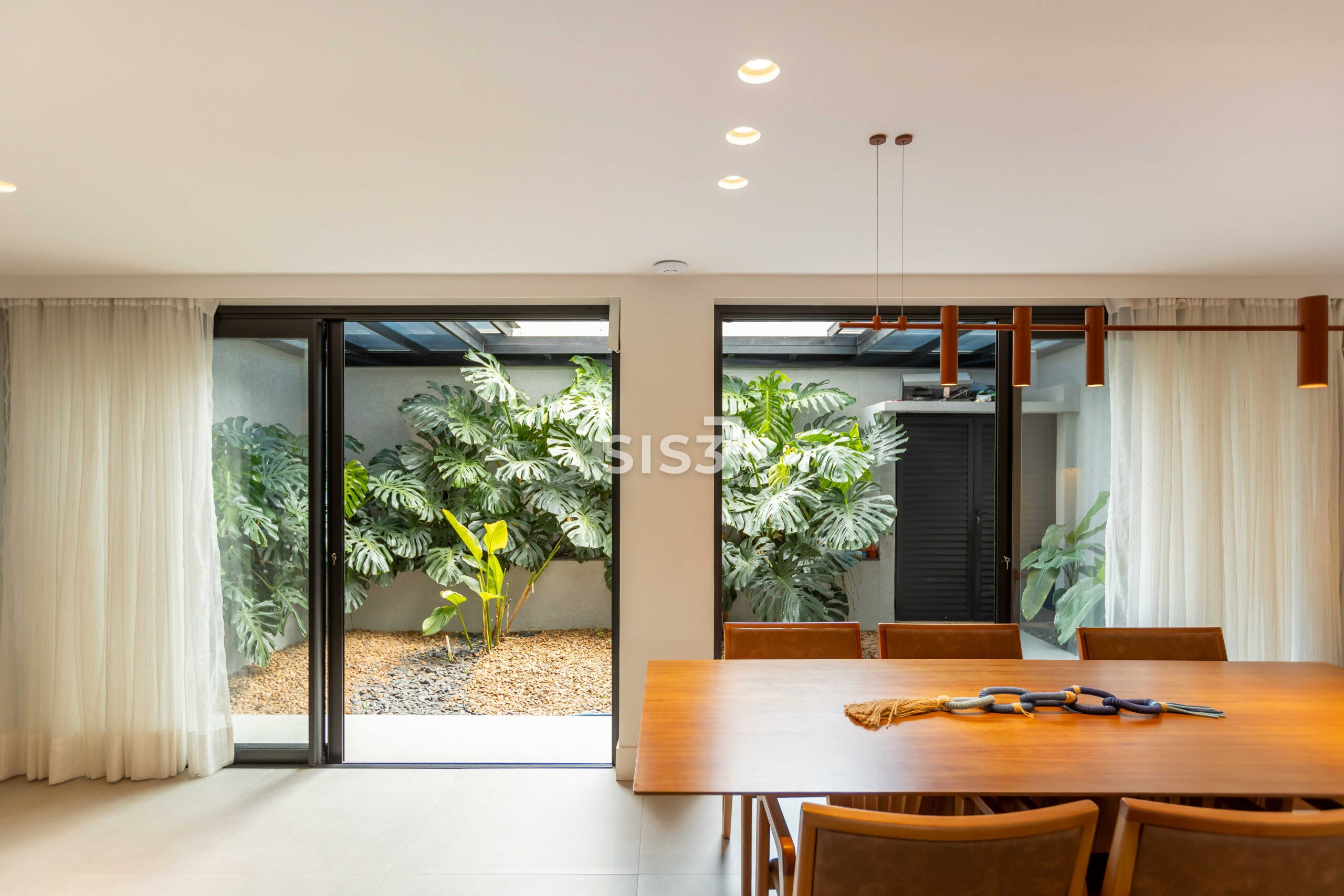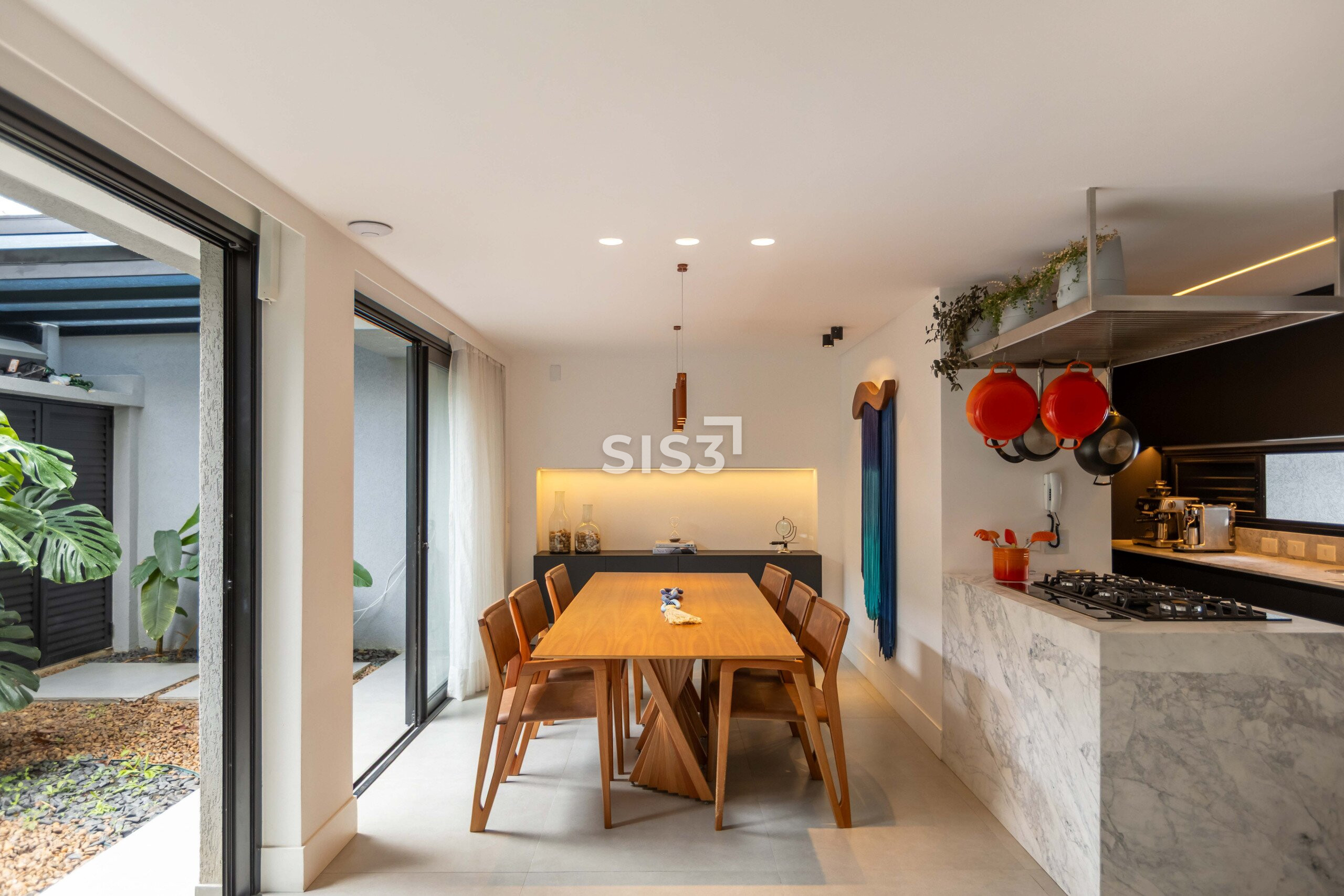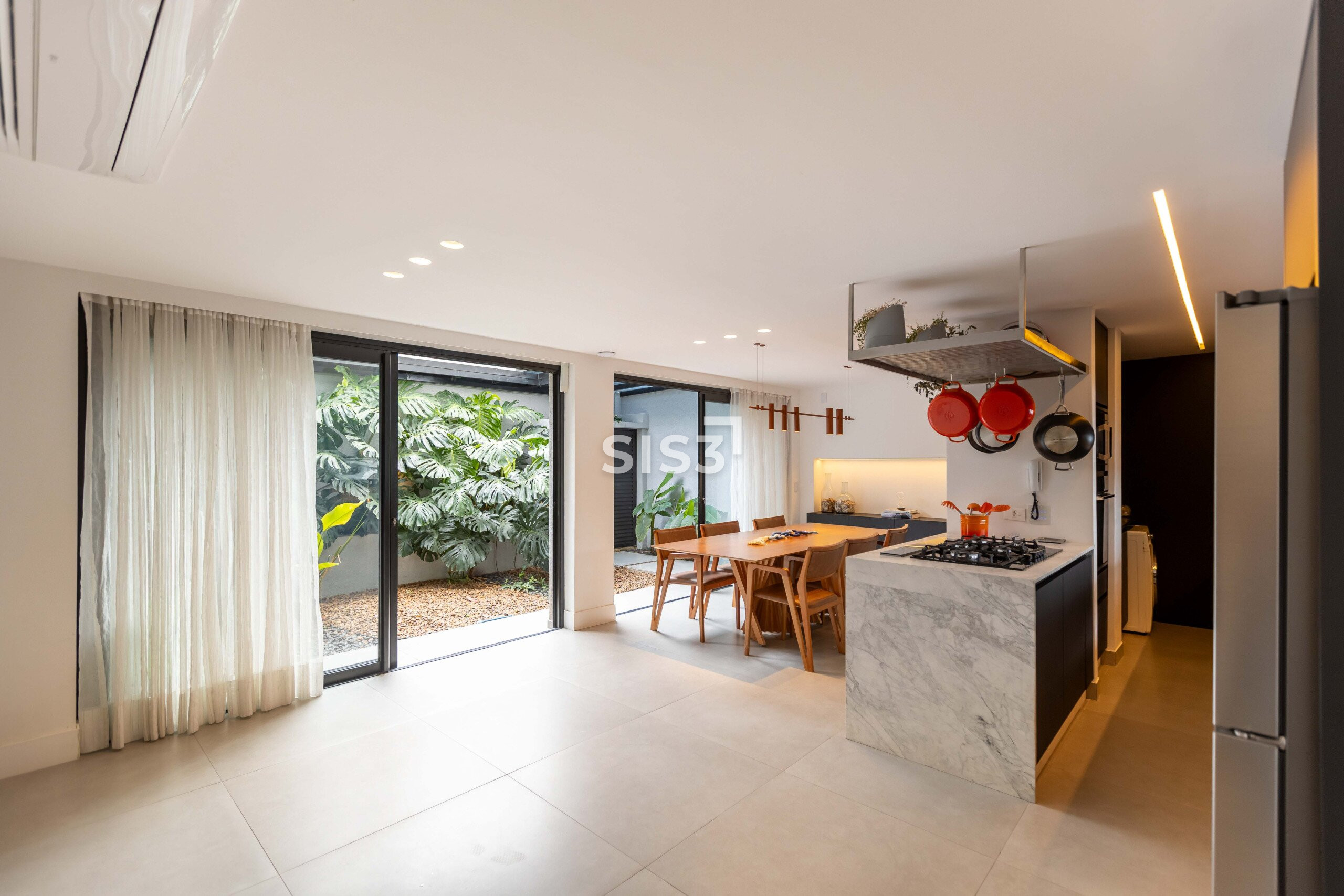 A área social é aberta e bem resolvida, com cozinha integrada à sala de jantar e estar. As grandes aberturas em vidro revelam um pátio interno com paisagismo, trazendo o verde para dentro e criando uma atmosfera agradável ao longo do dia.