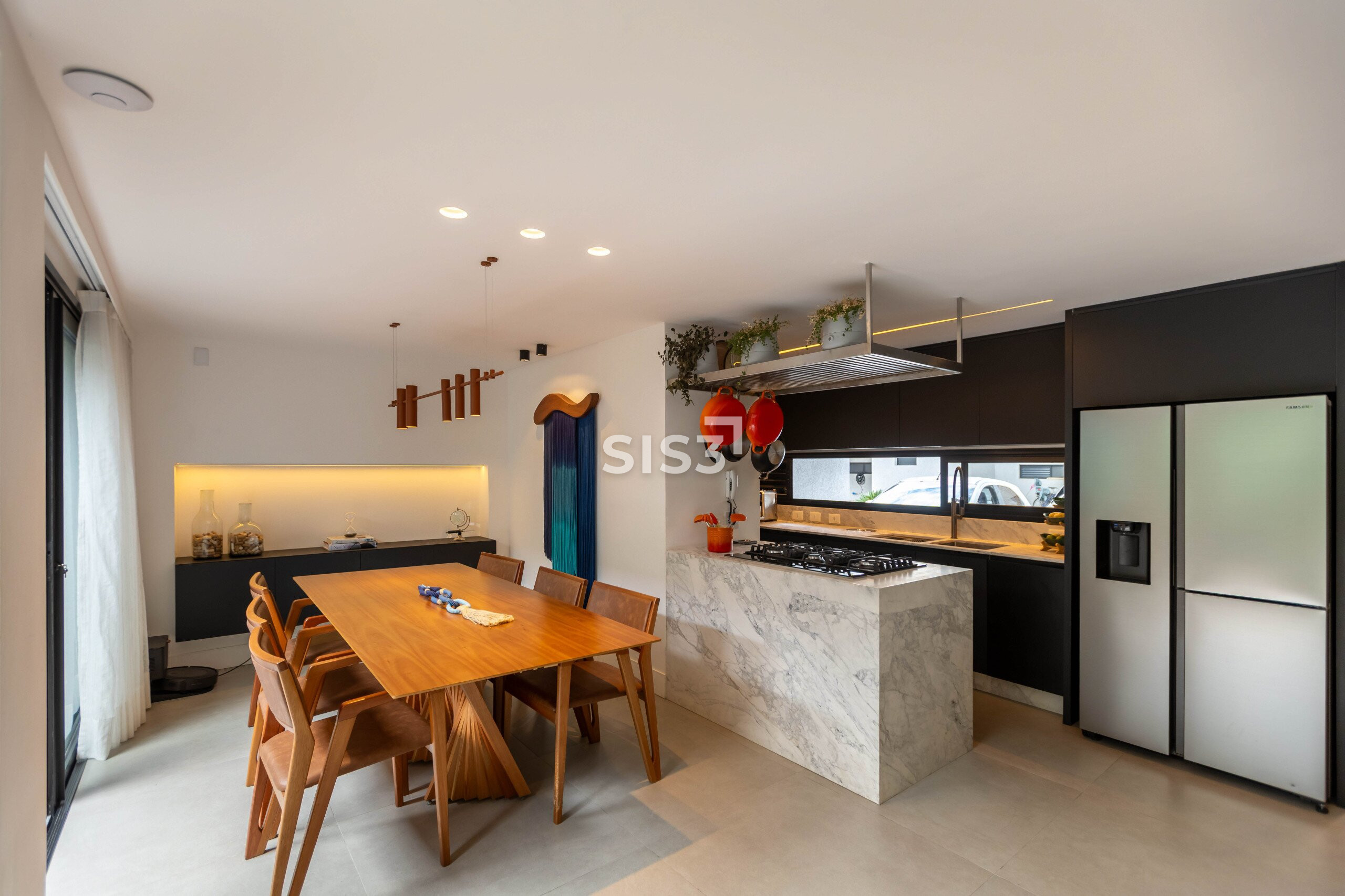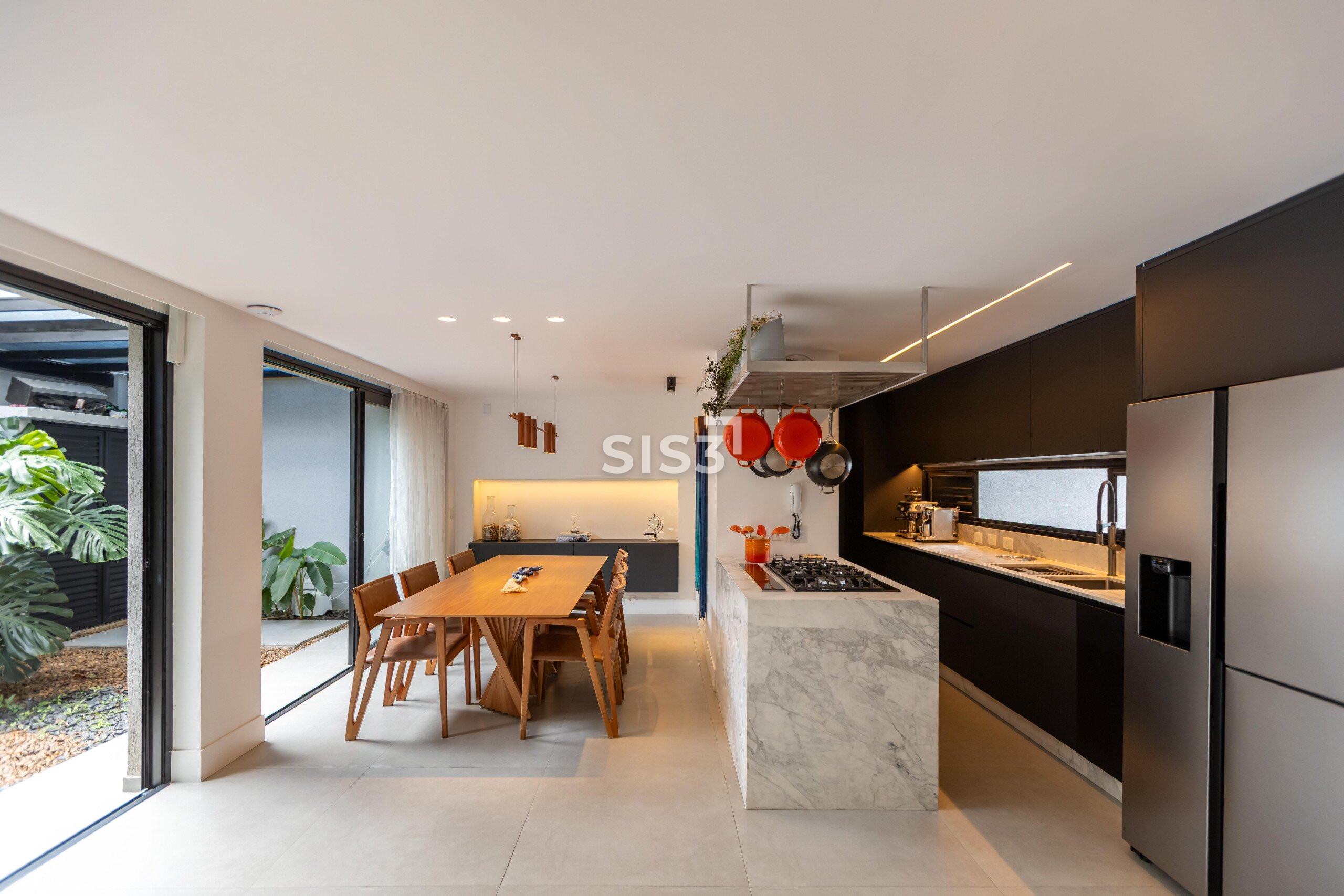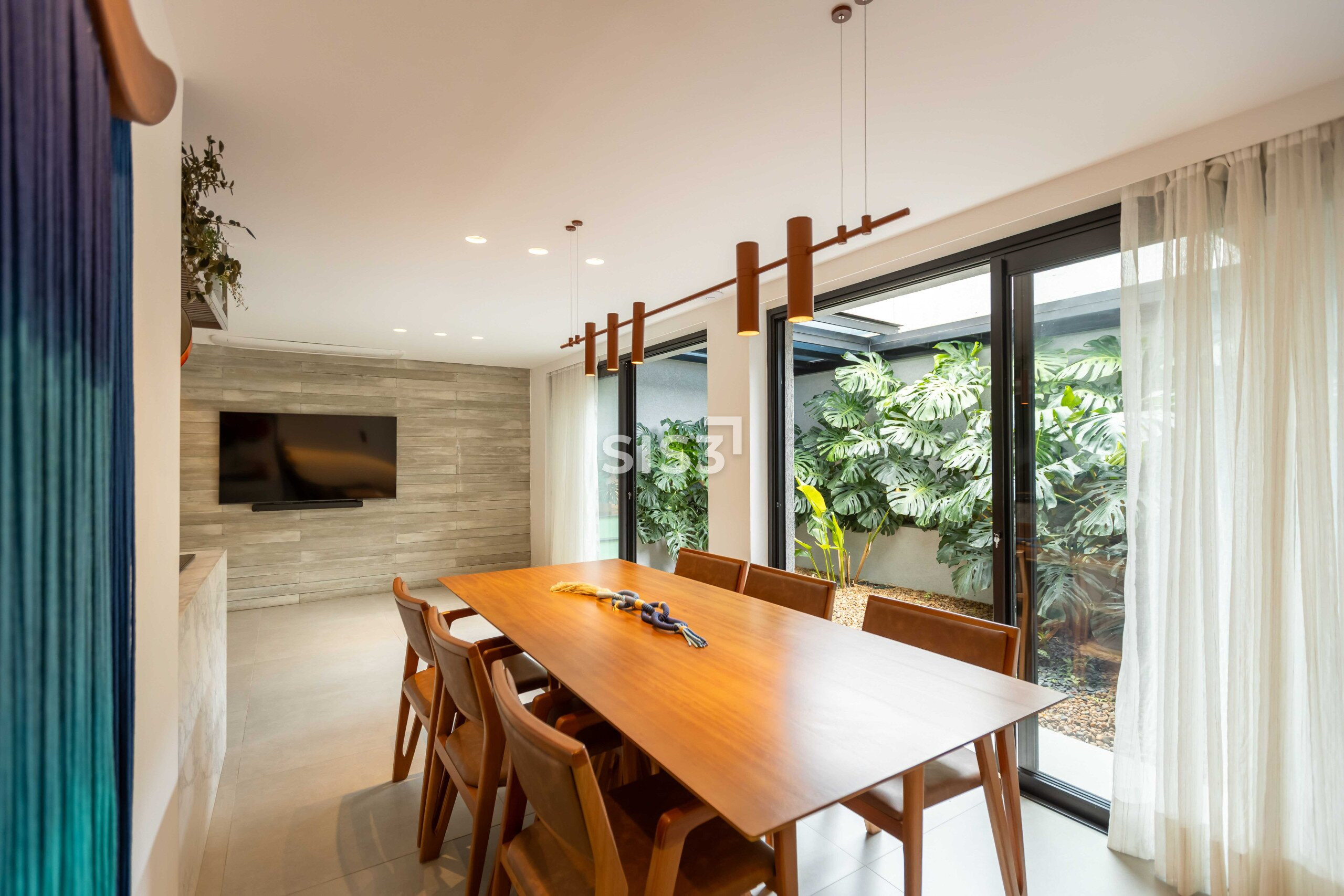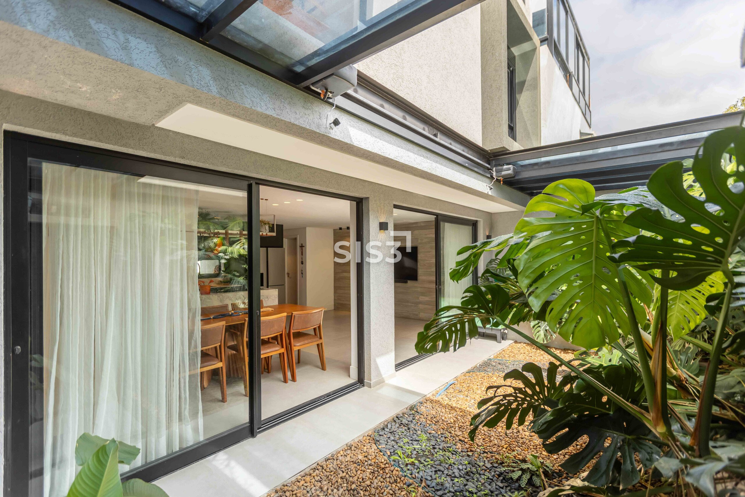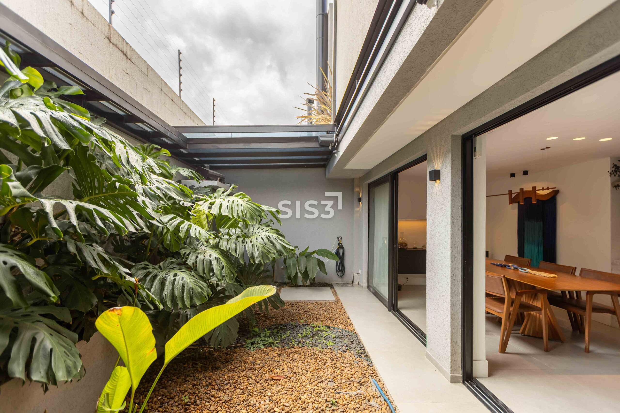 A área social é aberta e bem resolvida, com cozinha integrada à sala de jantar e estar. As grandes aberturas em vidro revelam um pátio interno com paisagismo, trazendo o verde para dentro e criando uma atmosfera agradável ao longo do dia.