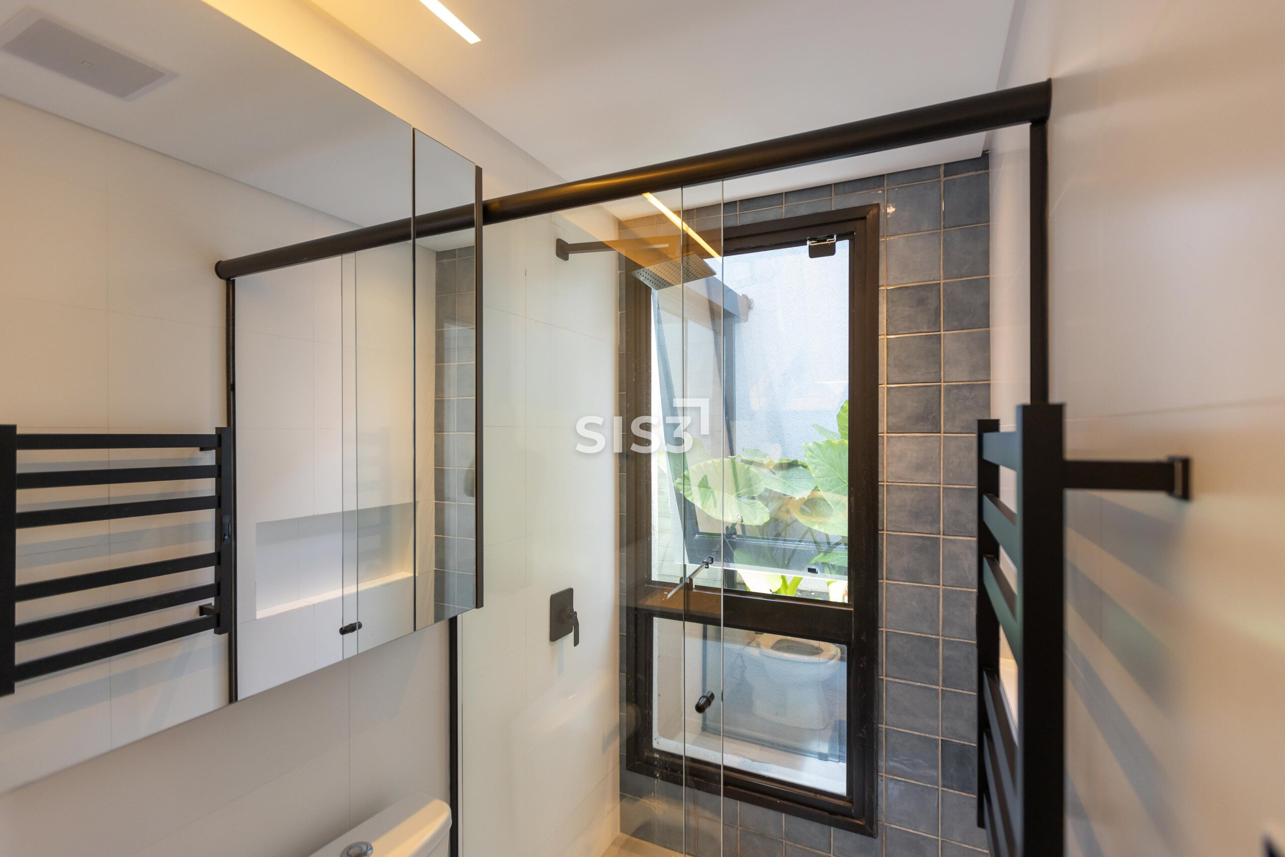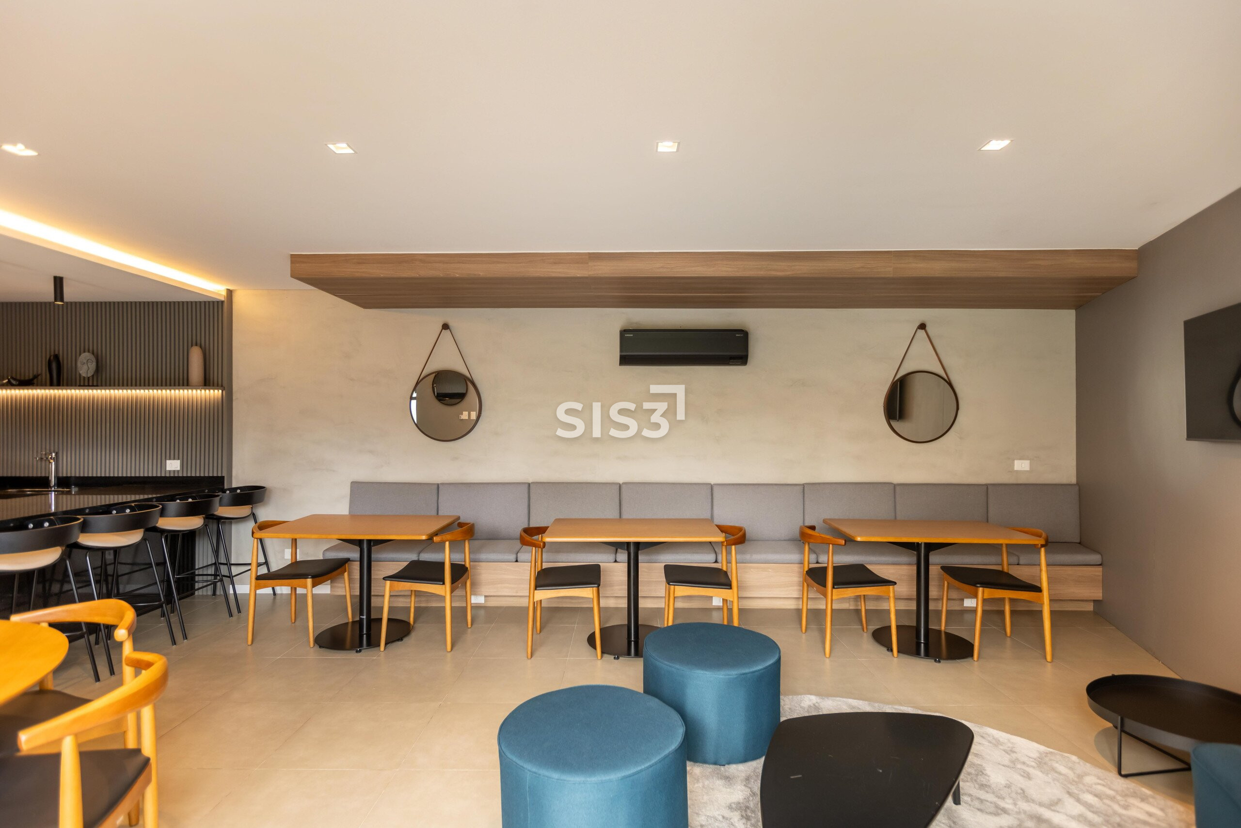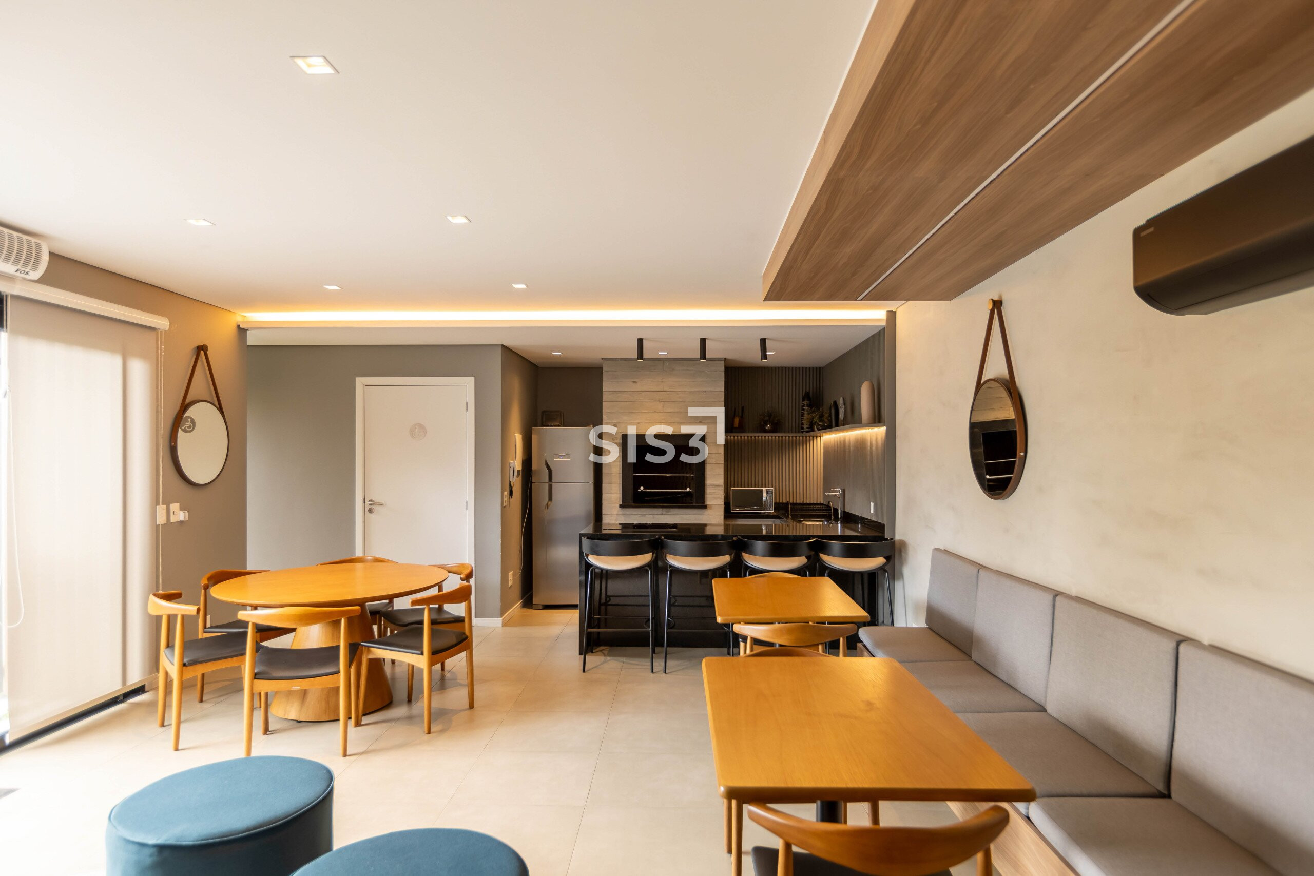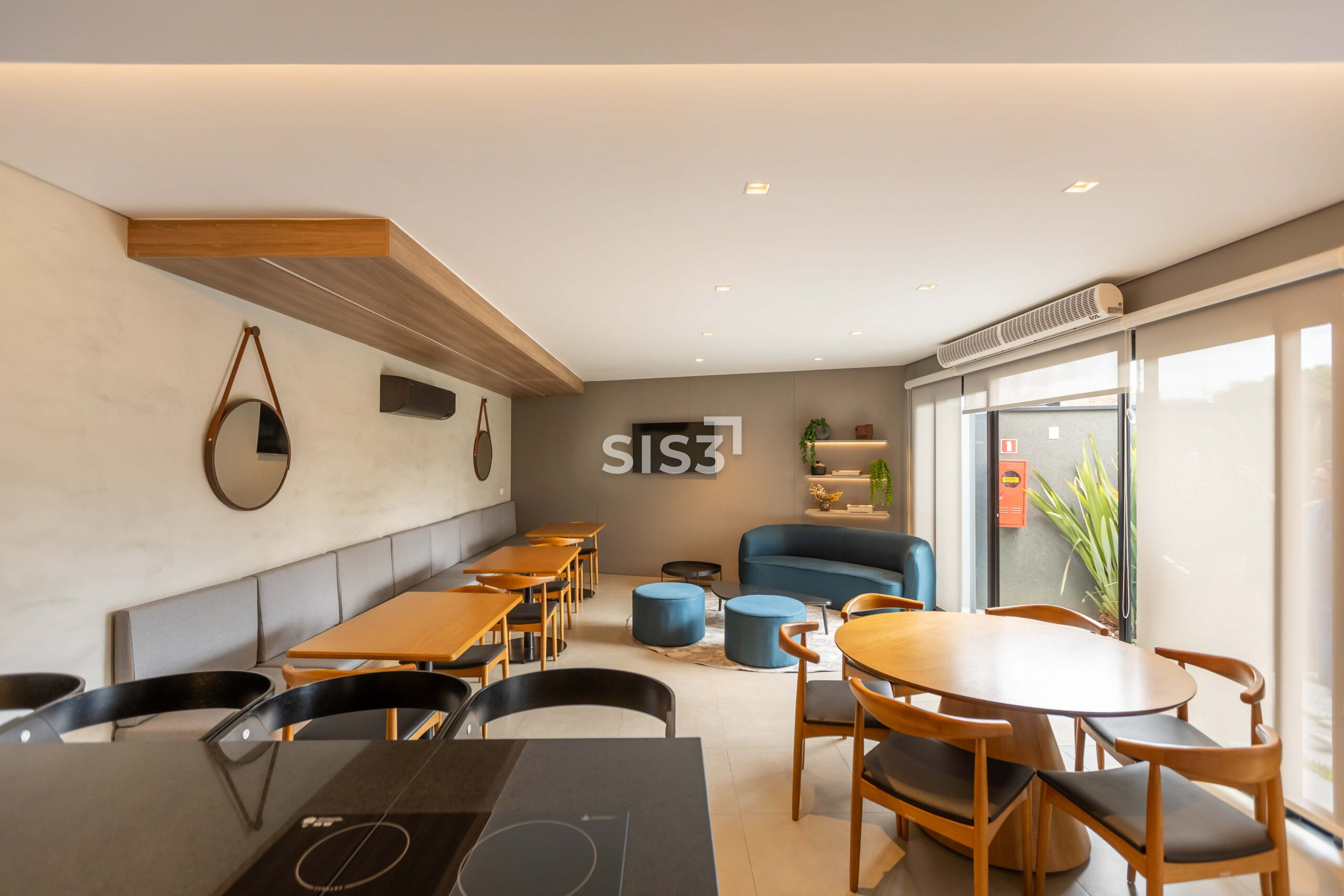 A área social é aberta e bem resolvida, com cozinha integrada à sala de jantar e estar. As grandes aberturas em vidro revelam um pátio interno com paisagismo, trazendo o verde para dentro e criando uma atmosfera agradável ao longo do dia.