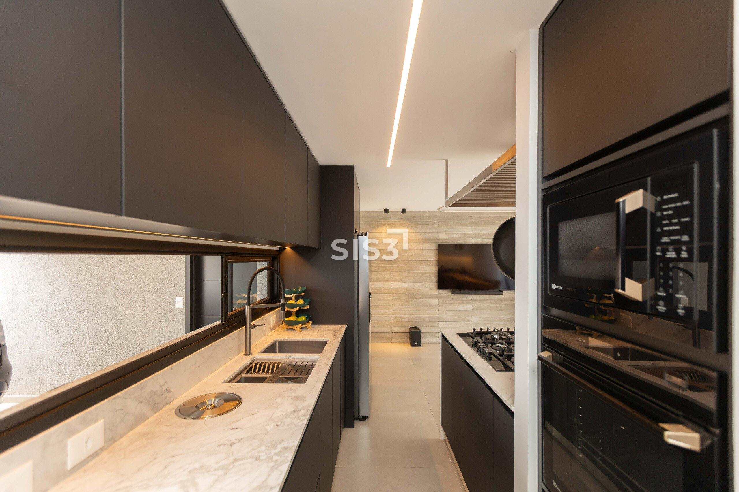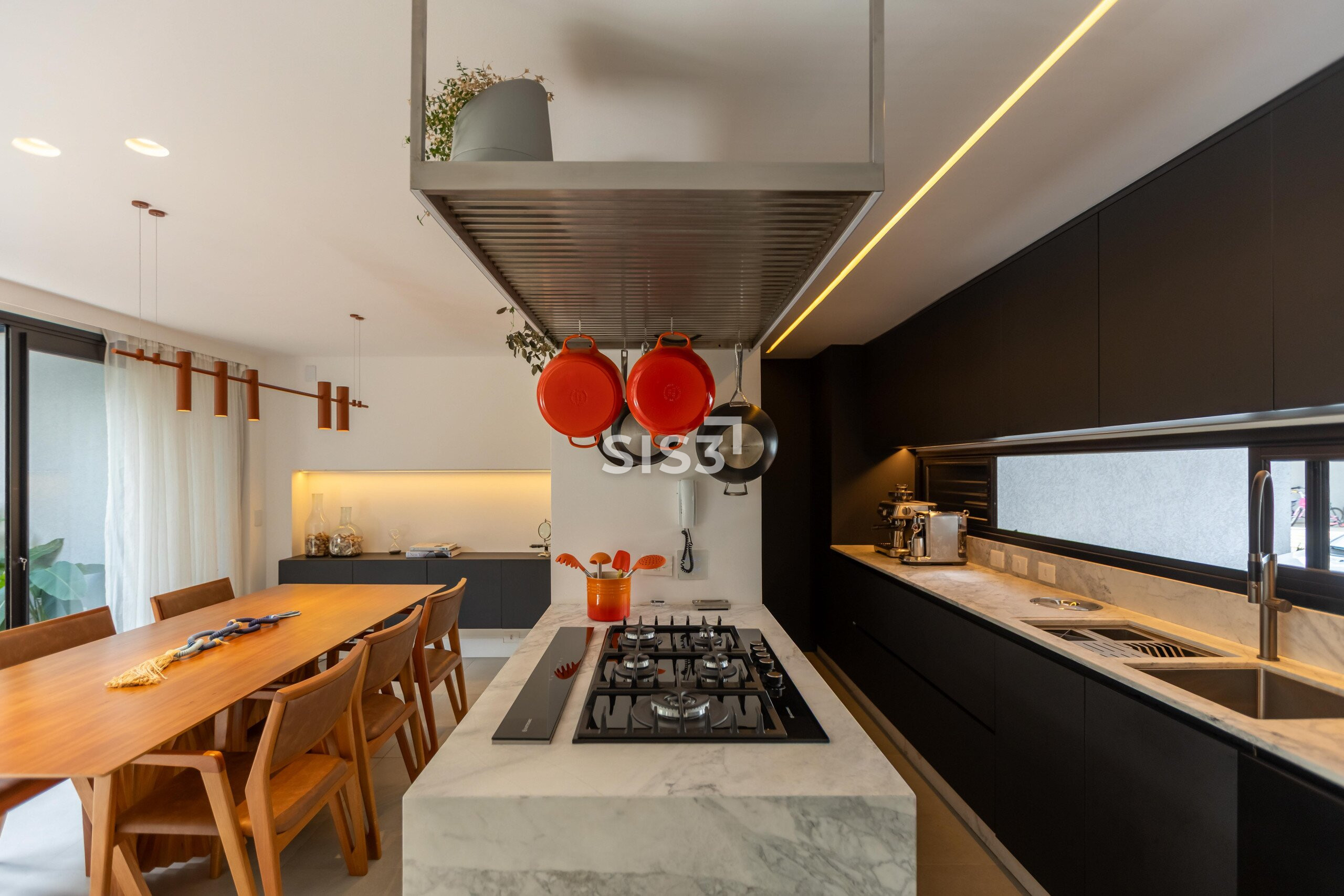 A cozinha tem desenho atual, com ilha em pedra, marcenaria escura e iluminação bem pensada, funcionando tanto para o dia a dia quanto para receber.