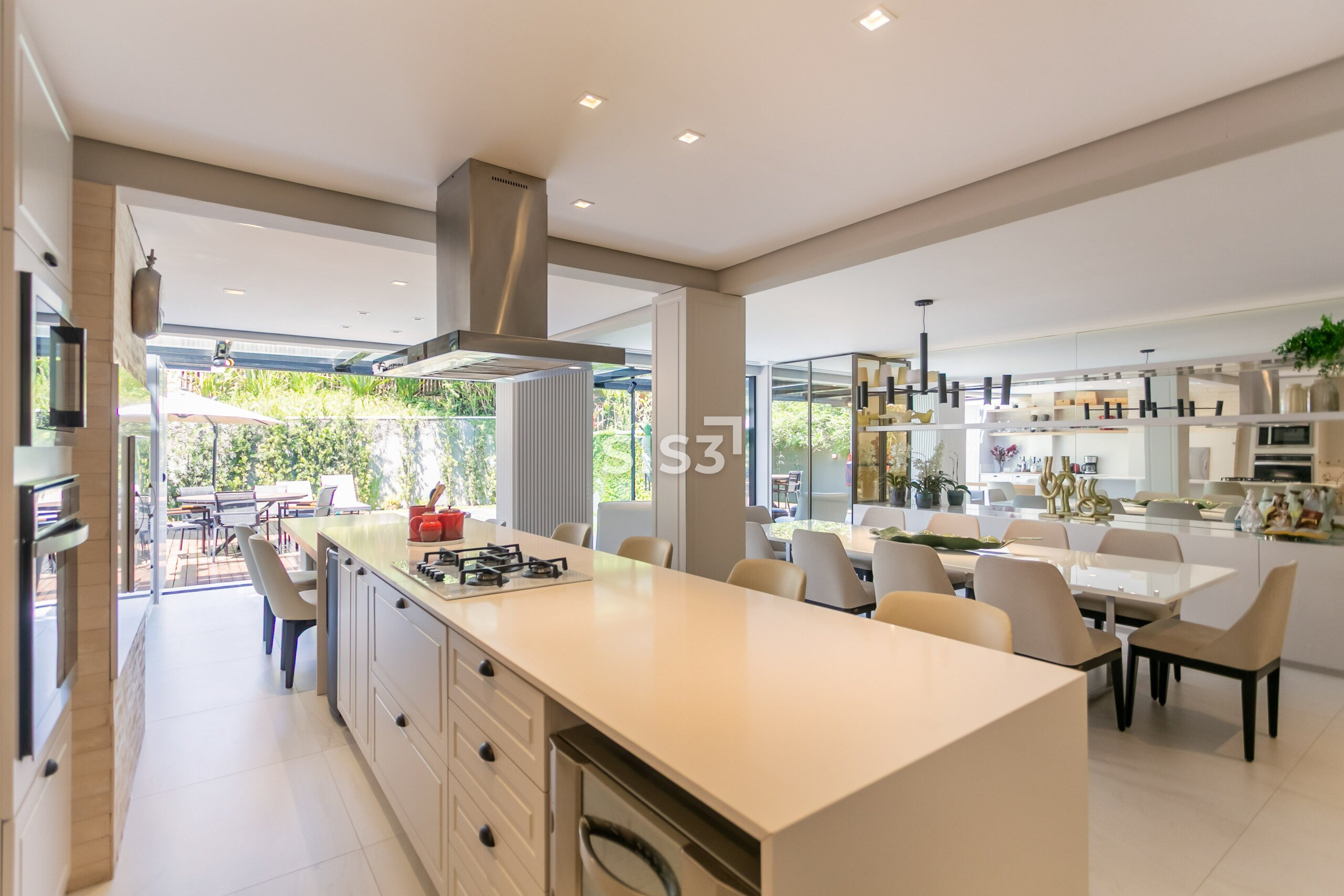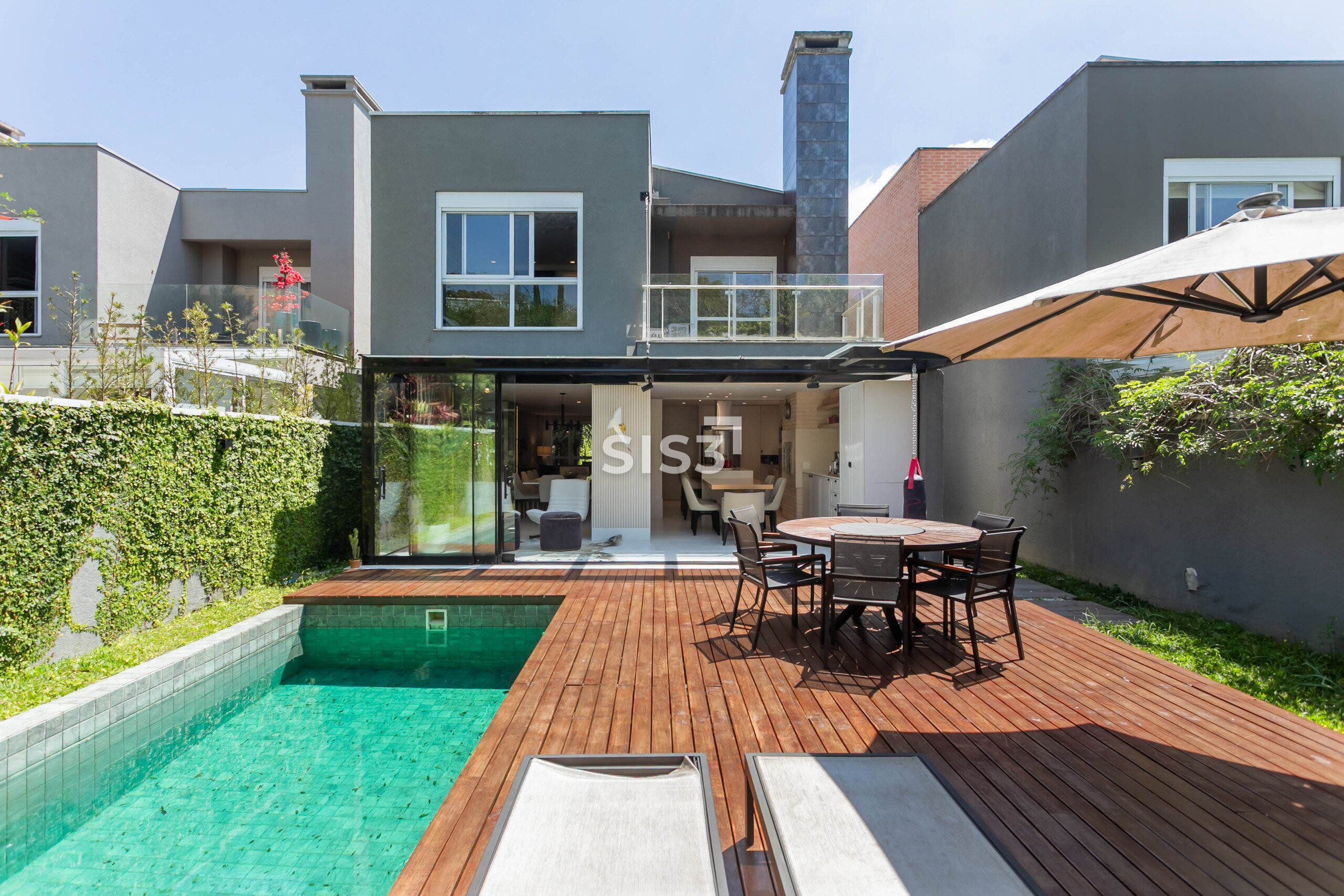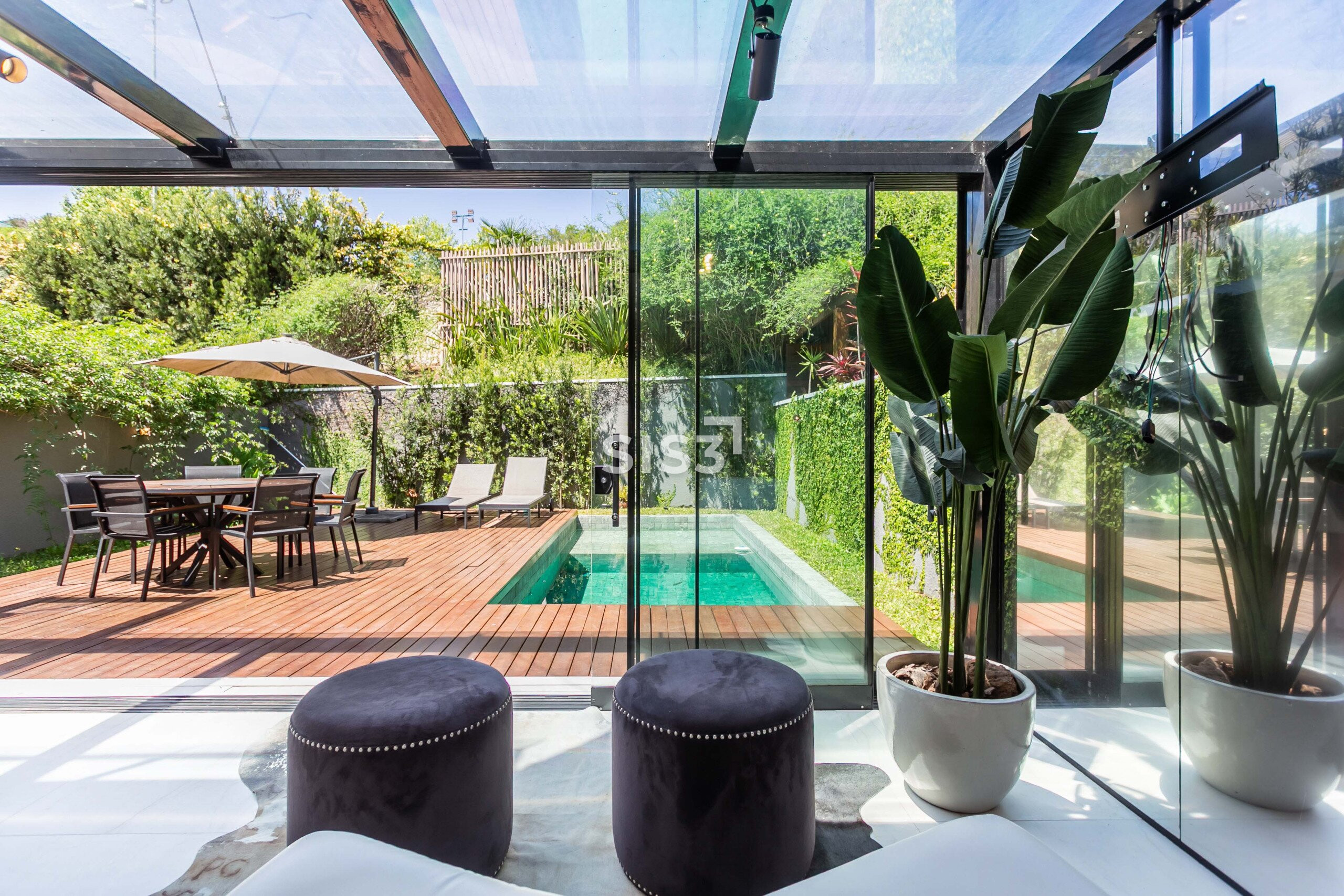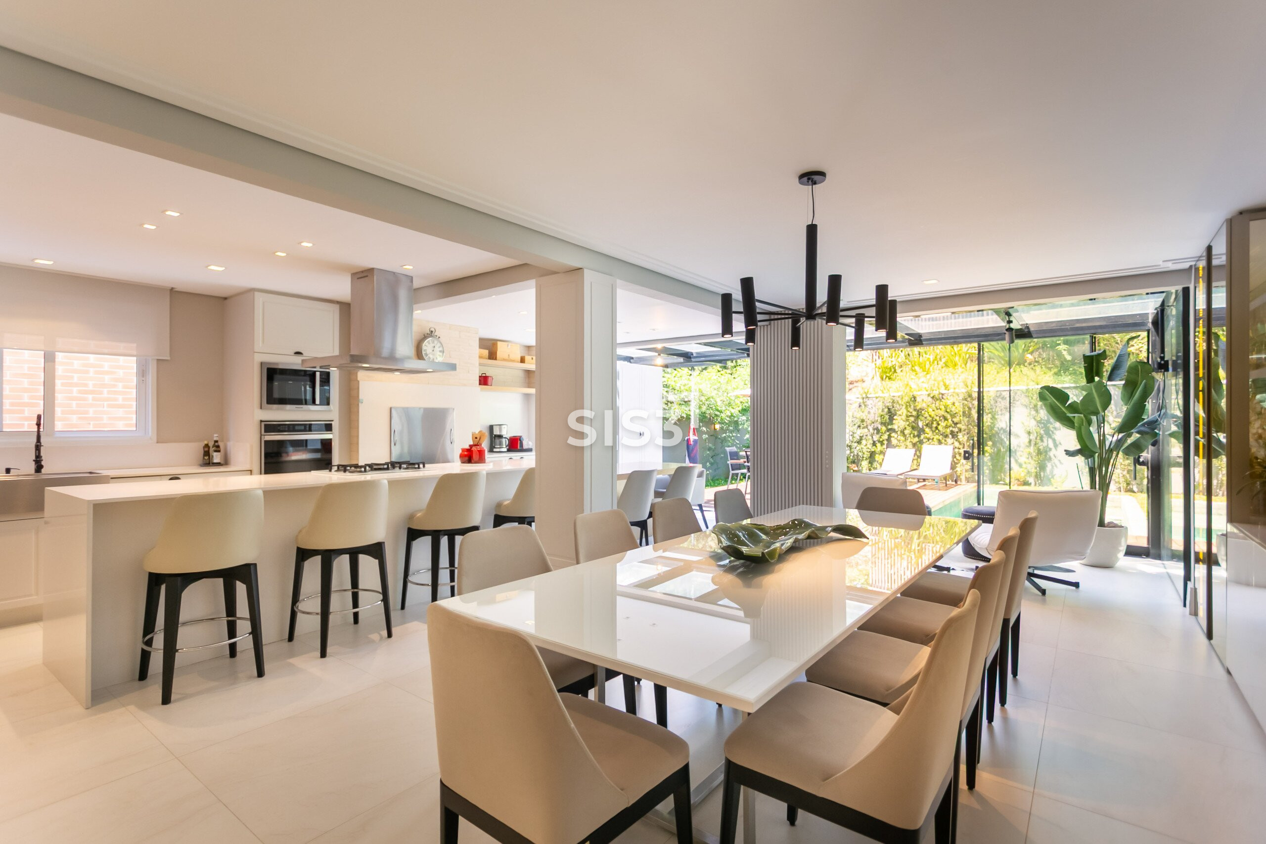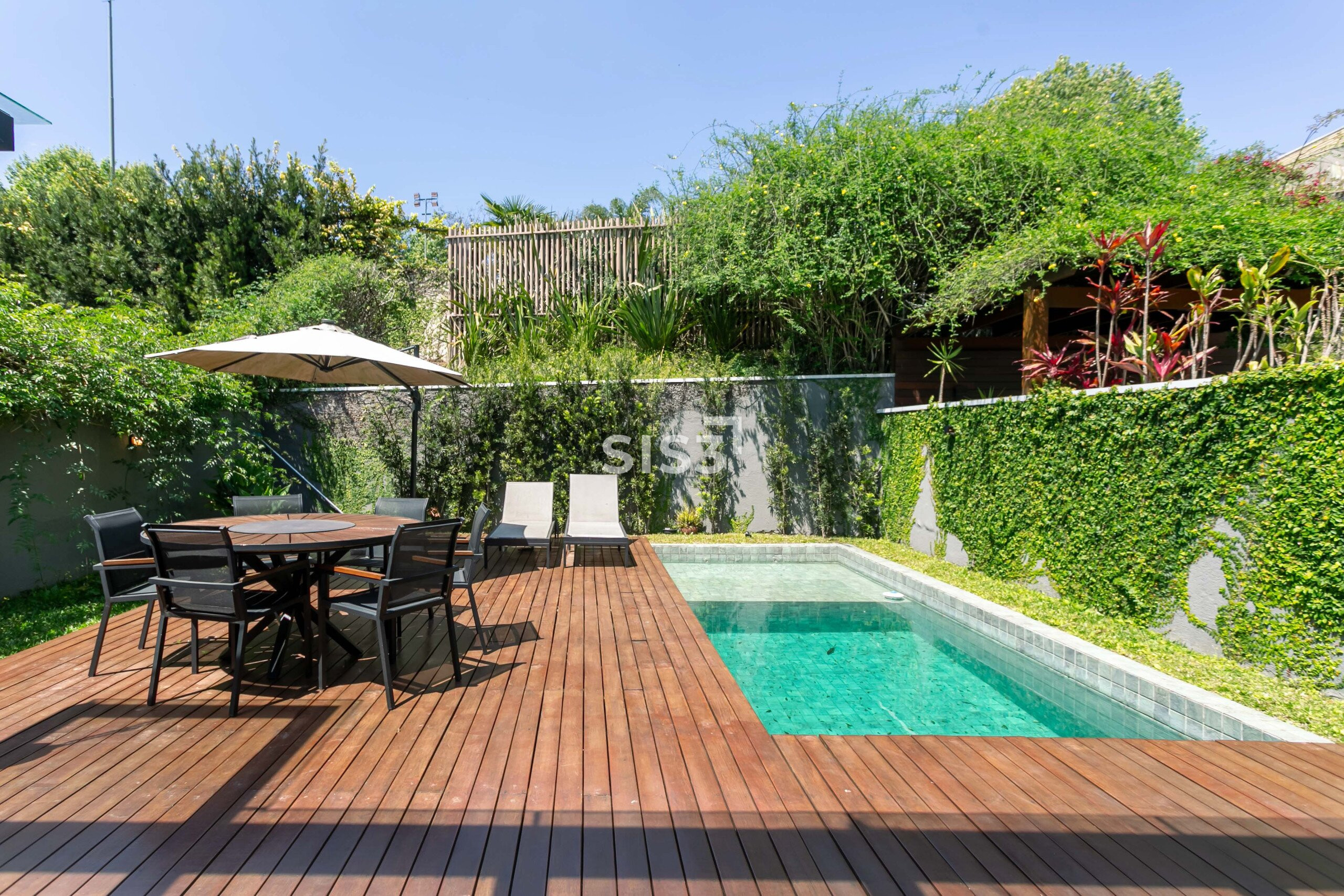 A planta prioriza a convivência: a sala para dois ambientes se conecta à cozinha gourmet, criando um espaço amplo e acolhedor. Ao fundo, o jardim com piscina e deck de madeira forma um cenário perfeito para receber e relaxar ao ar livre.