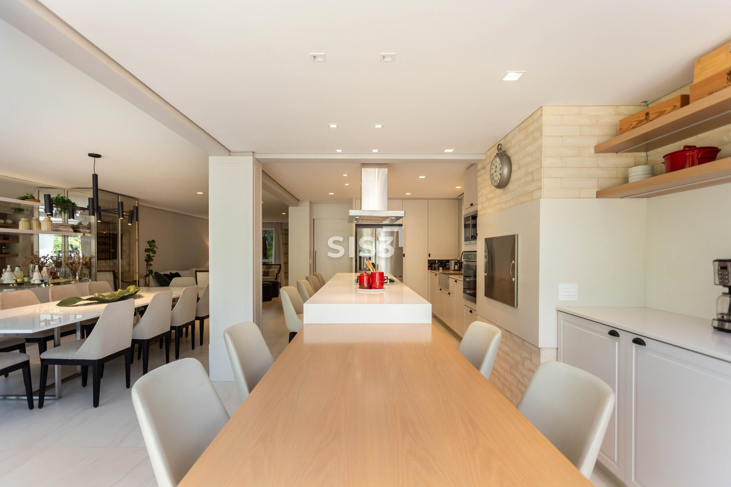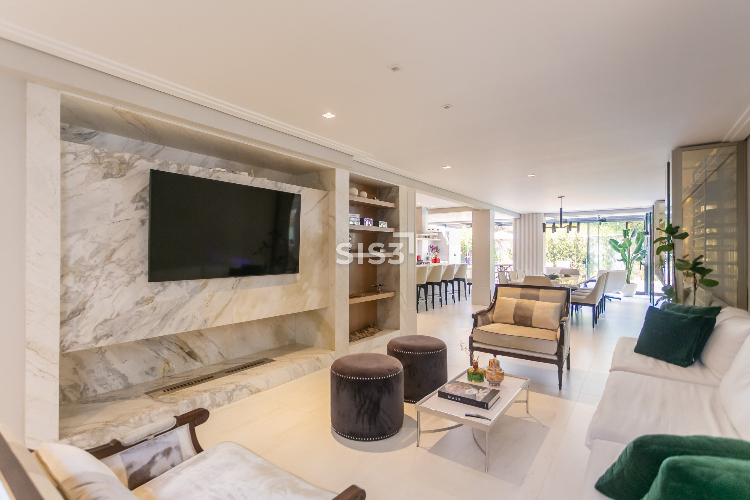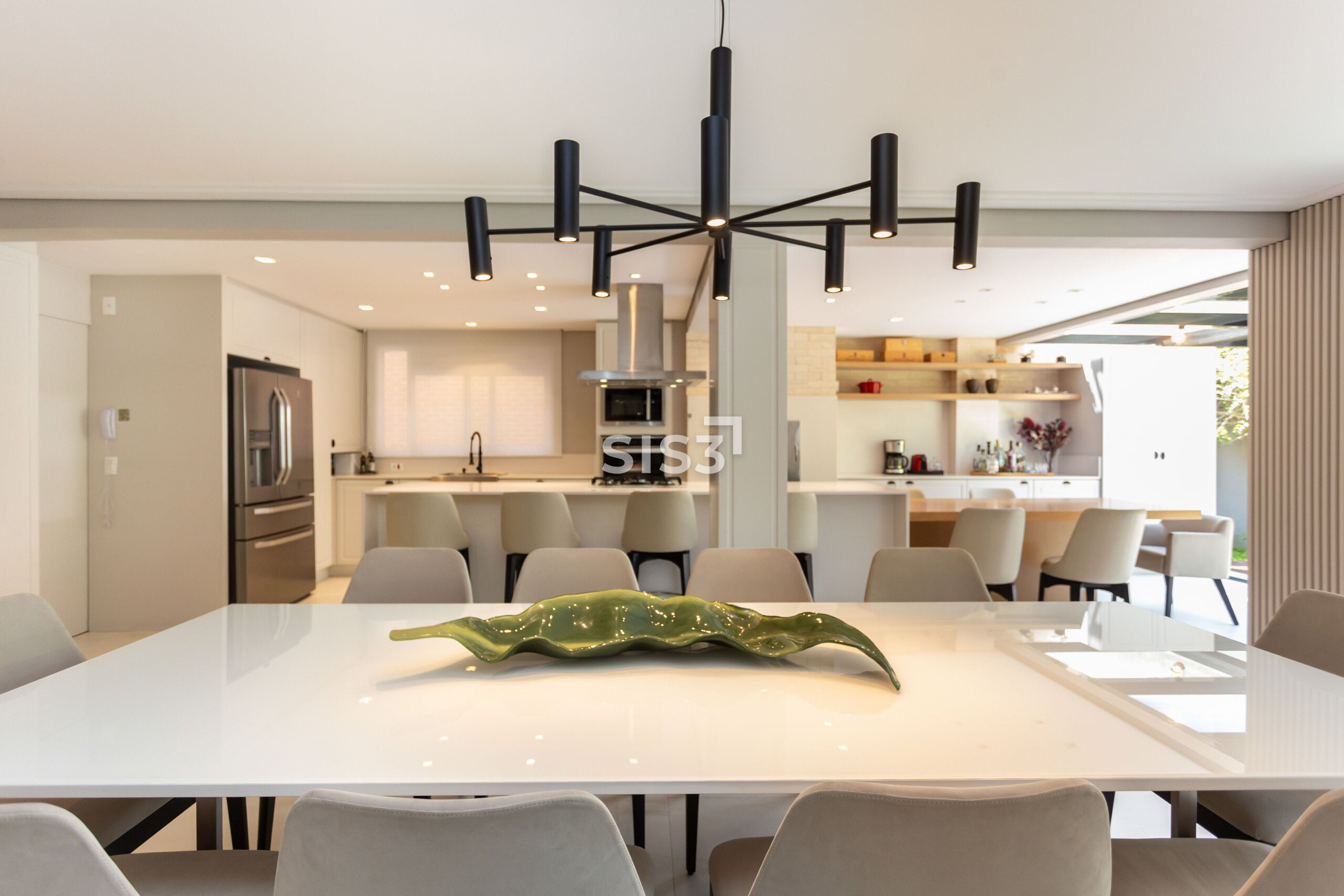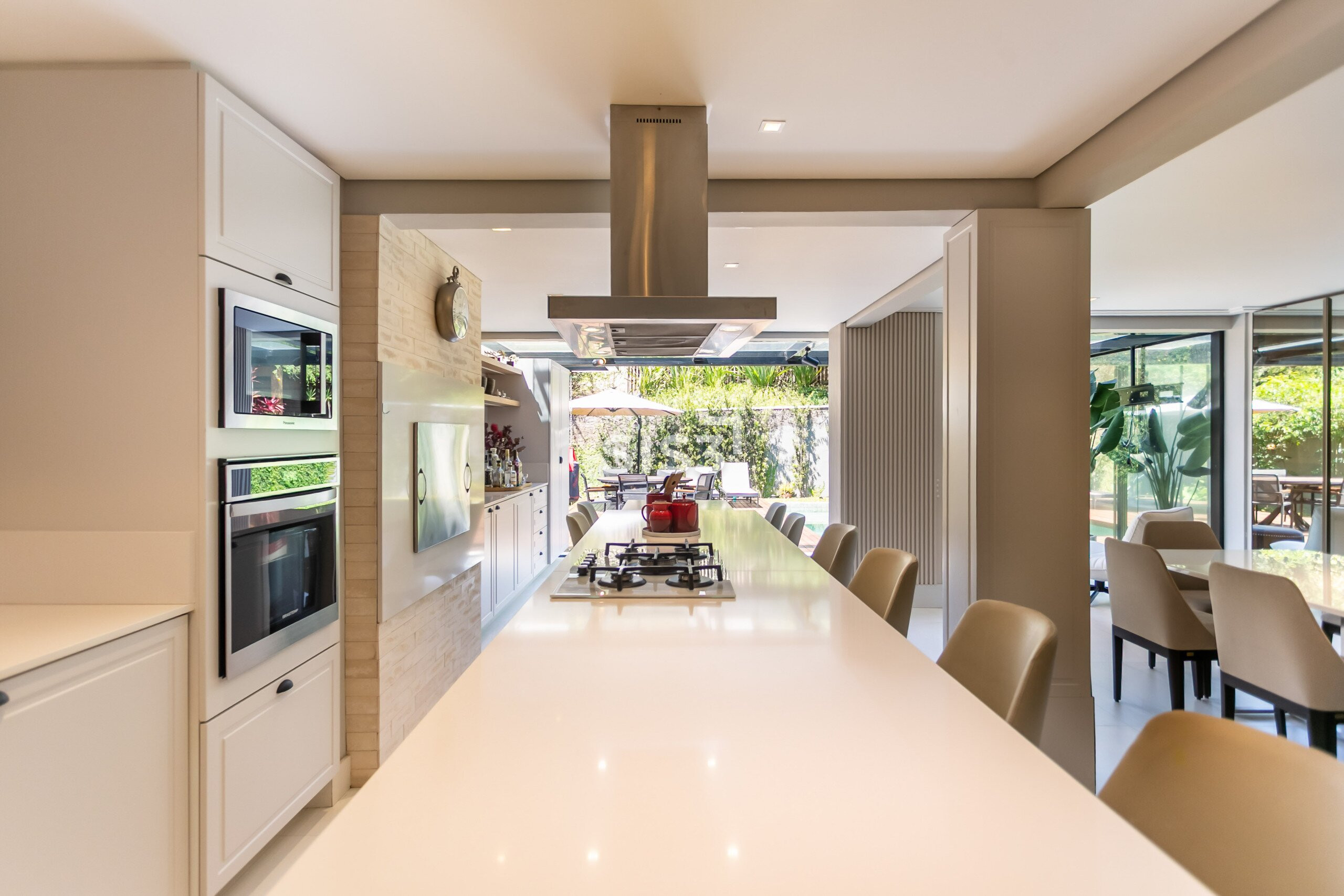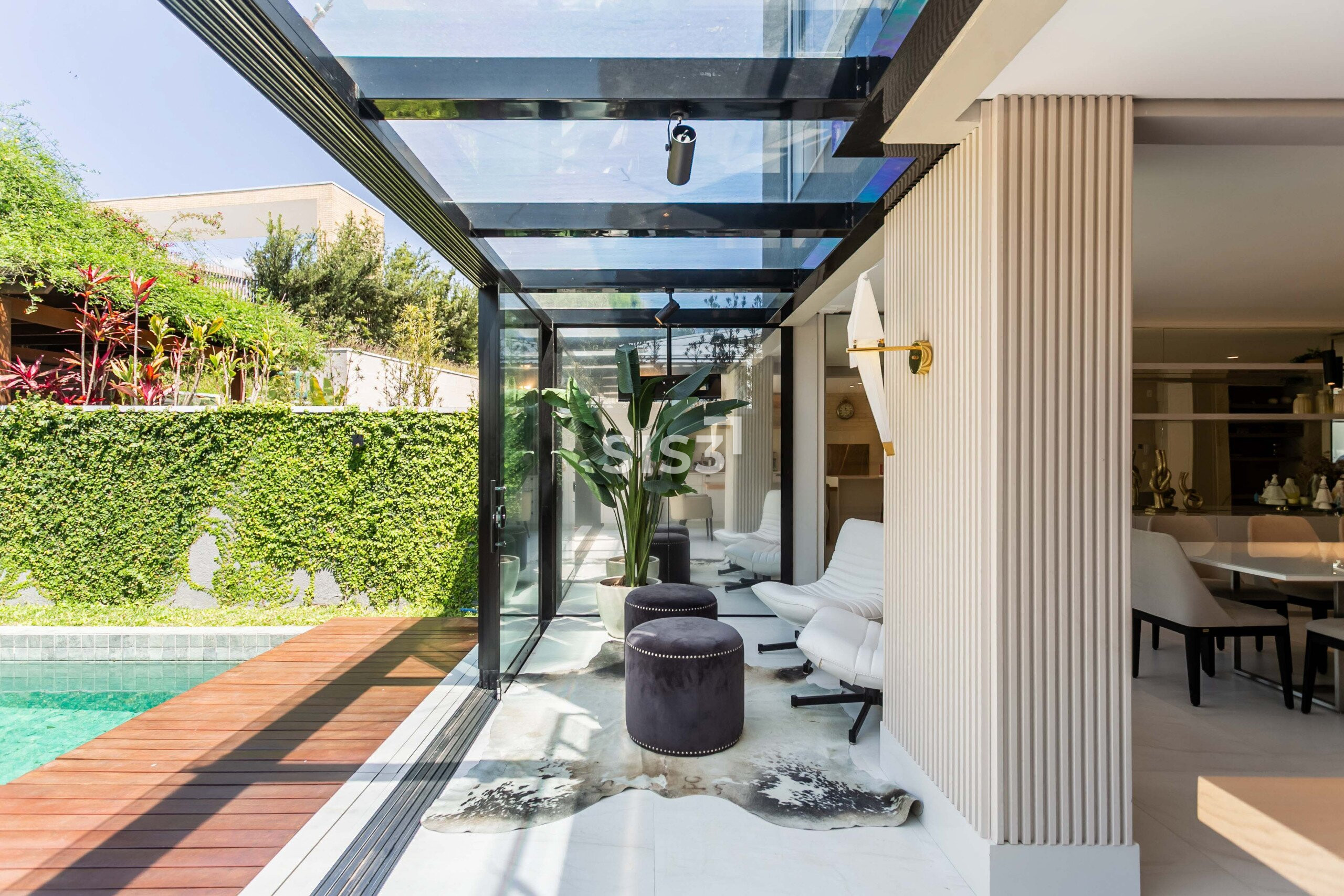 A planta prioriza a convivência: a sala para dois ambientes se conecta à cozinha gourmet, criando um espaço amplo e acolhedor. Ao fundo, o jardim com piscina e deck de madeira forma um cenário perfeito para receber e relaxar ao ar livre.