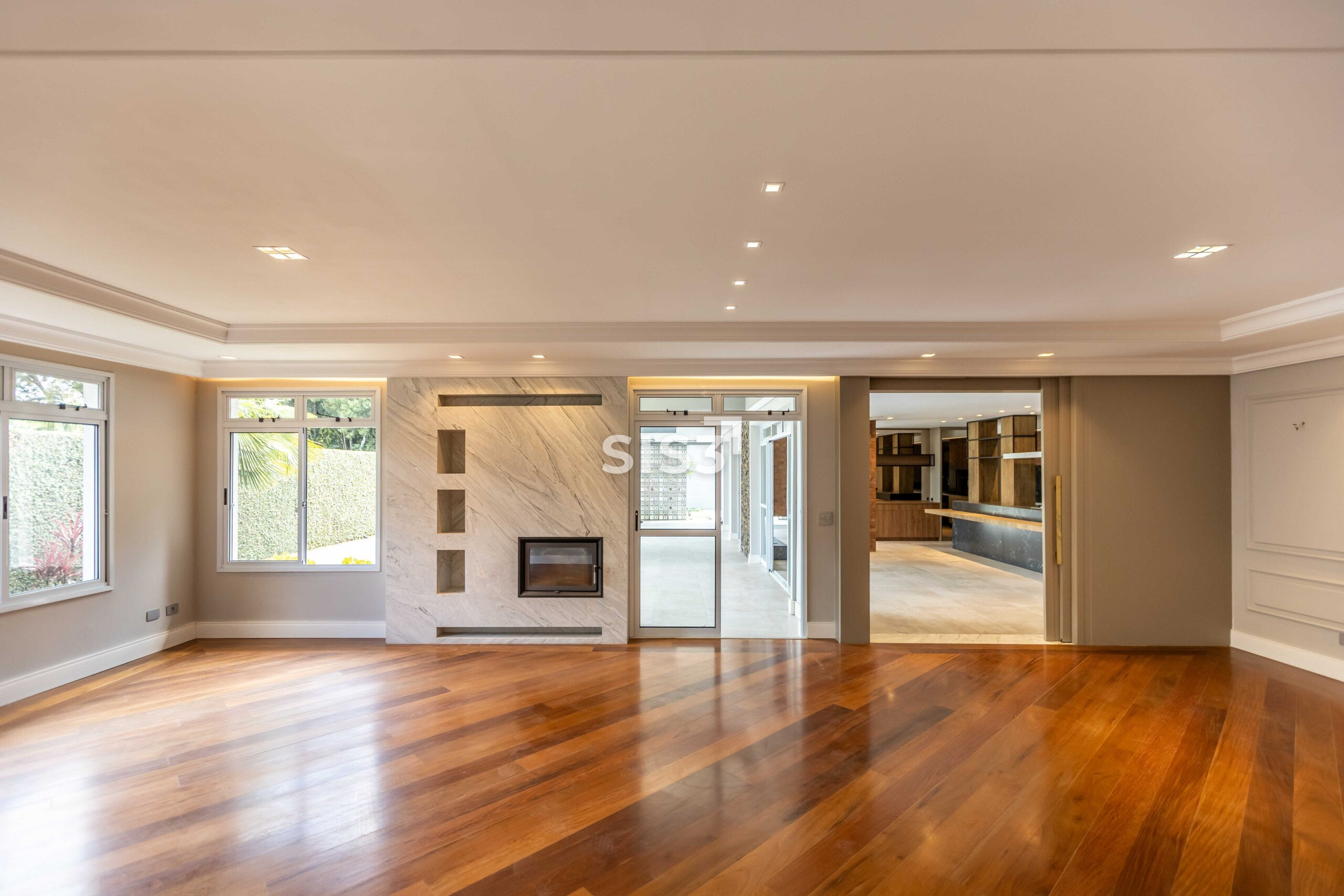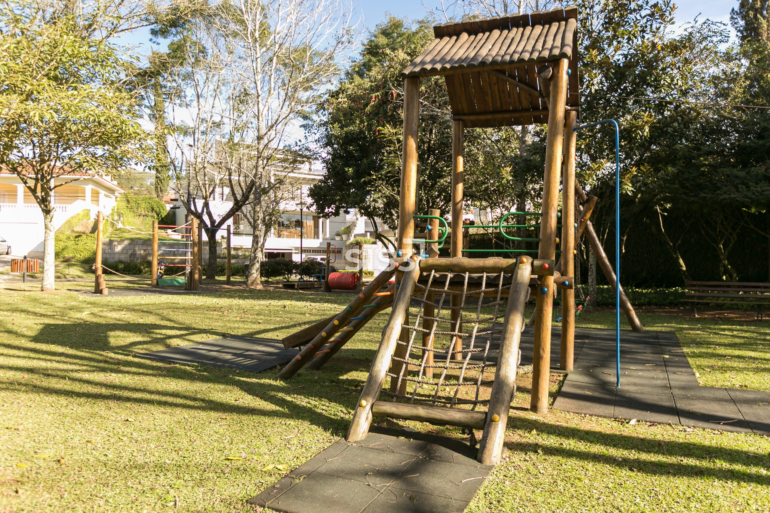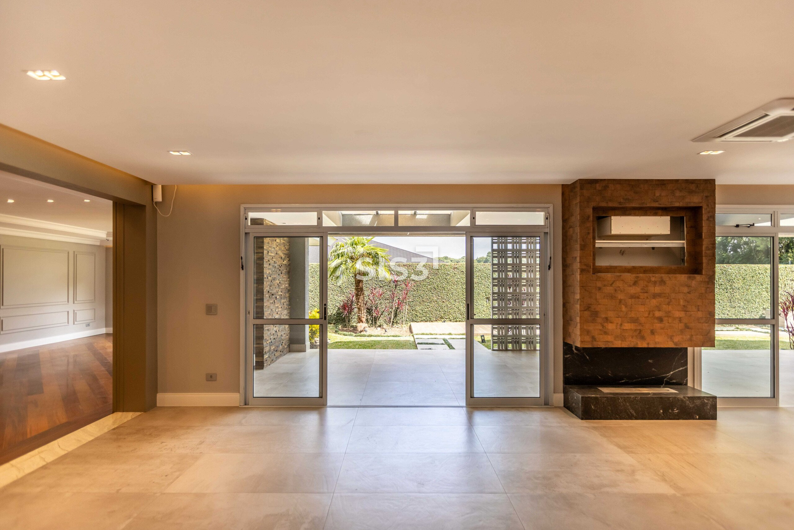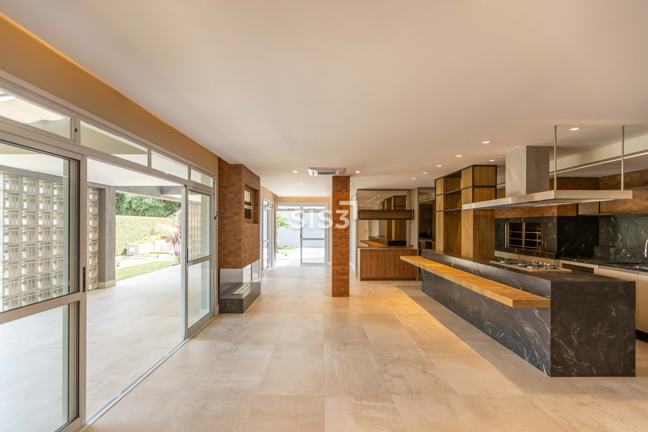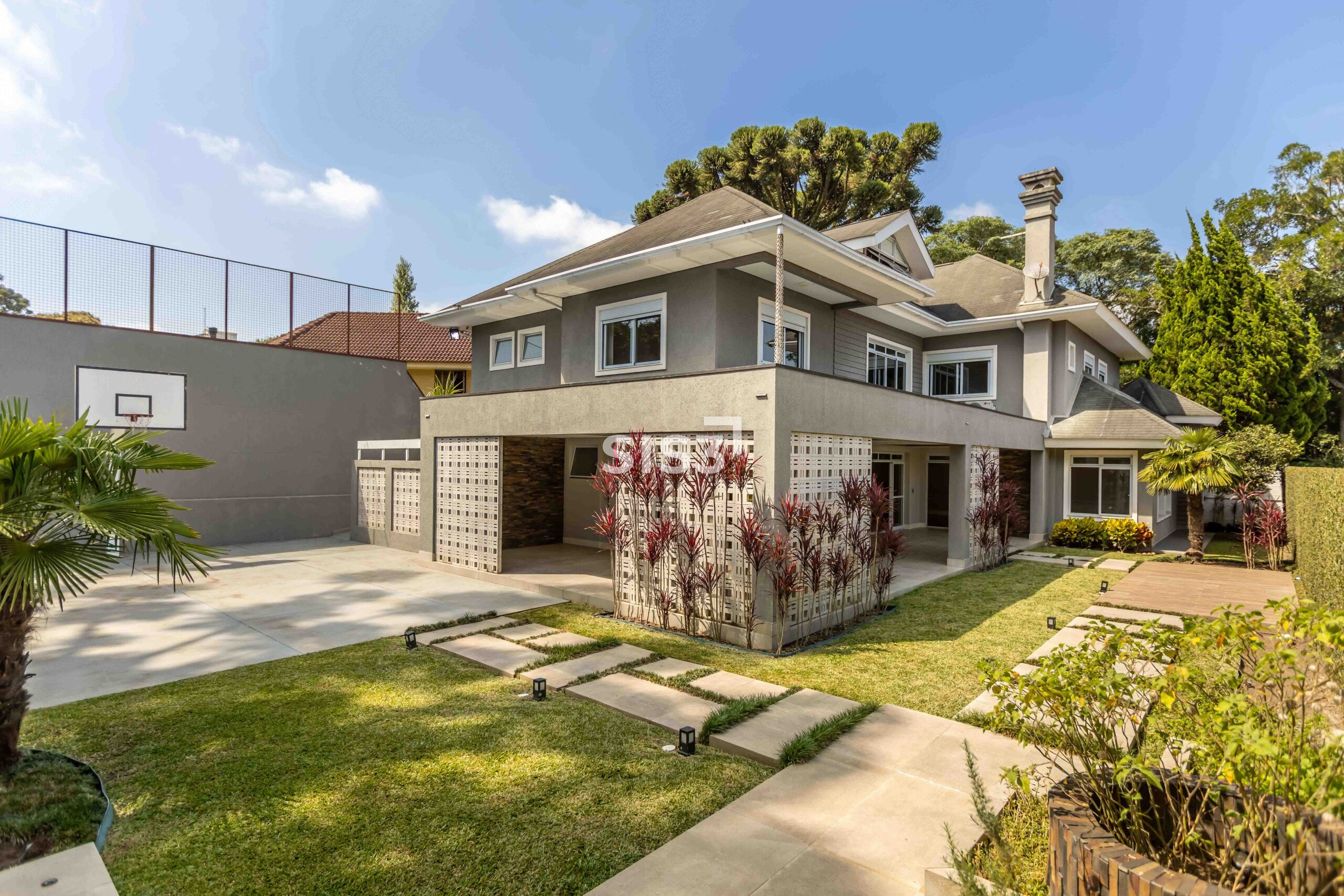 No pavimento térreo, a área social reúne sala de estar com piso de madeira e lareira a carvão, além de escritório e lavabo. A cozinha e a lavanderia contam com marcenaria planejada e se conectam à área gourmet, recentemente reformada, equipada com churrasqueira a carvão e lareira, em um ambiente voltado para o jardim. A área externa é generosa e inclui espaço para convivência, uma mini quadra de basquete e previsão para piscina.