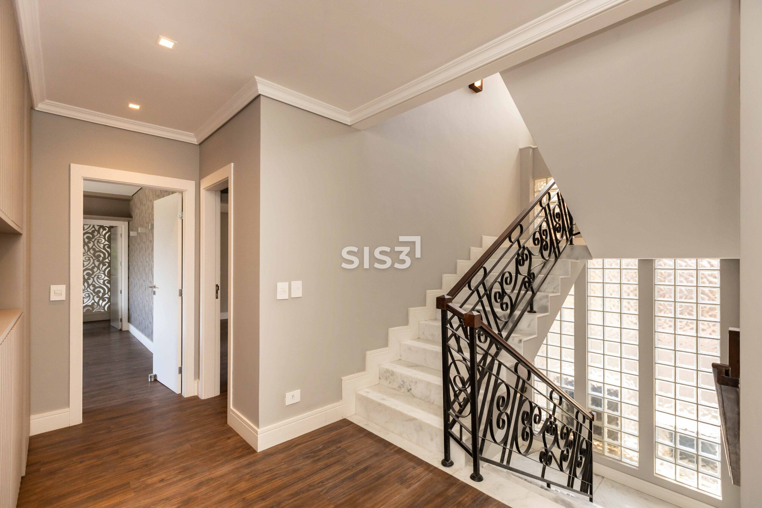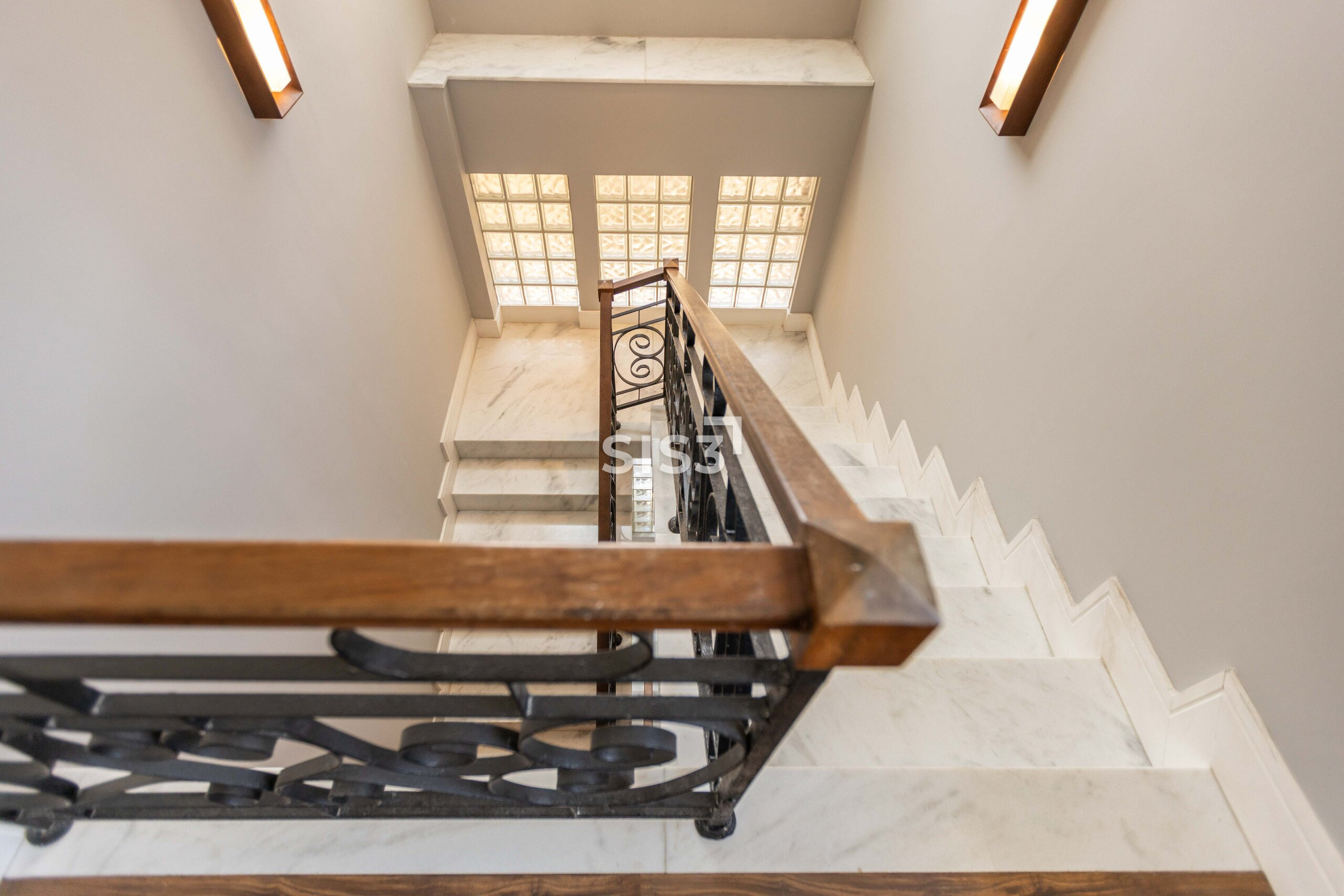 As escadas em mármore branco Carrara conectam os pavimentos e reforçam a elegância do projeto. Os dormitórios e o ático contam com ar-condicionado.