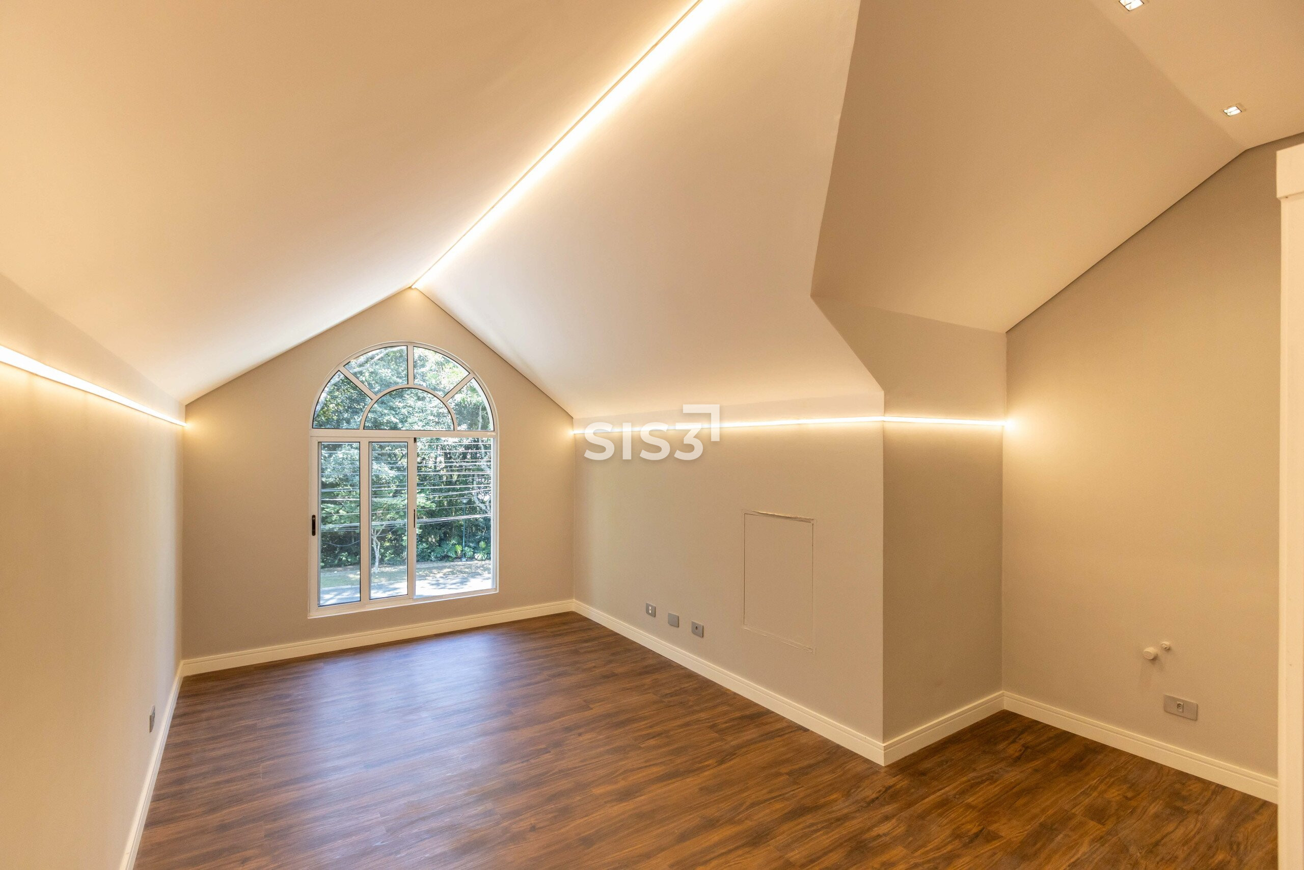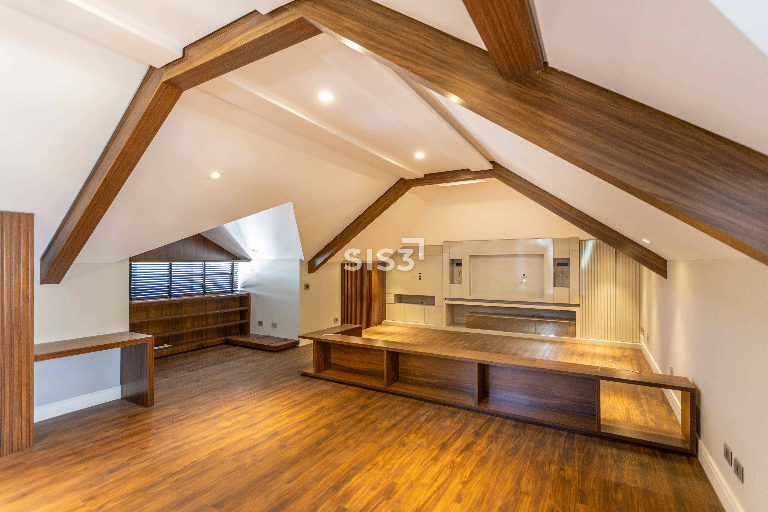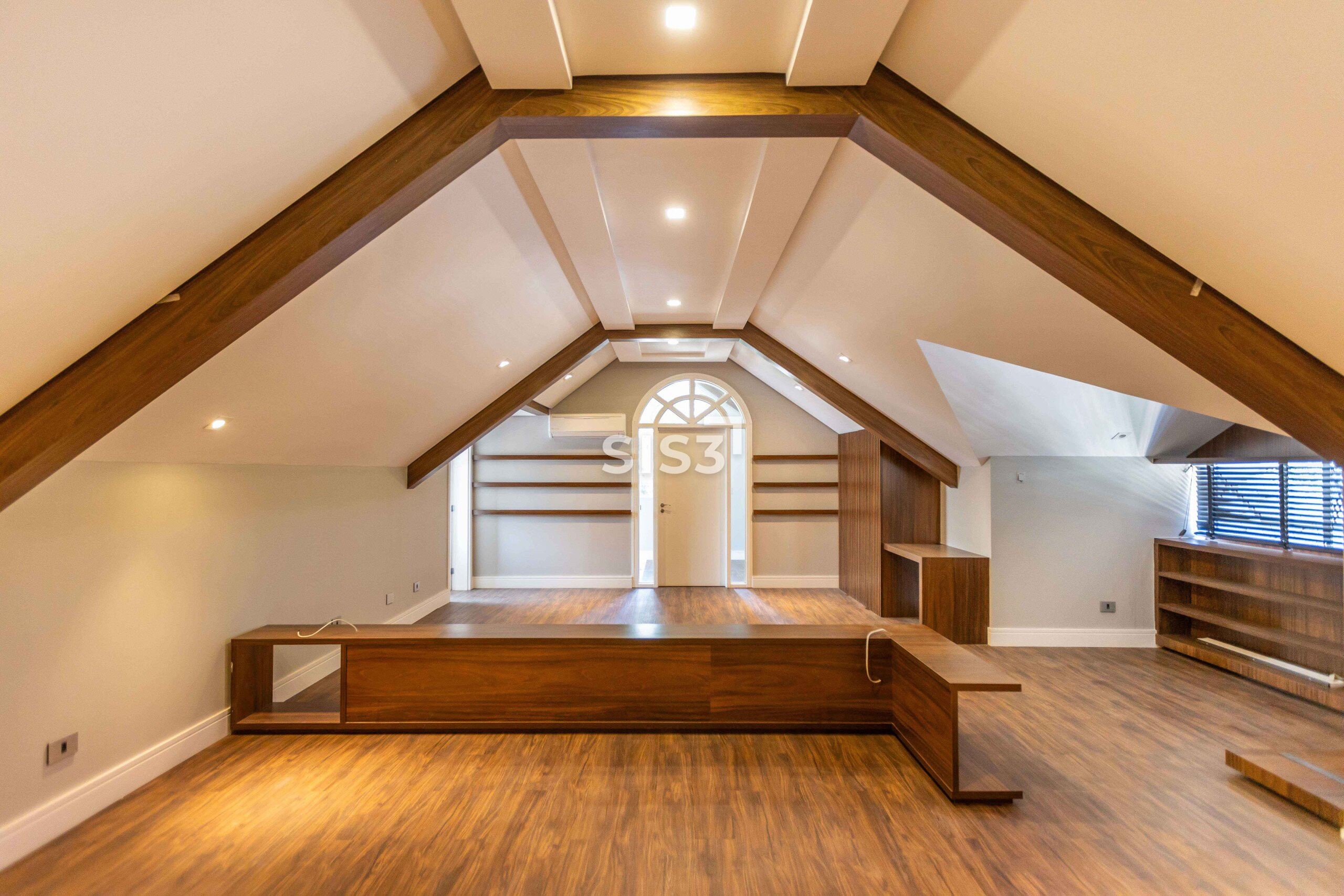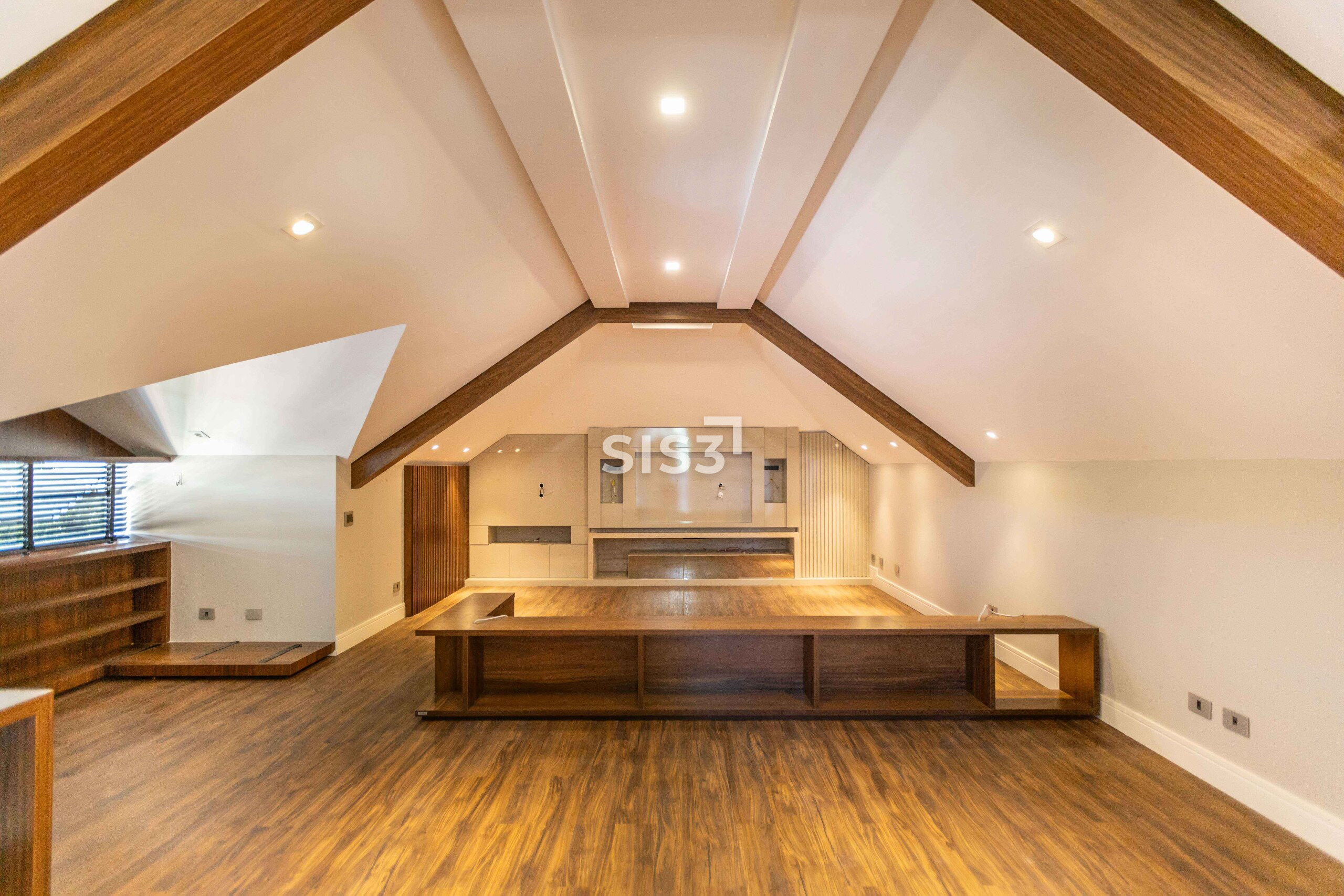 O terceiro pavimento abriga um amplo ático com sala de TV climatizada e banheiro, ideal como espaço de convivência, home cinema ou área de descanso.