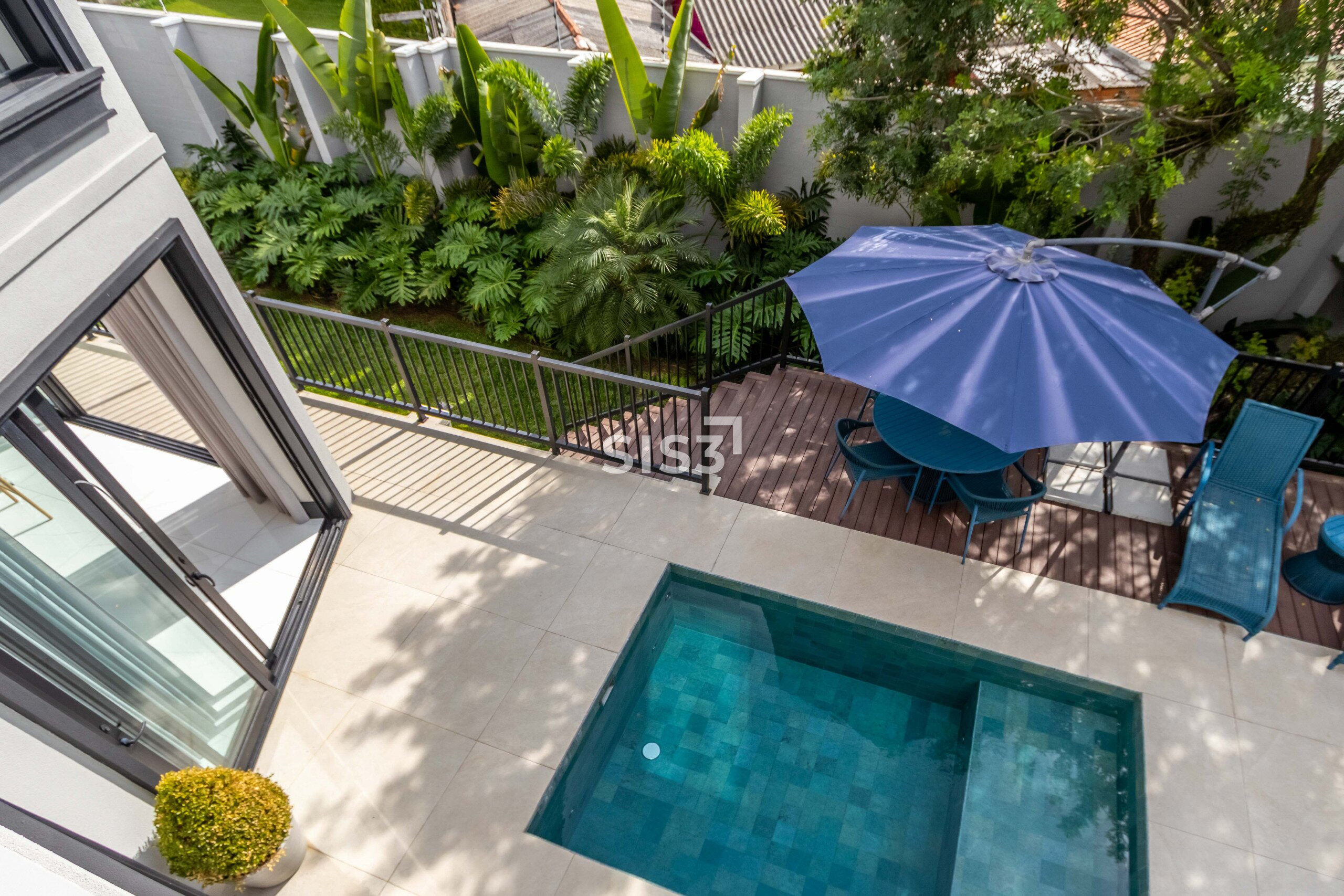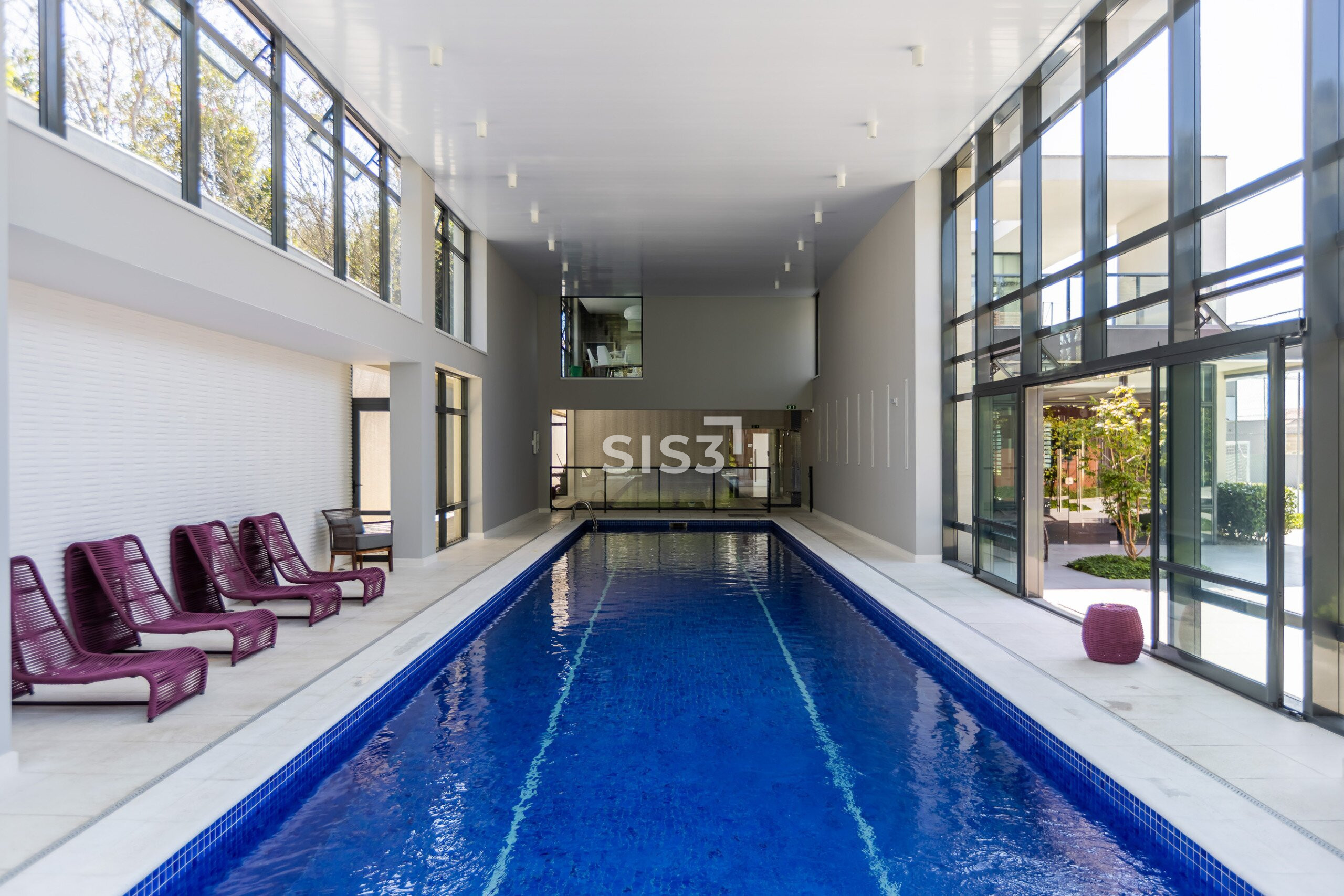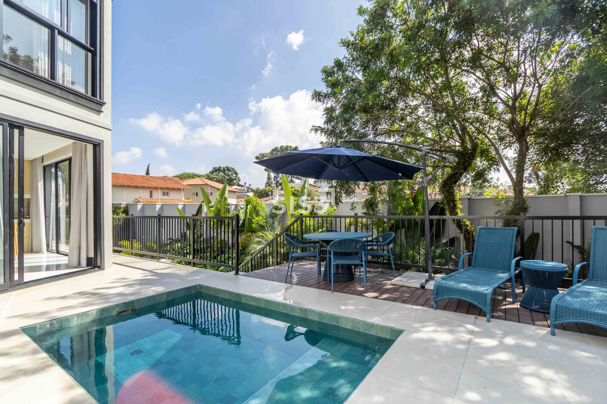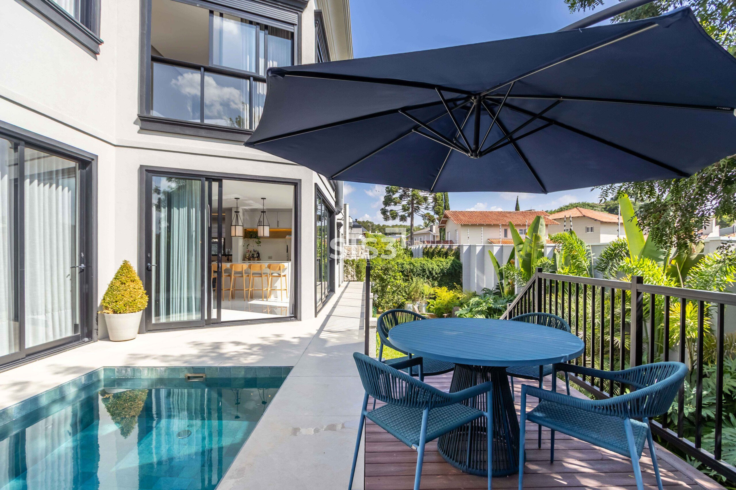 A área externa convida a desfrutar da piscina aquecida, integrada a um jardim ensolarado e muito agradável — um espaço que naturalmente puxa os encontros para fora.