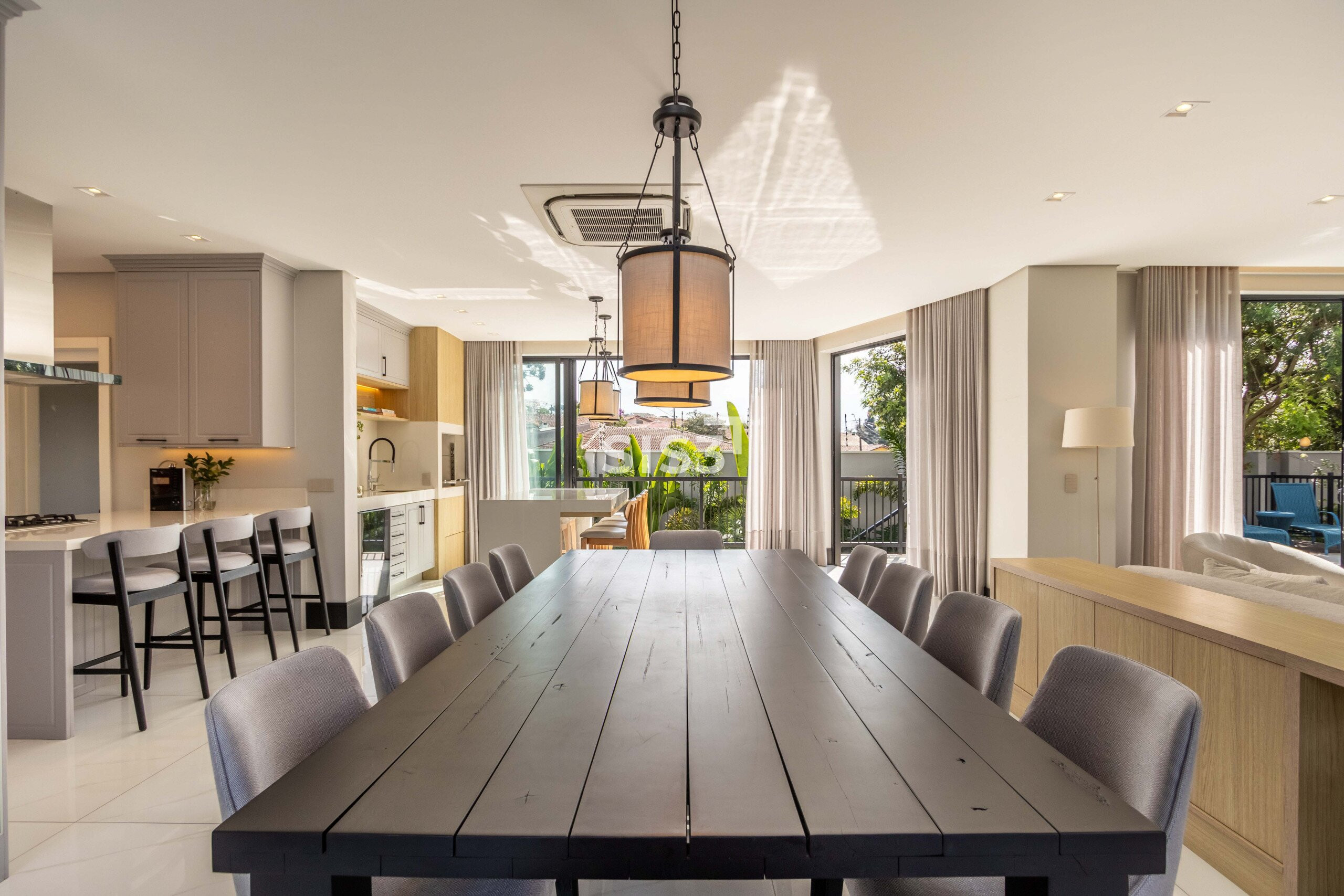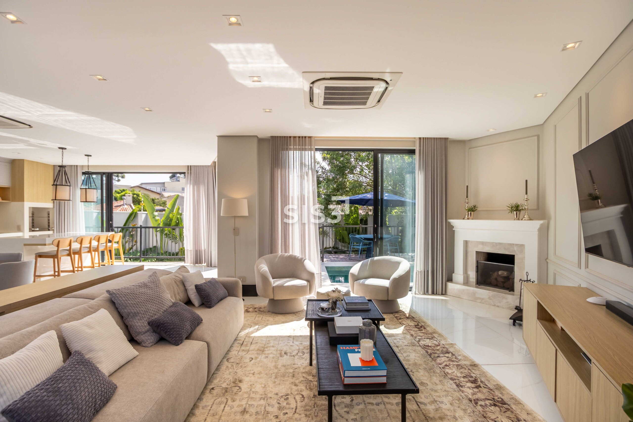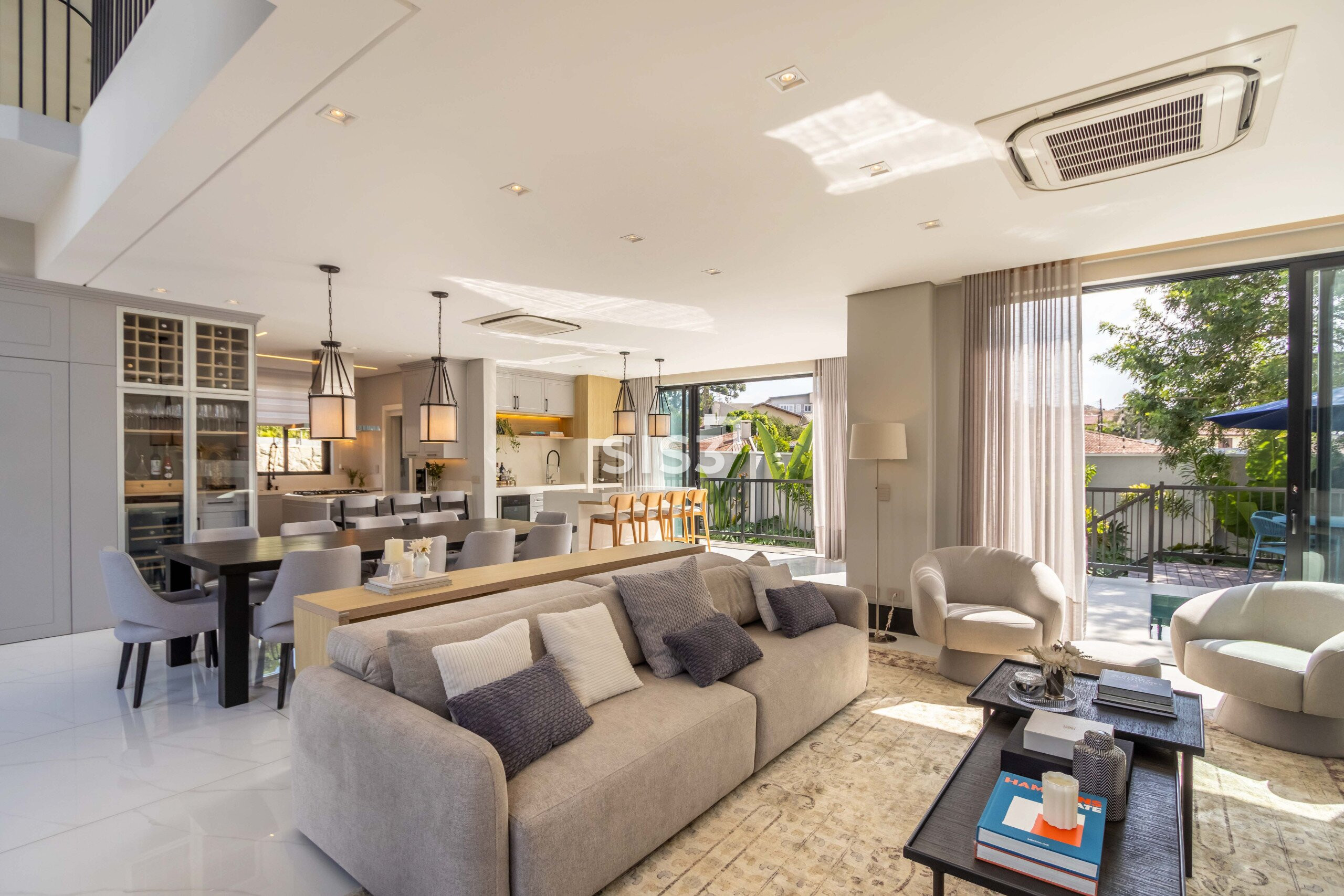O living integrado revela uma casa que valoriza convivência e luz natural — grandes aberturas conectam os ambientes à área externa, criando uma fluidez rara entre interior e jardim.