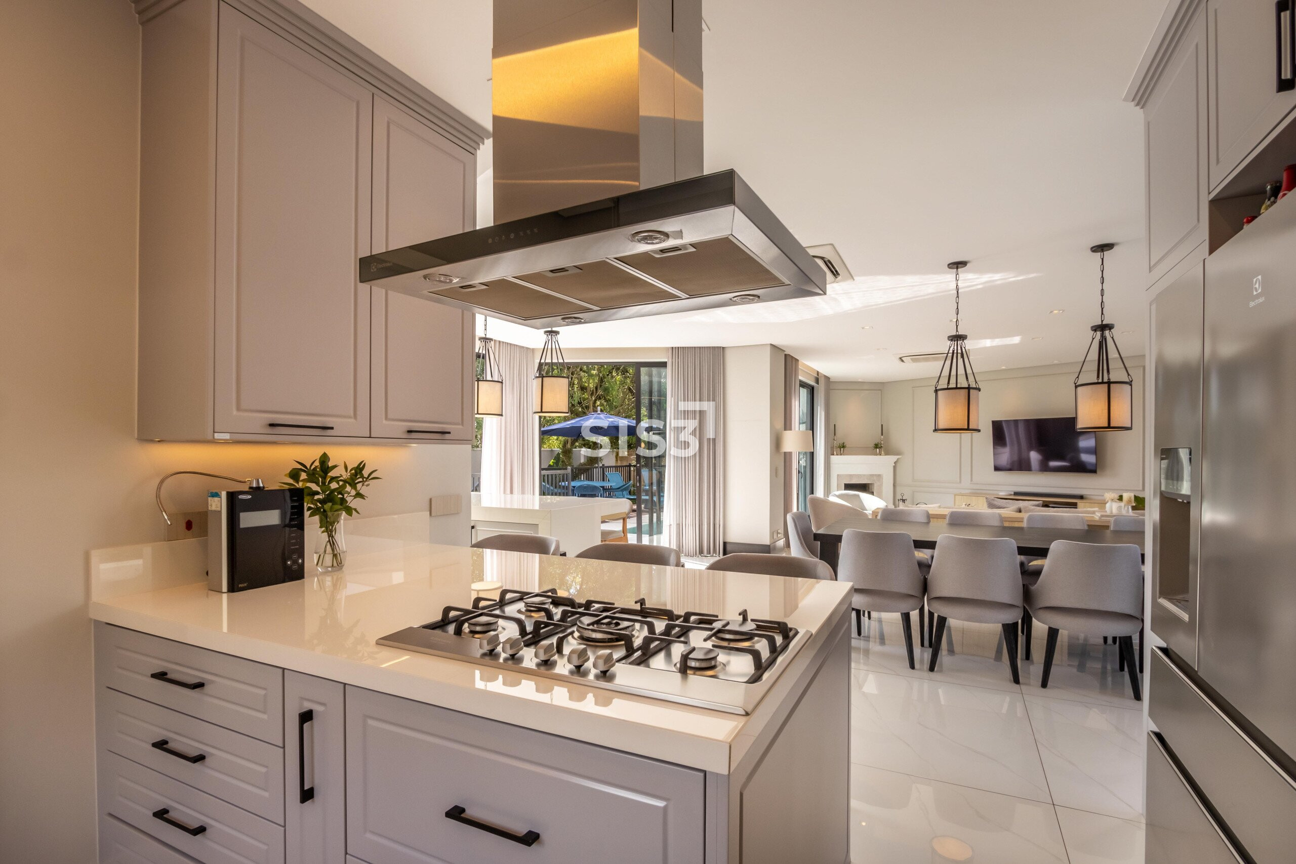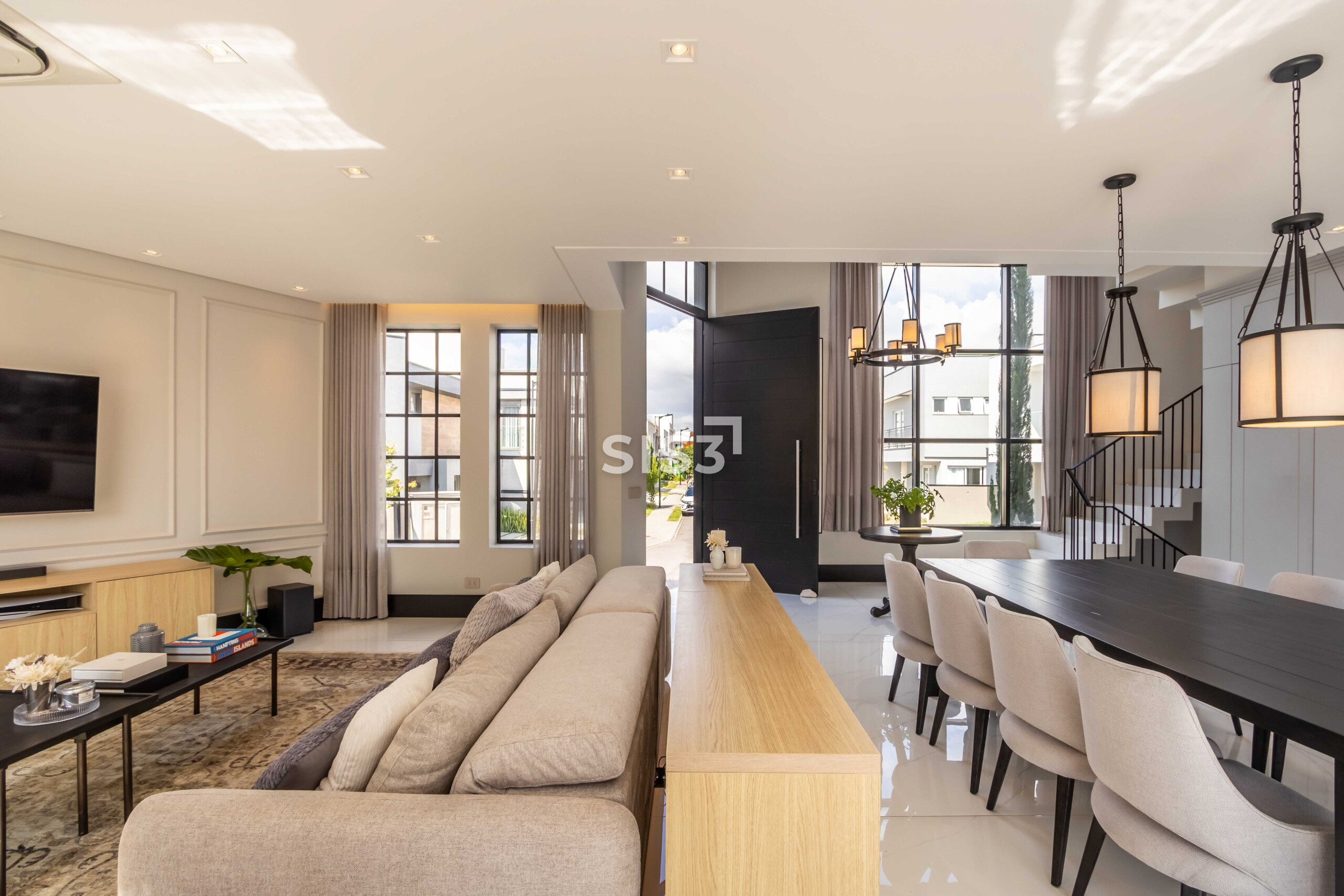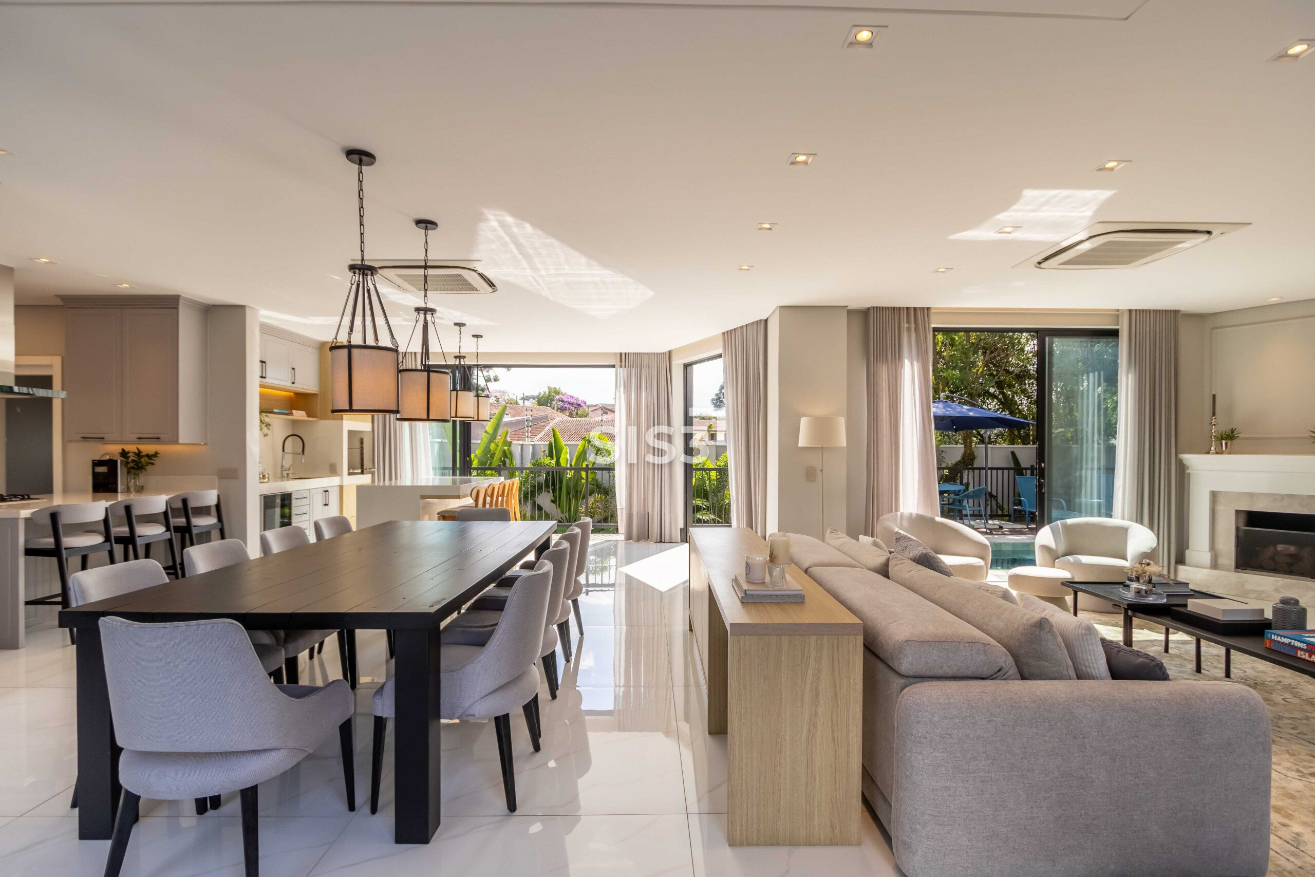 O living integrado revela uma casa que valoriza convivência e luz natural — grandes aberturas conectam os ambientes à área externa, criando uma fluidez rara entre interior e jardim.