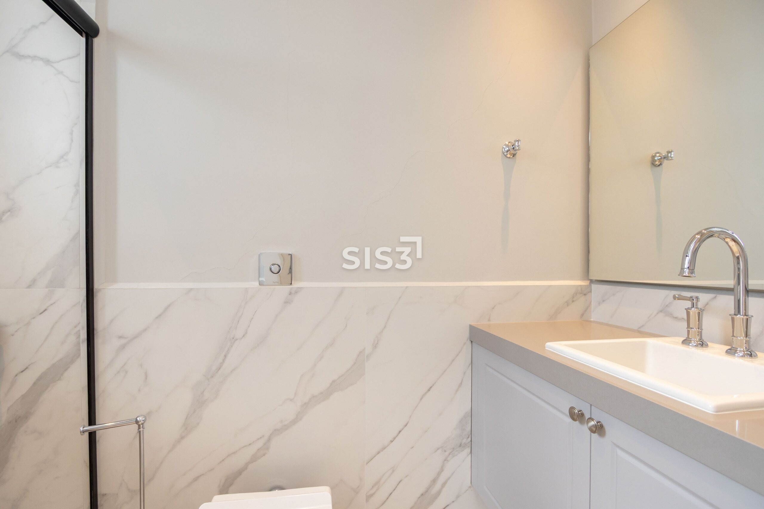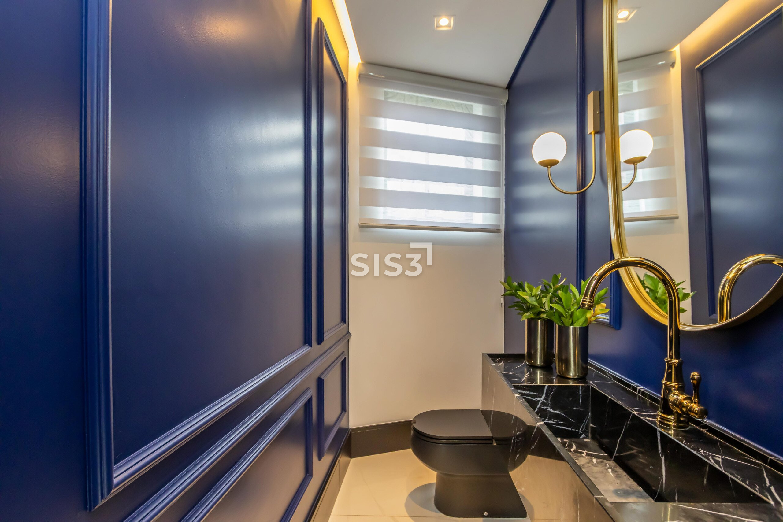 O lavabo, com personalidade marcante, reforça o cuidado nos detalhes e traz um toque autoral ao projeto.