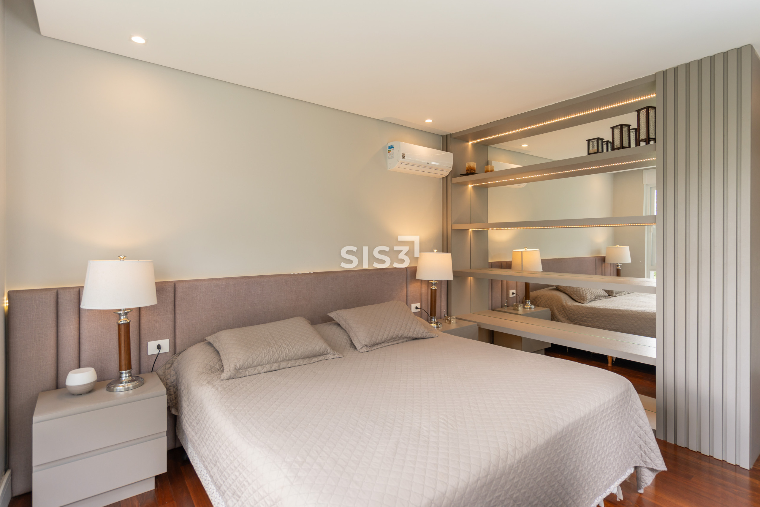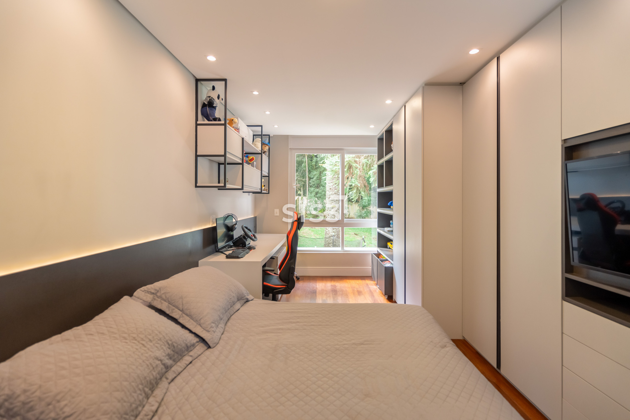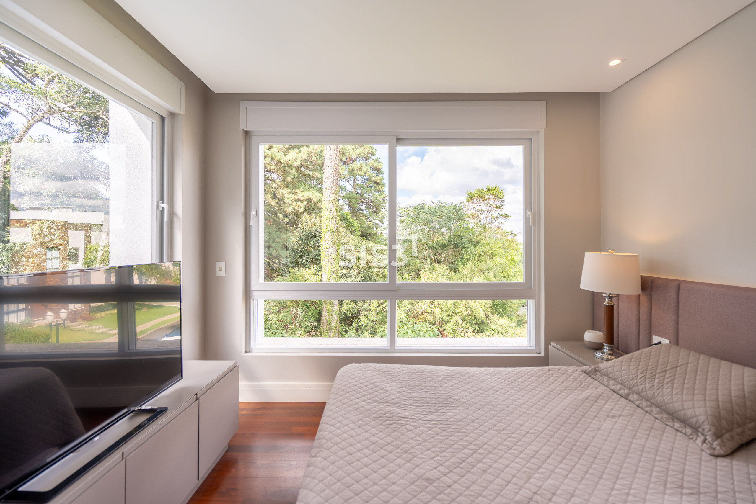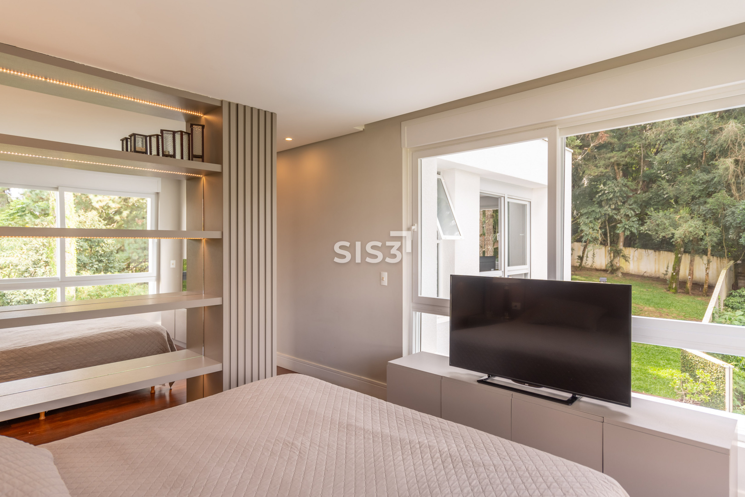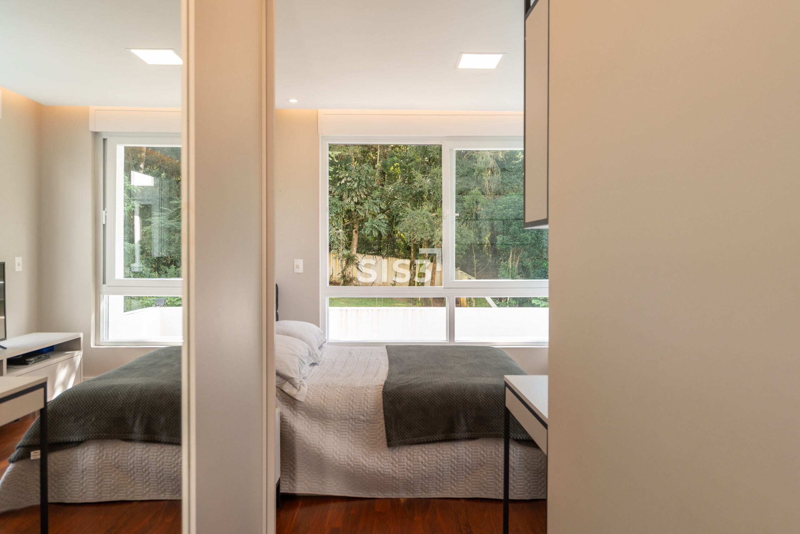 No segundo pavimento são 4 suítes, com persianas automatizadas, armários em marcenaria, uma sala íntima super acolhedora e ar condicionado presente em todos ambientes. Aqui o destaque é a vista de todos os cômodos para muito verde.