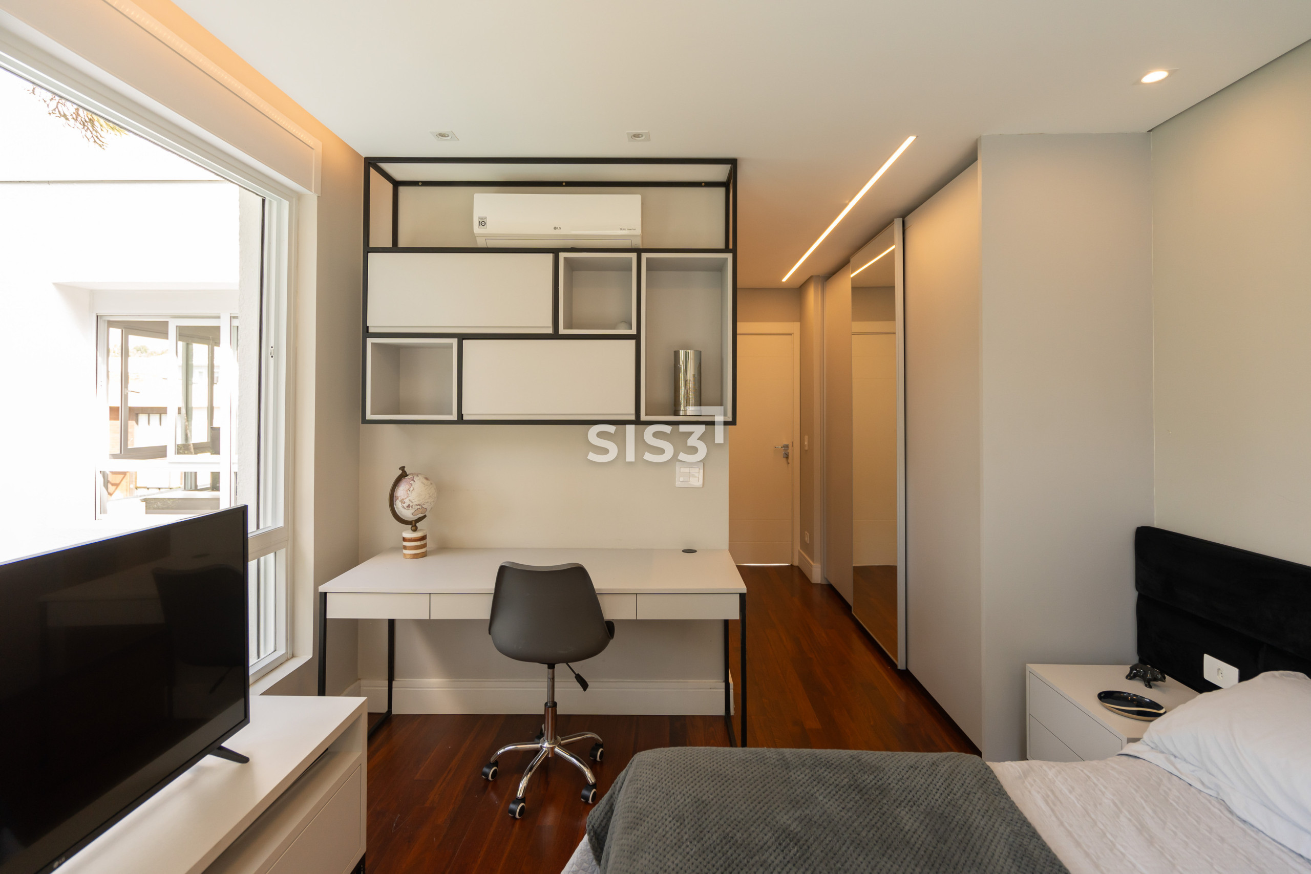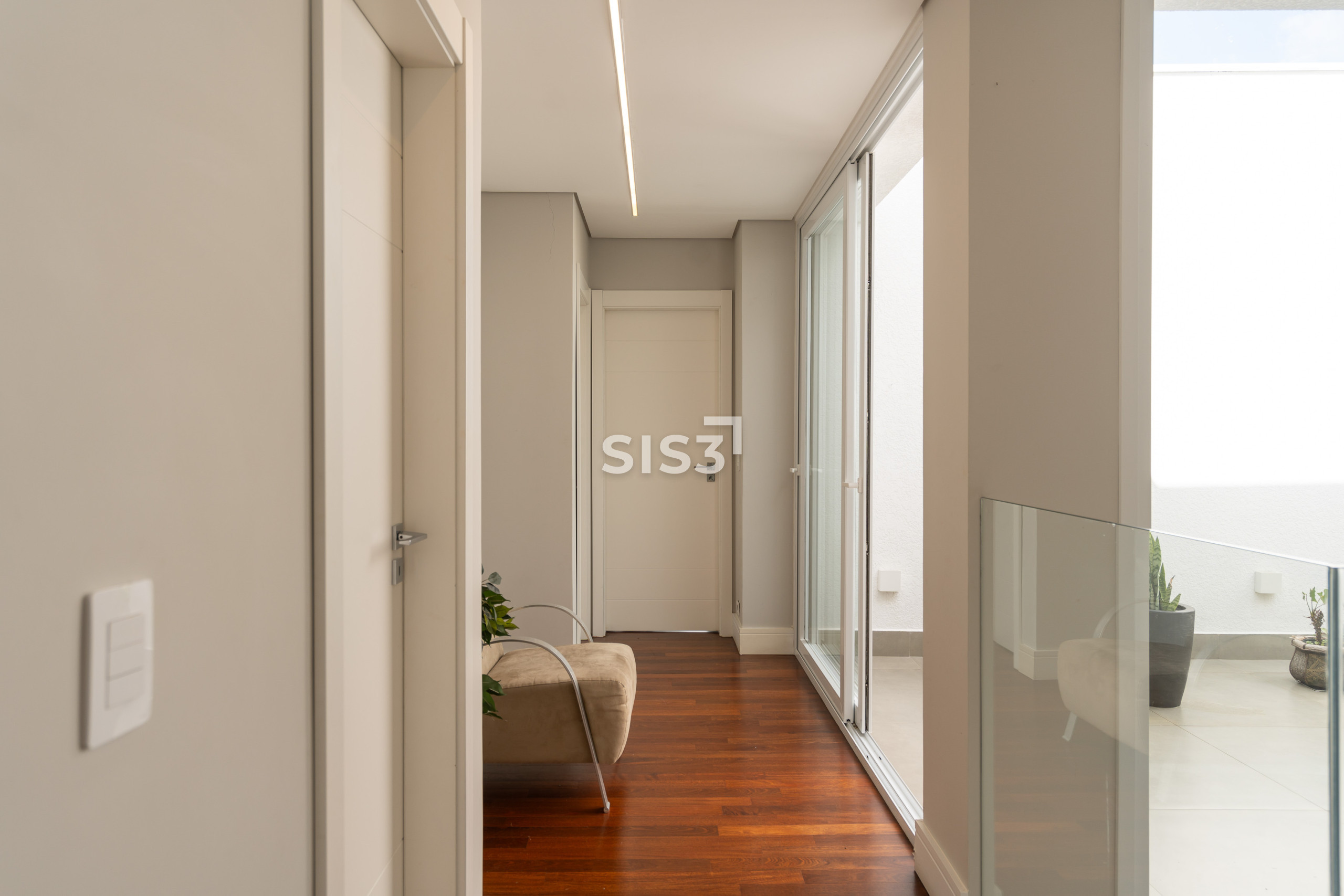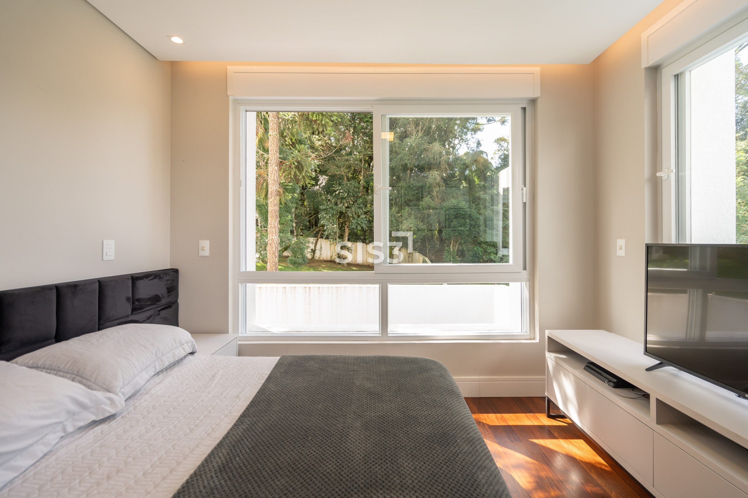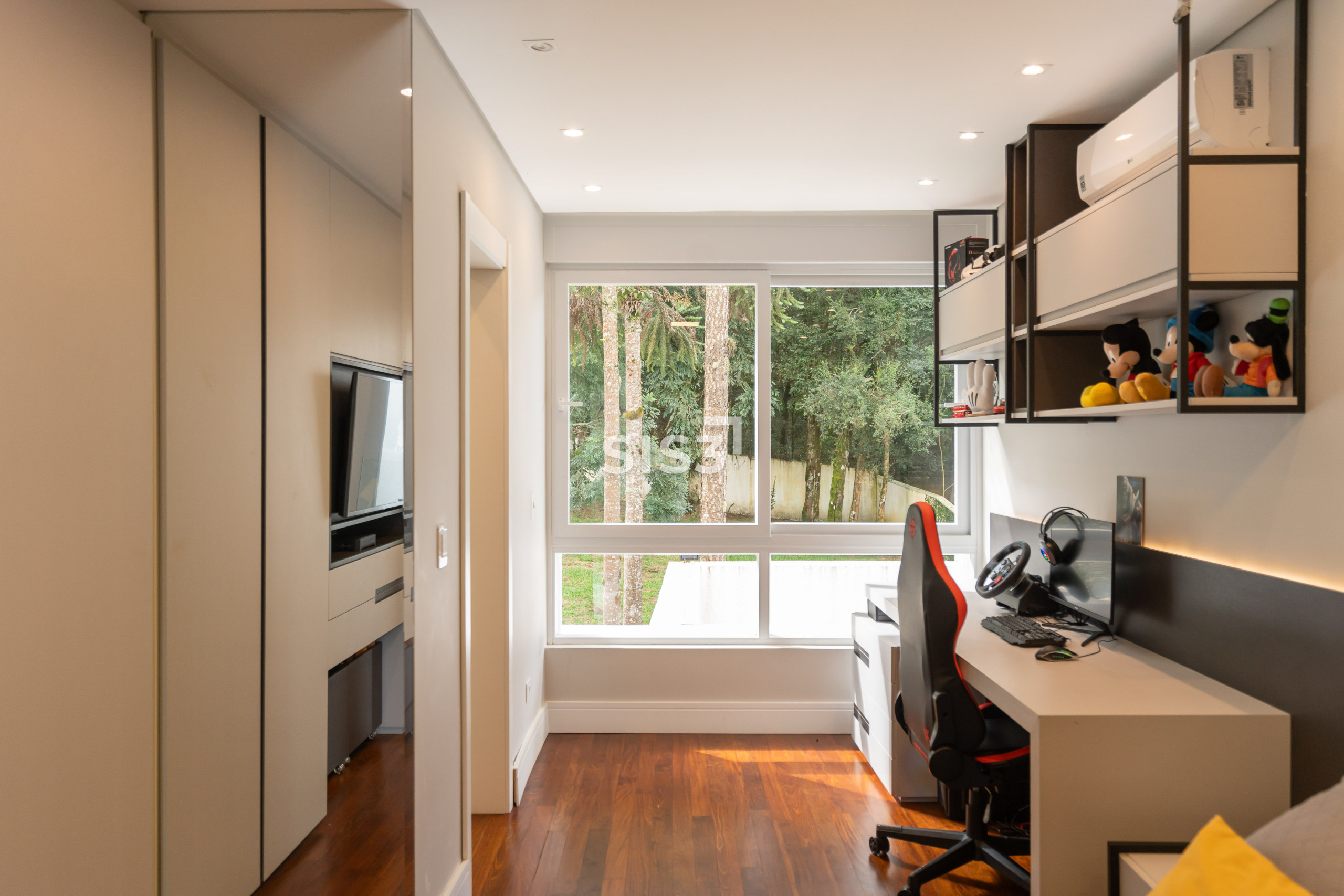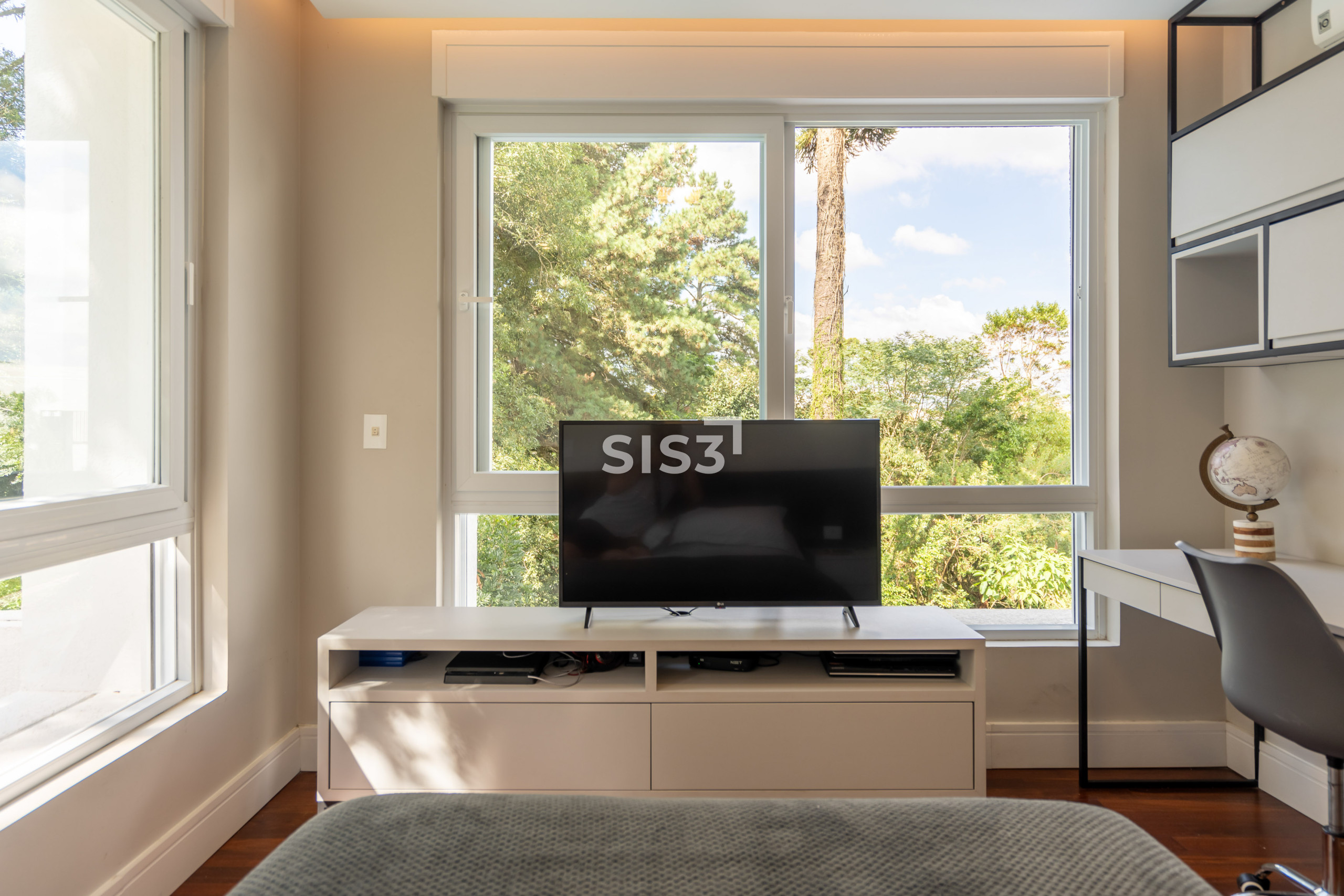 No segundo pavimento são 4 suítes, com persianas automatizadas, armários em marcenaria, uma sala íntima super acolhedora e ar condicionado presente em todos ambientes. Aqui o destaque é a vista de todos os cômodos para muito verde.