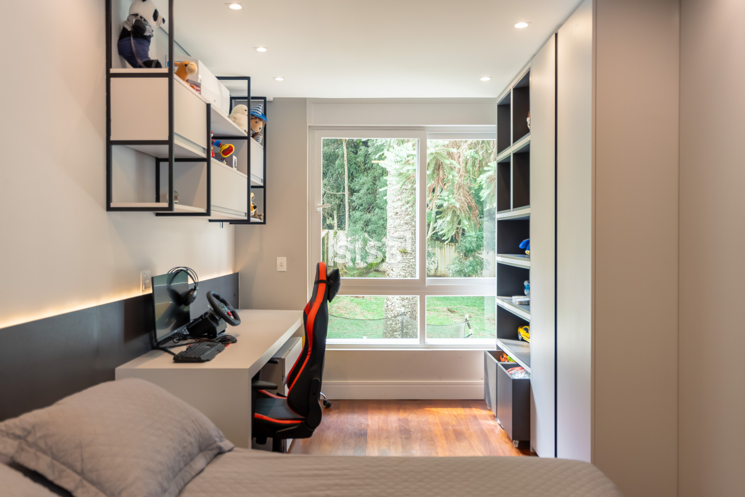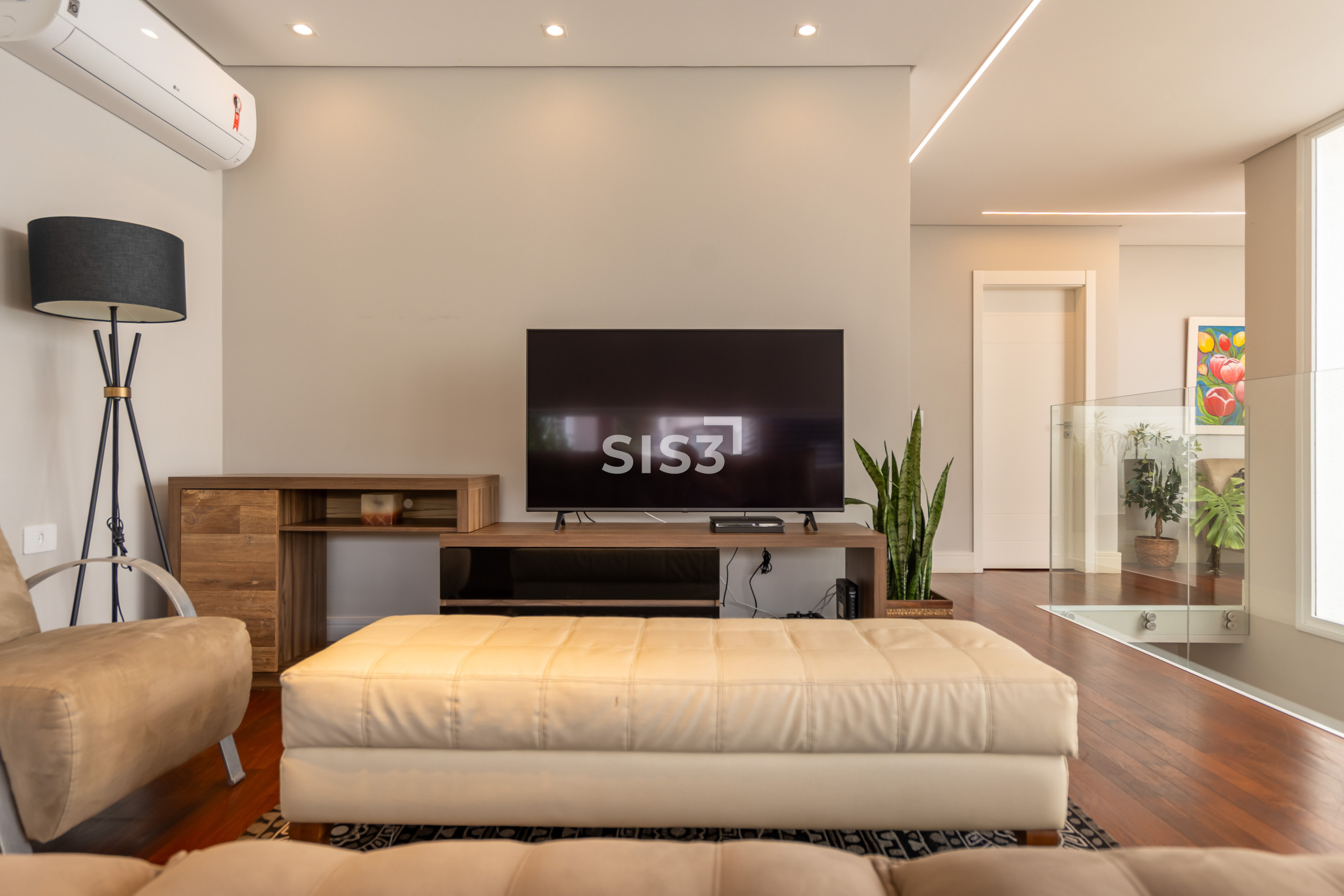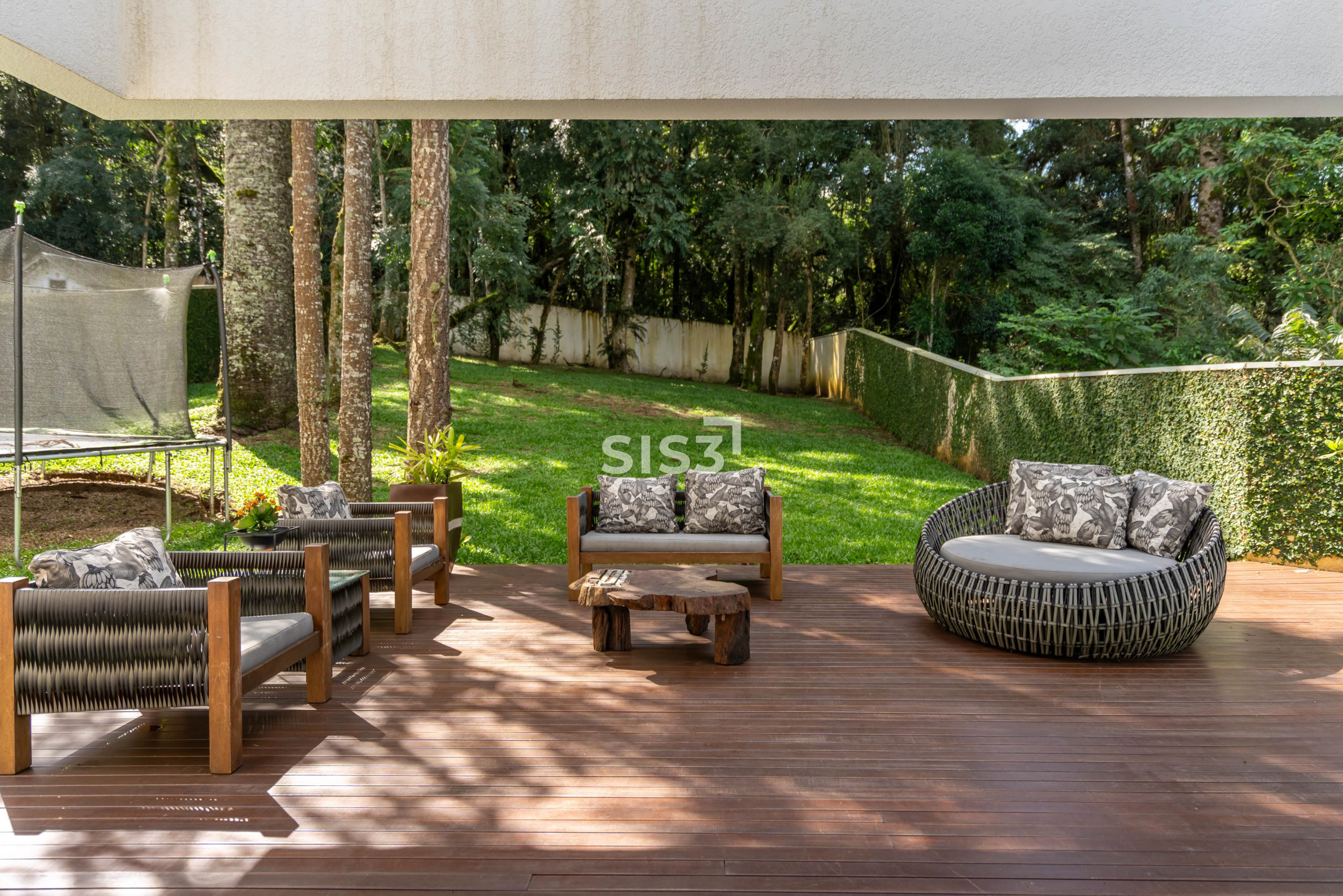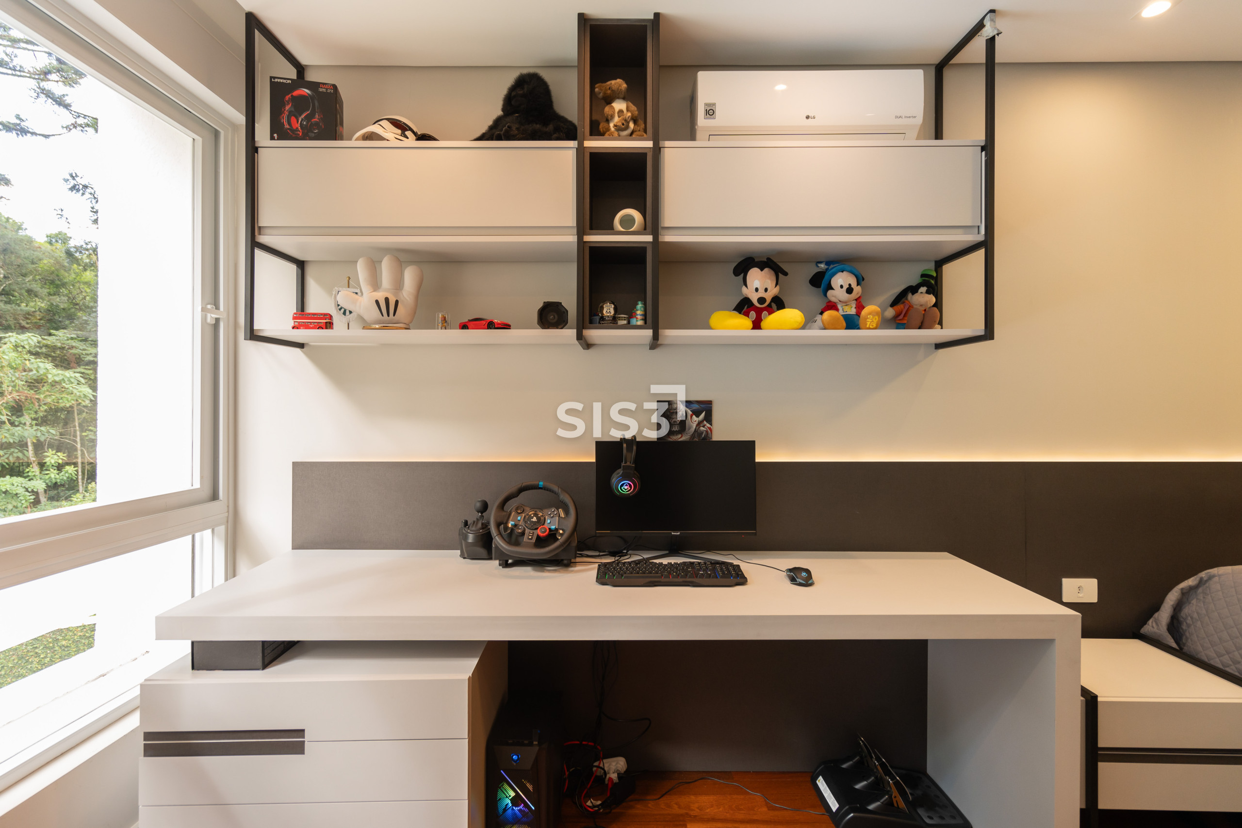No segundo pavimento são 4 suítes, com persianas automatizadas, armários em marcenaria, uma sala íntima super acolhedora e ar condicionado presente em todos ambientes. Aqui o destaque é a vista de todos os cômodos para muito verde.